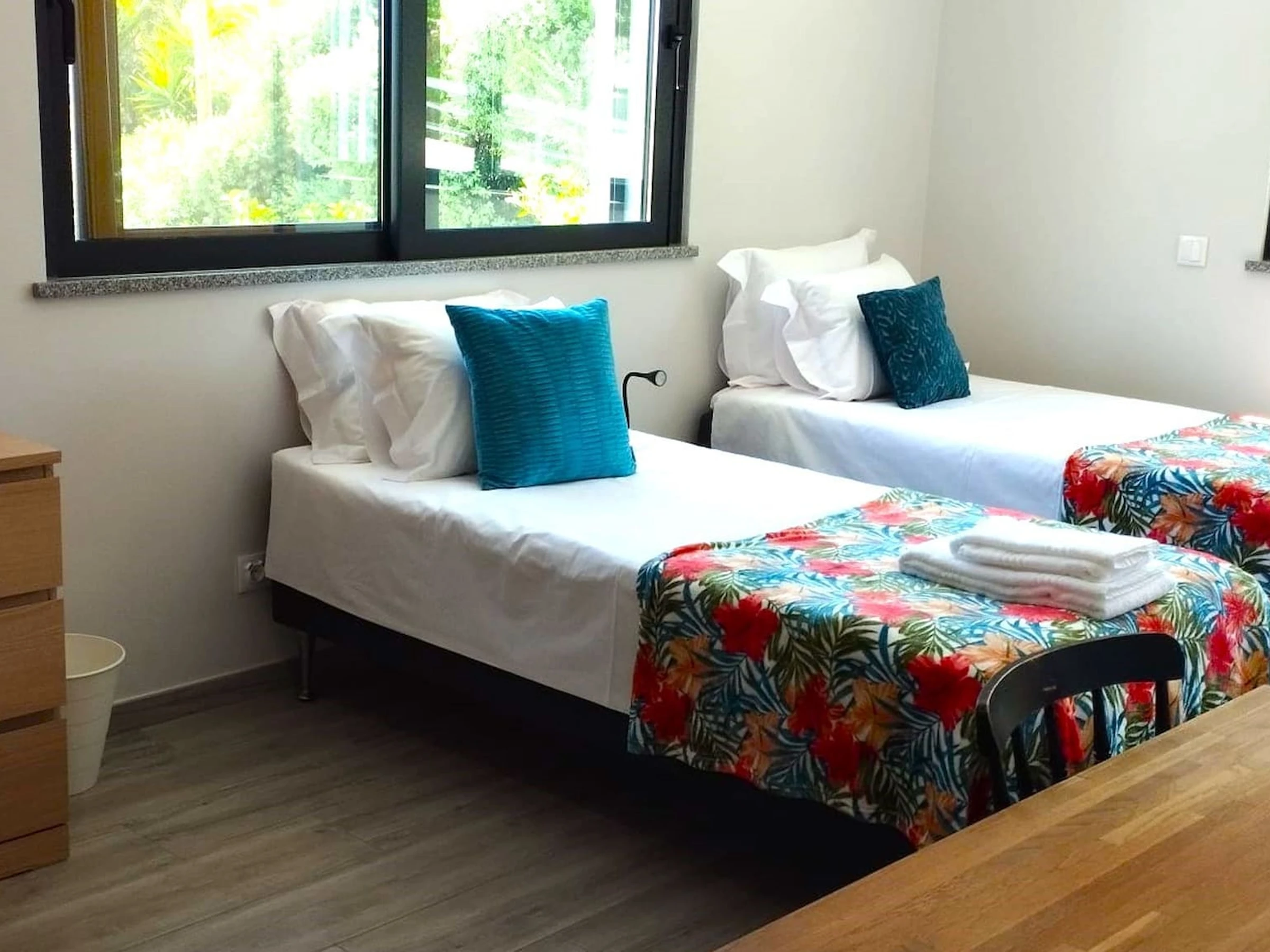 Chambre : Continuant au rez-de-chaussée, vous trouverez une chambre d'amis soigneusement conçue pour ceux qui préfèrent éviter les escaliers. Cette chambre dispose de deux lits simples confortables et de toilettes adjacentes pour plus de commodité.