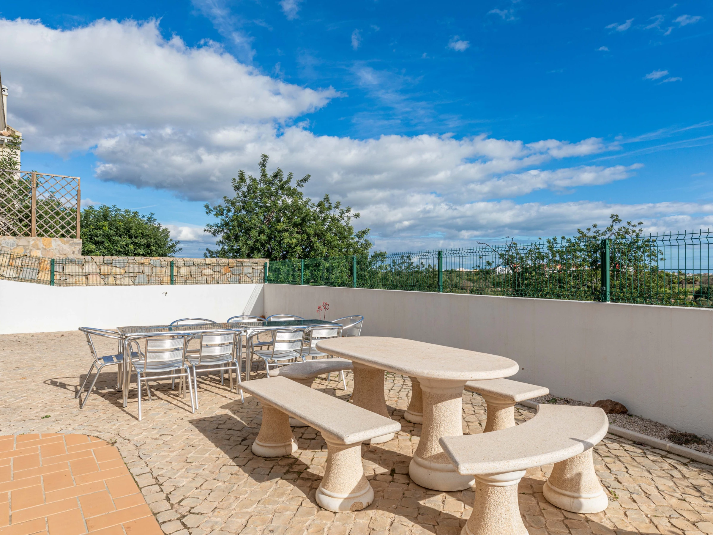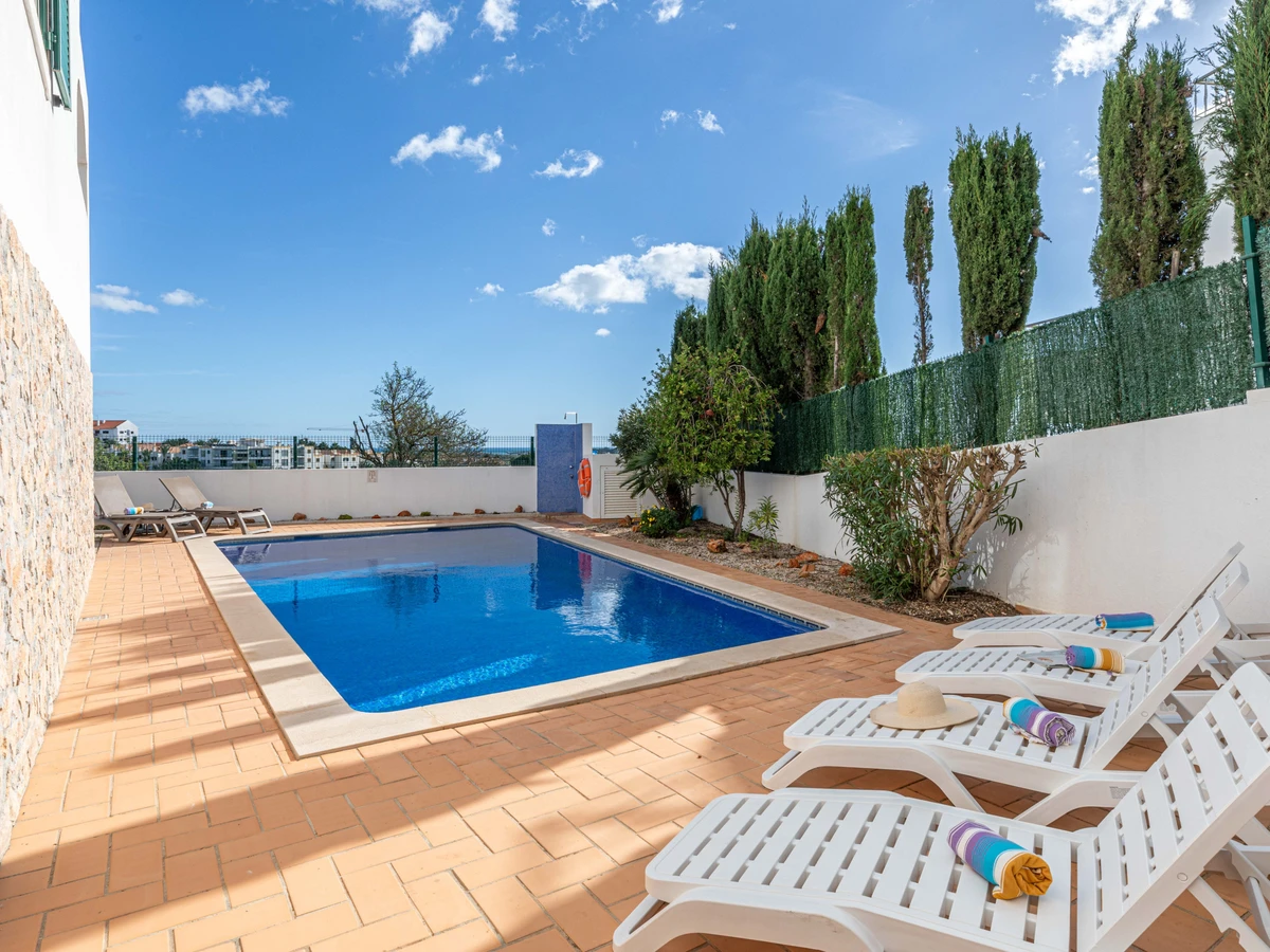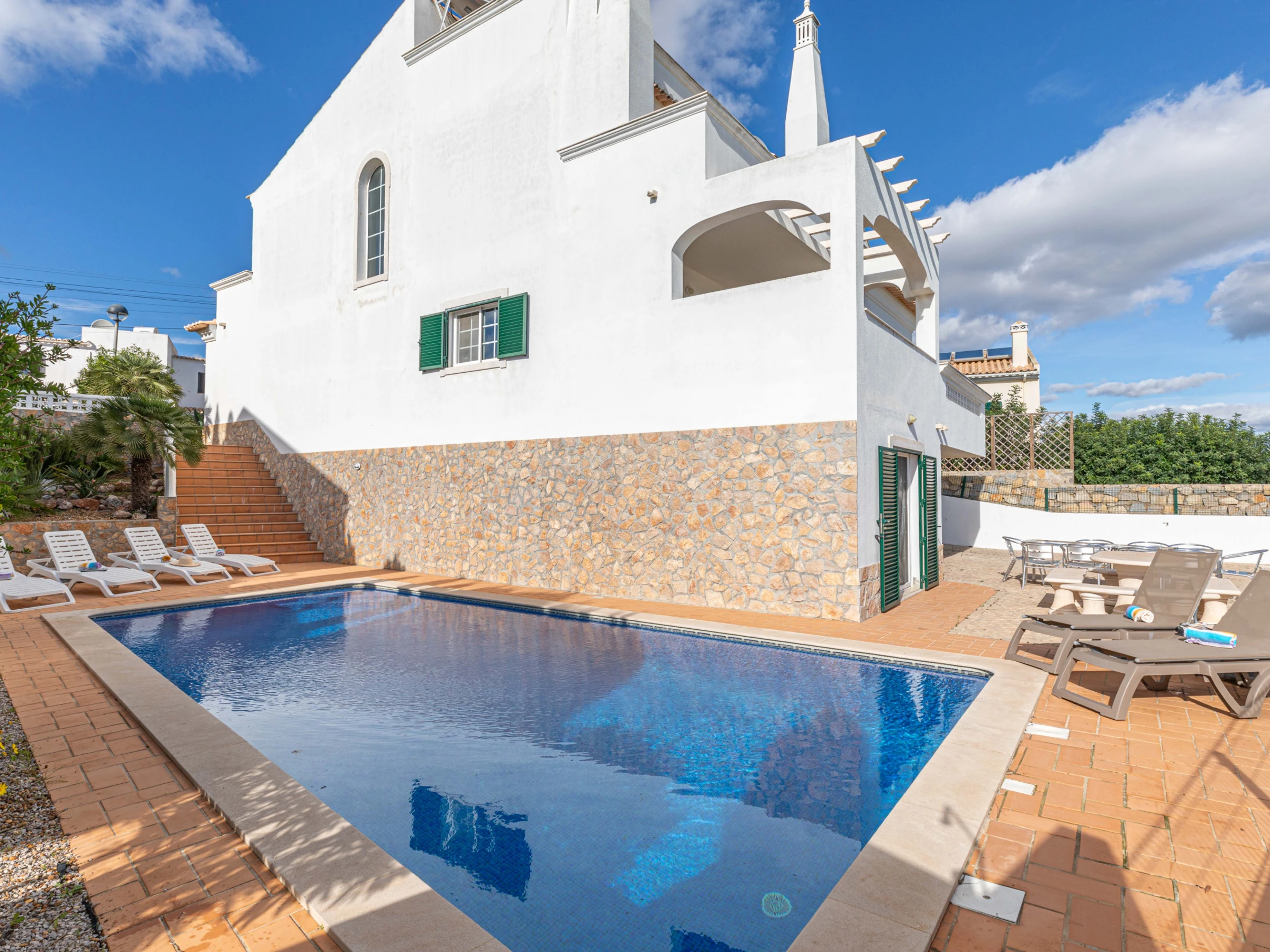 REZ-DE-CHAUSSÉE INFÉRIEUR – Le rez-de-chaussée inférieur de la villa comprend la piscine et les terrasses. Vous pouvez soit suivre le périmètre en pente rempli de végétation verdoyante, soit emprunter les escaliers depuis la terrasse de la cuisine, selon votre préférence. L'ambiance au bord de la piscine est rehaussée par le paysage environnant bordé d'arbres et agrémenté d'un charmant pavage en calçada, offrant un espace totalement clos et sécurisé pour les enfants. Une sélection de transats et de chaises est disponible pour votre détente, tandis qu'une table et des chaises robustes sur socle, réalisées en pierre massive, sont parfaitement placées pour profiter de collations et de boissons au bord de la piscine, ajoutant au charme et à la commodité de cette zone.