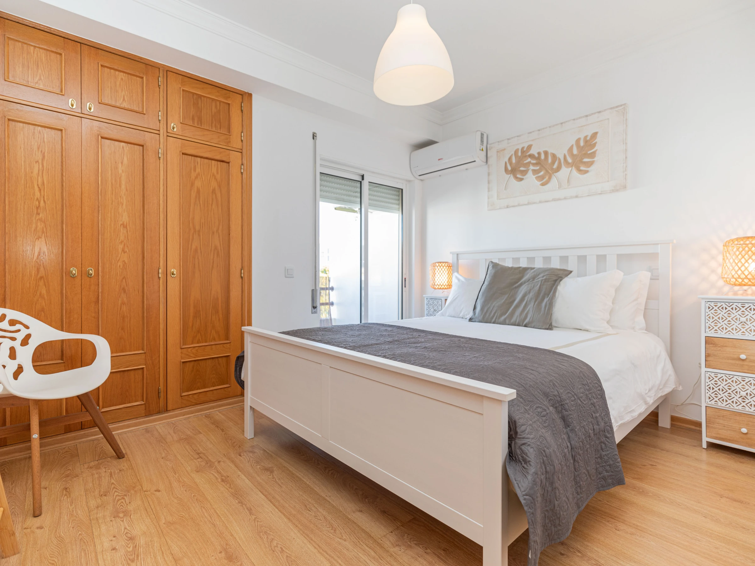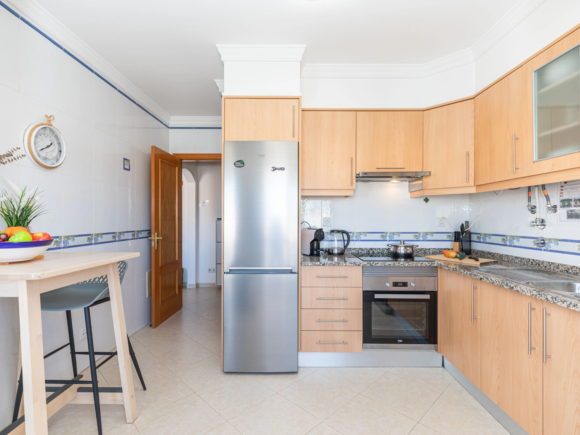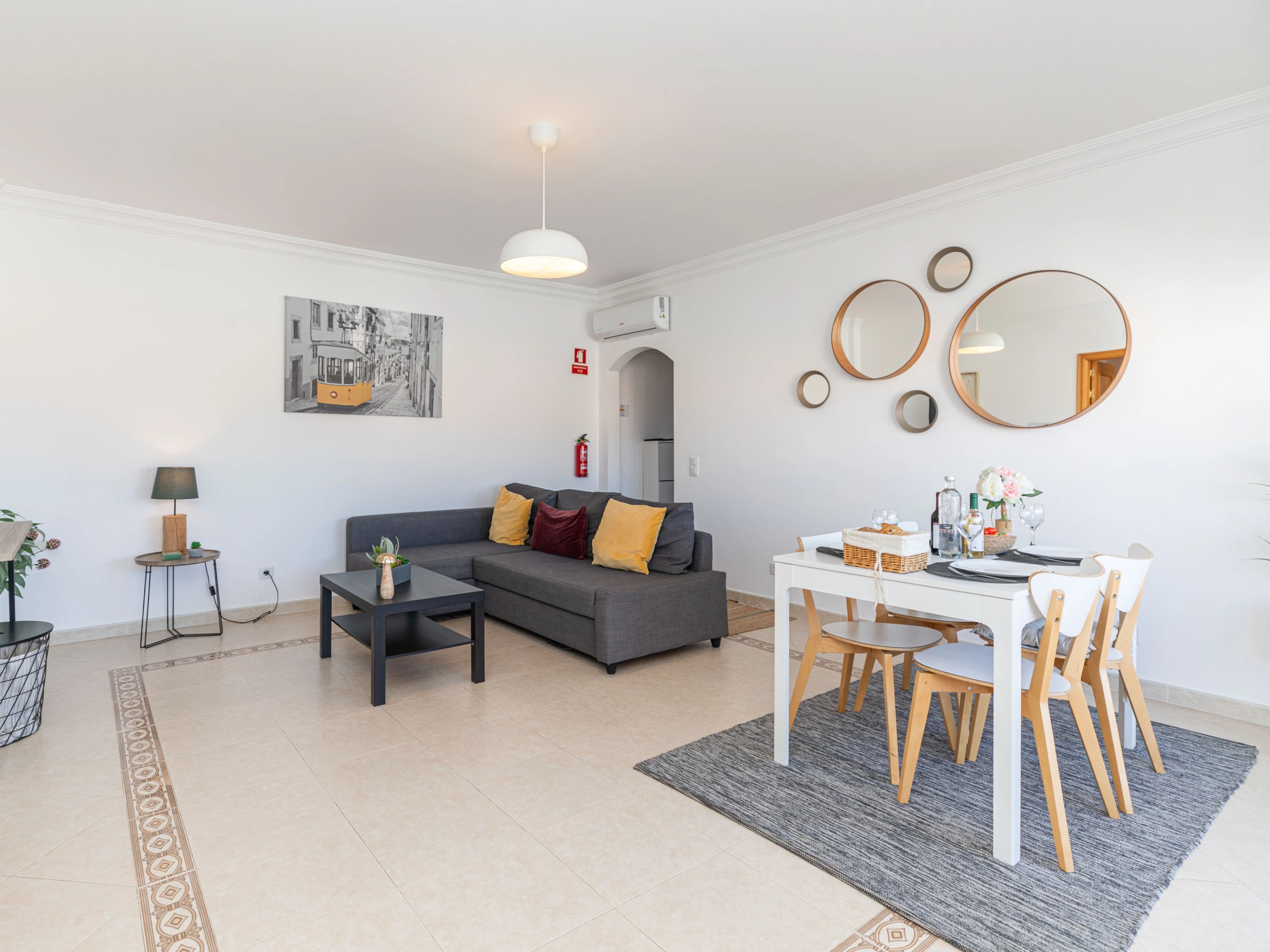 Situé au deuxième étage d'un immeuble moderne avec accès par ascenseur, l'appartement orienté à l'est bénéficie d'un agréable ensoleillement pendant la majeure partie de la journée. Depuis le hall d'entrée, la cuisine se trouve à gauche, entièrement équipée et parfaite pour la préparation de repas à domicile si vous le souhaitez. Avec une table haute, c'est l'endroit idéal pour prendre une collation rapide. Sinon, vous pouvez sortir sur le balcon, qui court sur toute la longueur de l'appartement, et avec sa vue sur la rue bordée d'arbres et sur les montagnes, c'est l'endroit idéal pour profiter d'un petit-déjeuner tranquille ou de quelques rafraîchissements en fin de journée. Le point focal de l'appartement est le salon avec ses meubles simples mais réfléchis. Un canapé confortable parfait pour regarder la télévision, ou un fauteuil robuste pour se détendre et lire. Une table à manger en placage blanc adjacent complète parfaitement la pièce, offrant un espace pour des repas plus formels. Nichées discrètement à l'arrière de l'appartement, 2 chambres, une king size et une twin, partagent une salle de bain avec baignoire et douche. À proximité, plusieurs cafés accueillants et 1 restaurant sont disponibles si vous ne souhaitez pas trop vous éloigner le soir.