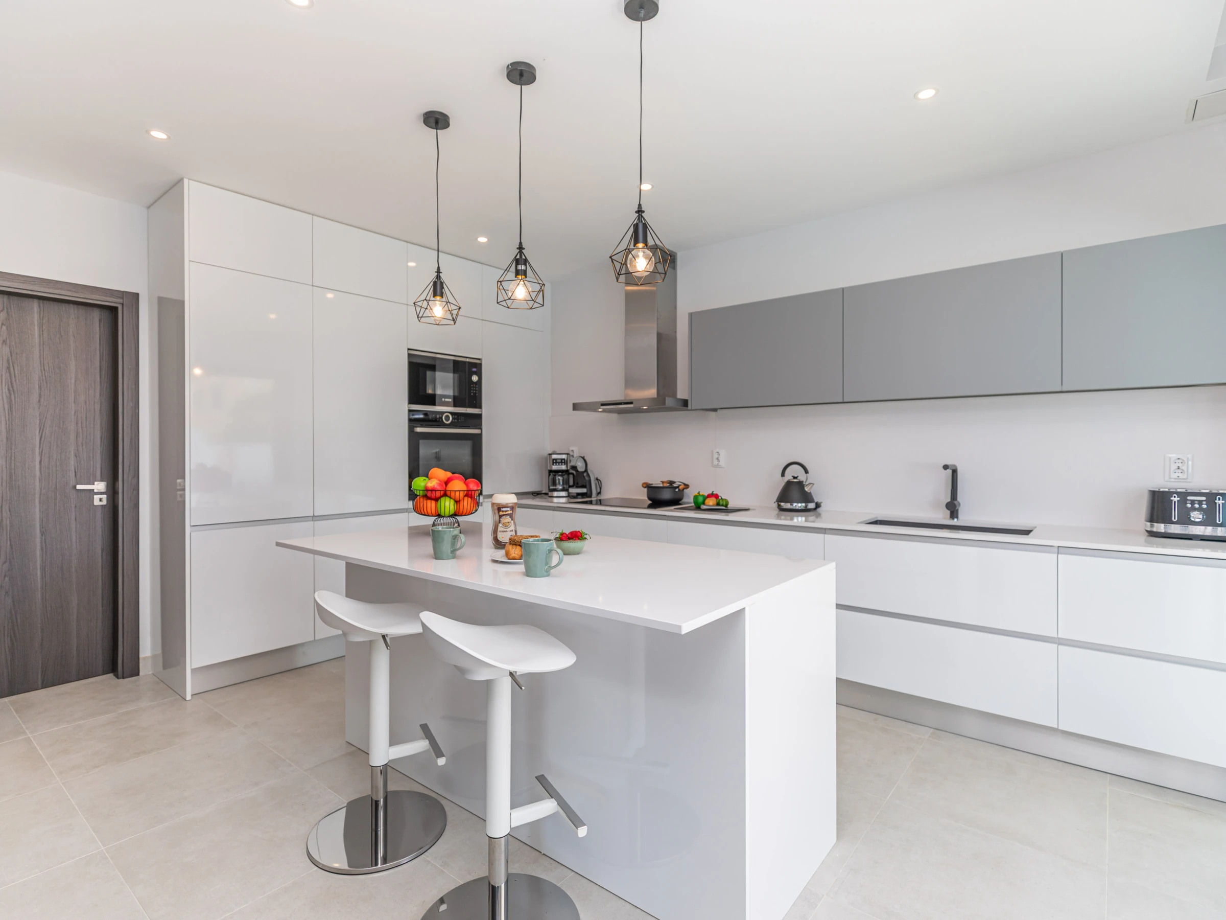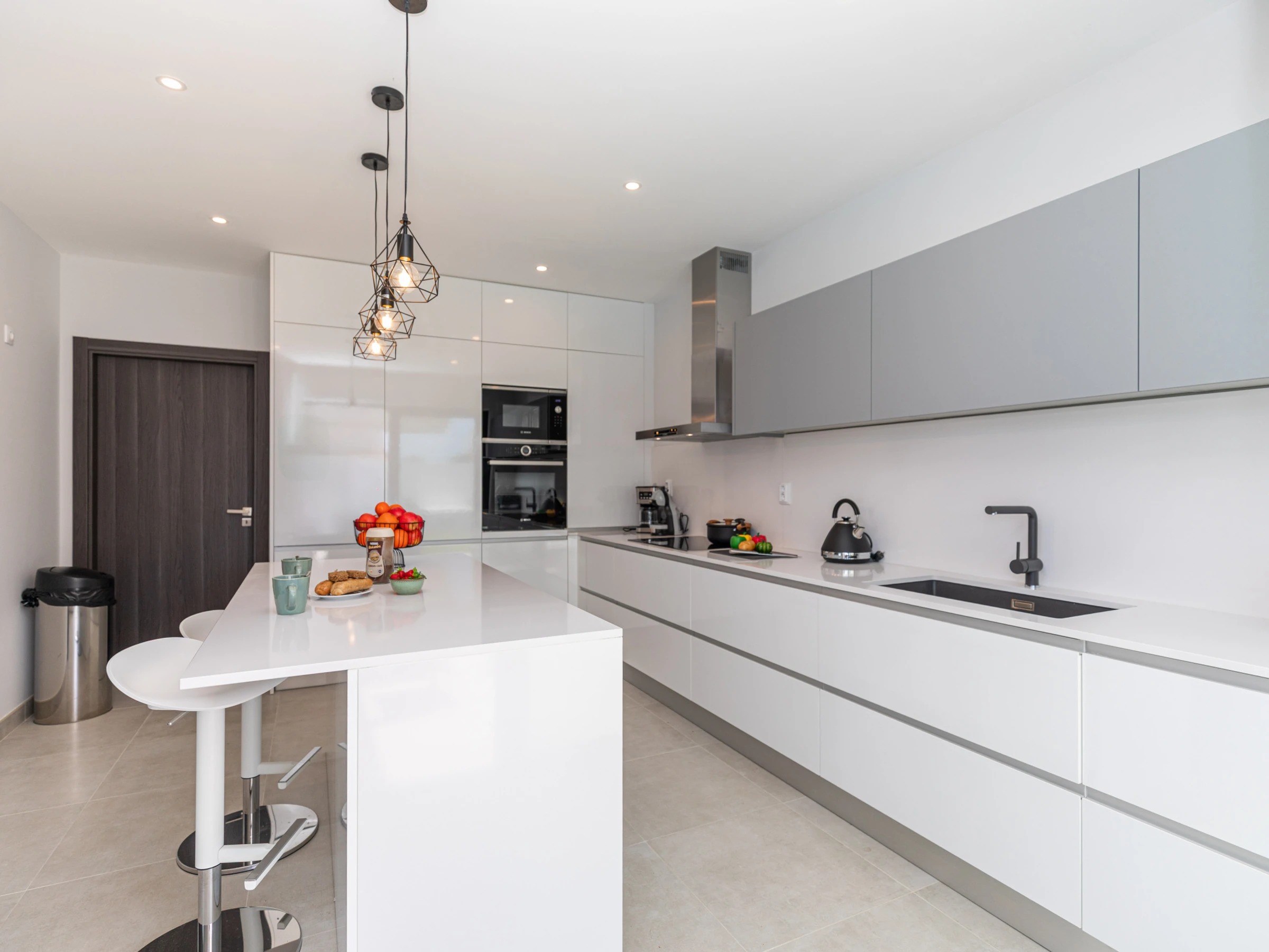 La salle à manger élégante est idéale pour recevoir des invités à la maison, avec une grande table parfaite pour réunir famille ou amis. Juste au-delà, la cuisine moderne et entièrement équipée est astucieusement nichée à l'arrière et conçue à la fois pour le style et la fonctionnalité. Un îlot avec des tabourets de bar crée un endroit convivial pour profiter d'un verre ou discuter avec le chef. Des appareils intégrés, des ustensiles de haute qualité et une buanderie bien aménagée avec machine à laver et étendoir ajoutent commodité et confort.