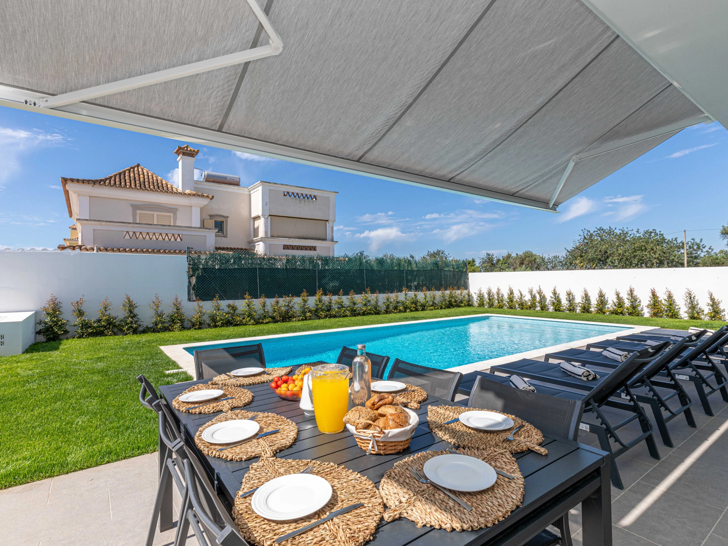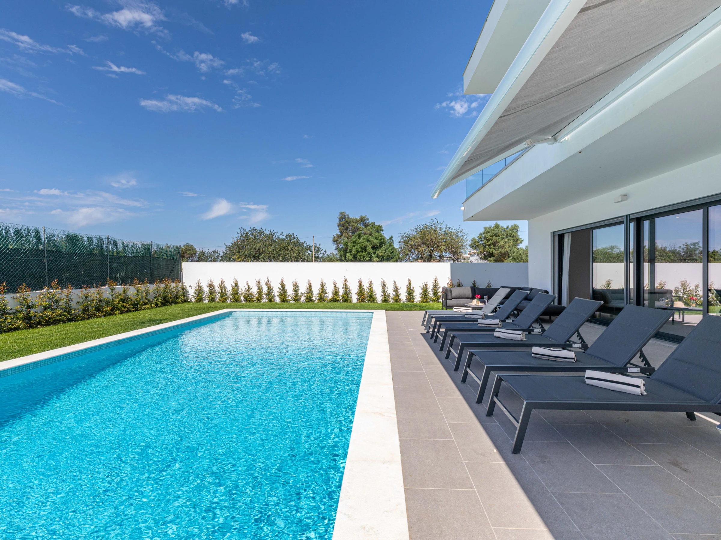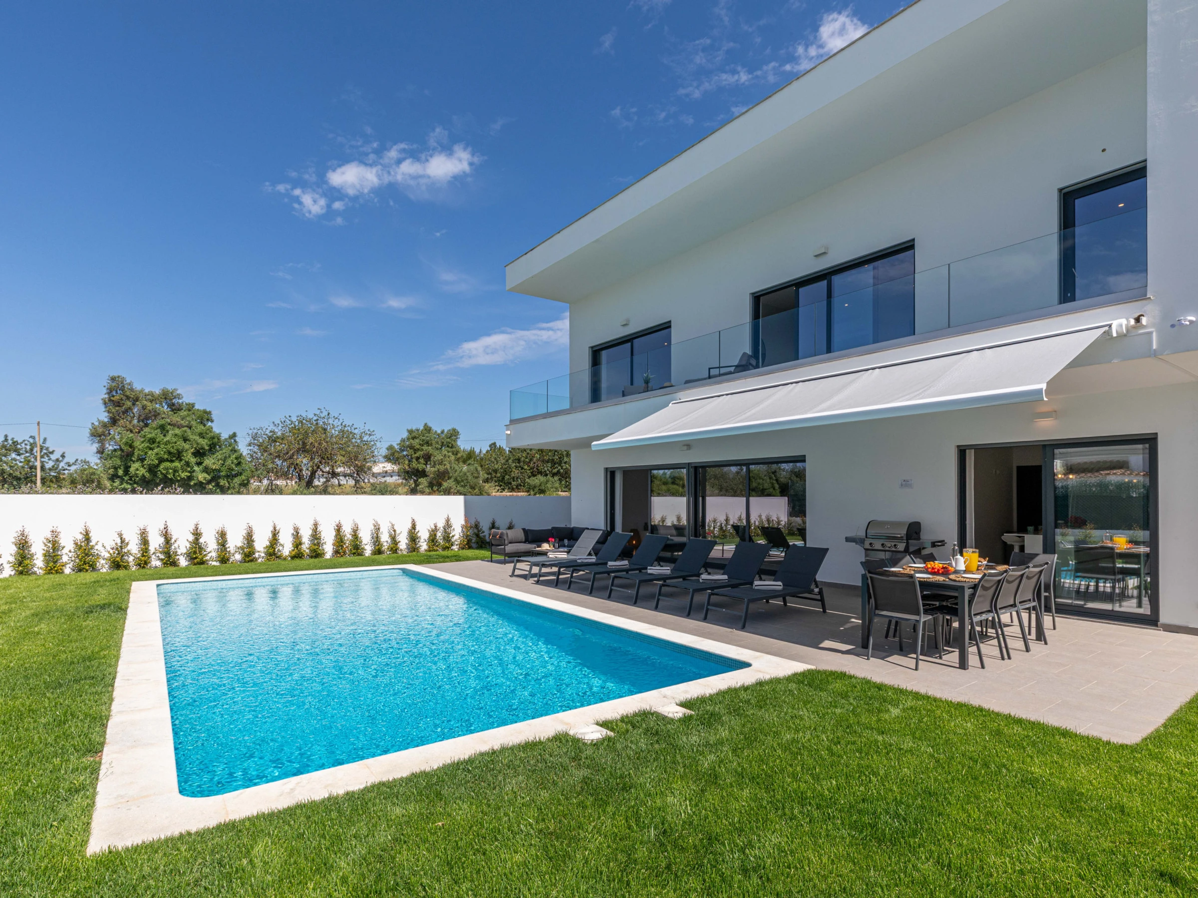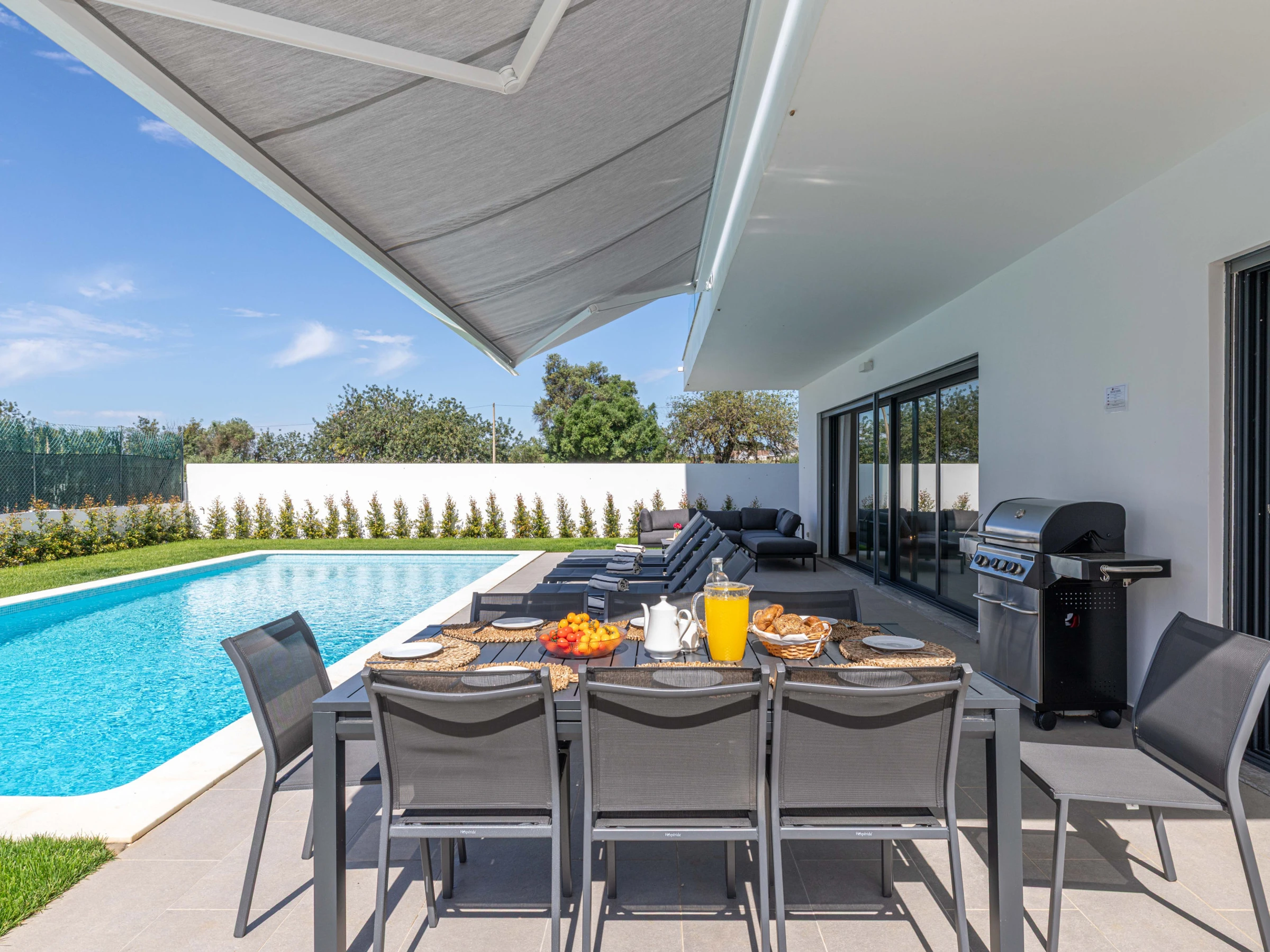À l'arrière, une piscine privée scintillante de 10x5 m est intégrée dans une pelouse verdoyante, avec une terrasse et de nombreux bains de soleil accompagnés d'un ensemble de canapés extérieurs luxueux - idéal pour profiter du soleil de l'Algarve. Un généreux espace repas en plein air, doté d'un auvent rétractable pour l'ombre, est parfait pour de longs déjeuners ou des dîners détendus sous les étoiles.