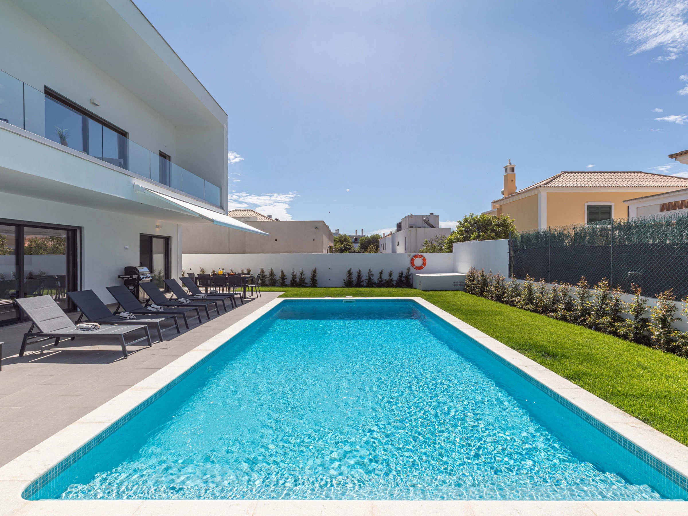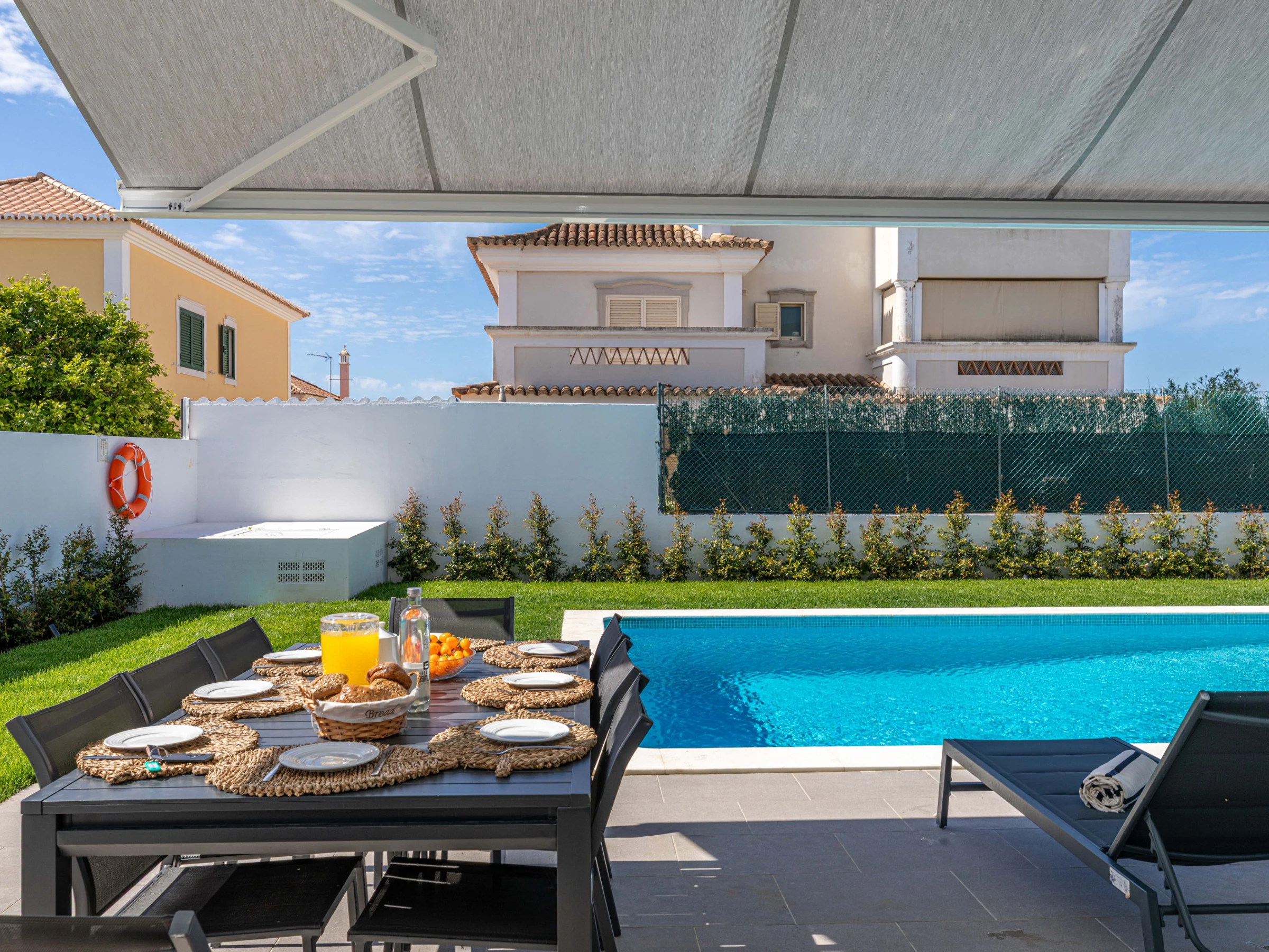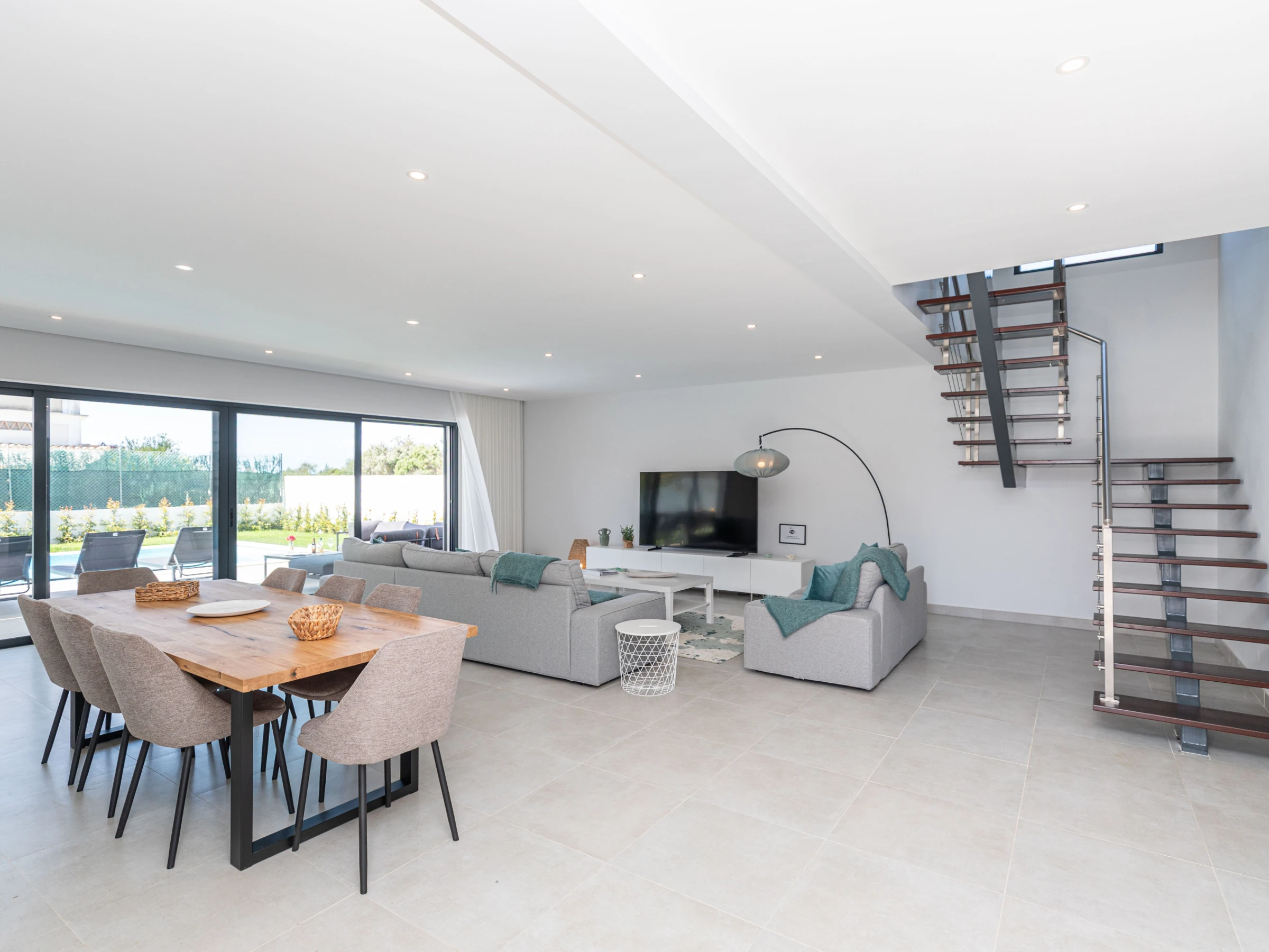 À l'arrière, une piscine privée scintillante de 10x5 m est intégrée dans une pelouse verdoyante, avec une terrasse et de nombreux bains de soleil accompagnés d'un ensemble de canapés extérieurs luxueux - idéal pour profiter du soleil de l'Algarve. Un généreux espace repas en plein air, doté d'un auvent rétractable pour l'ombre, est parfait pour de longs déjeuners ou des dîners détendus sous les étoiles.