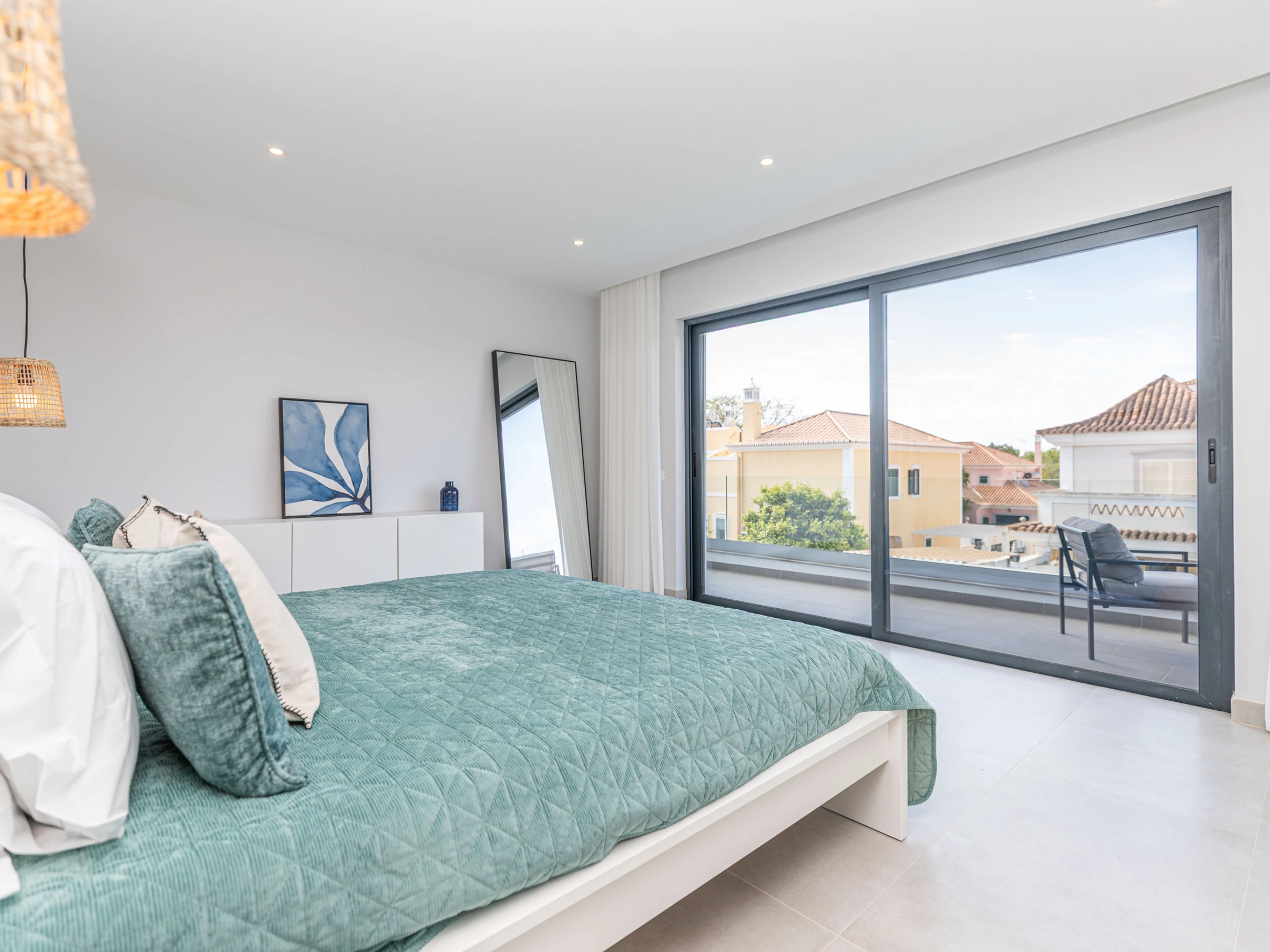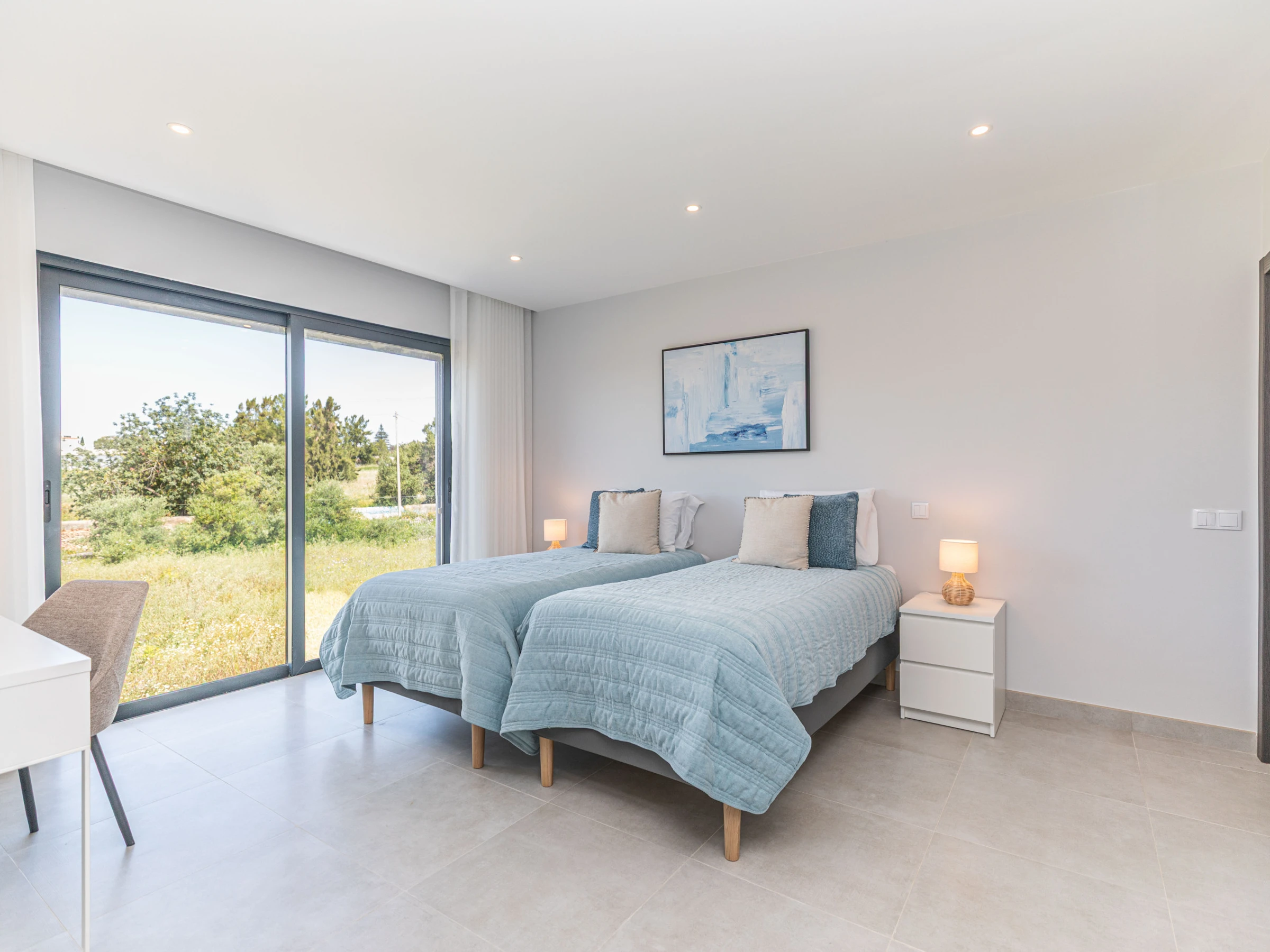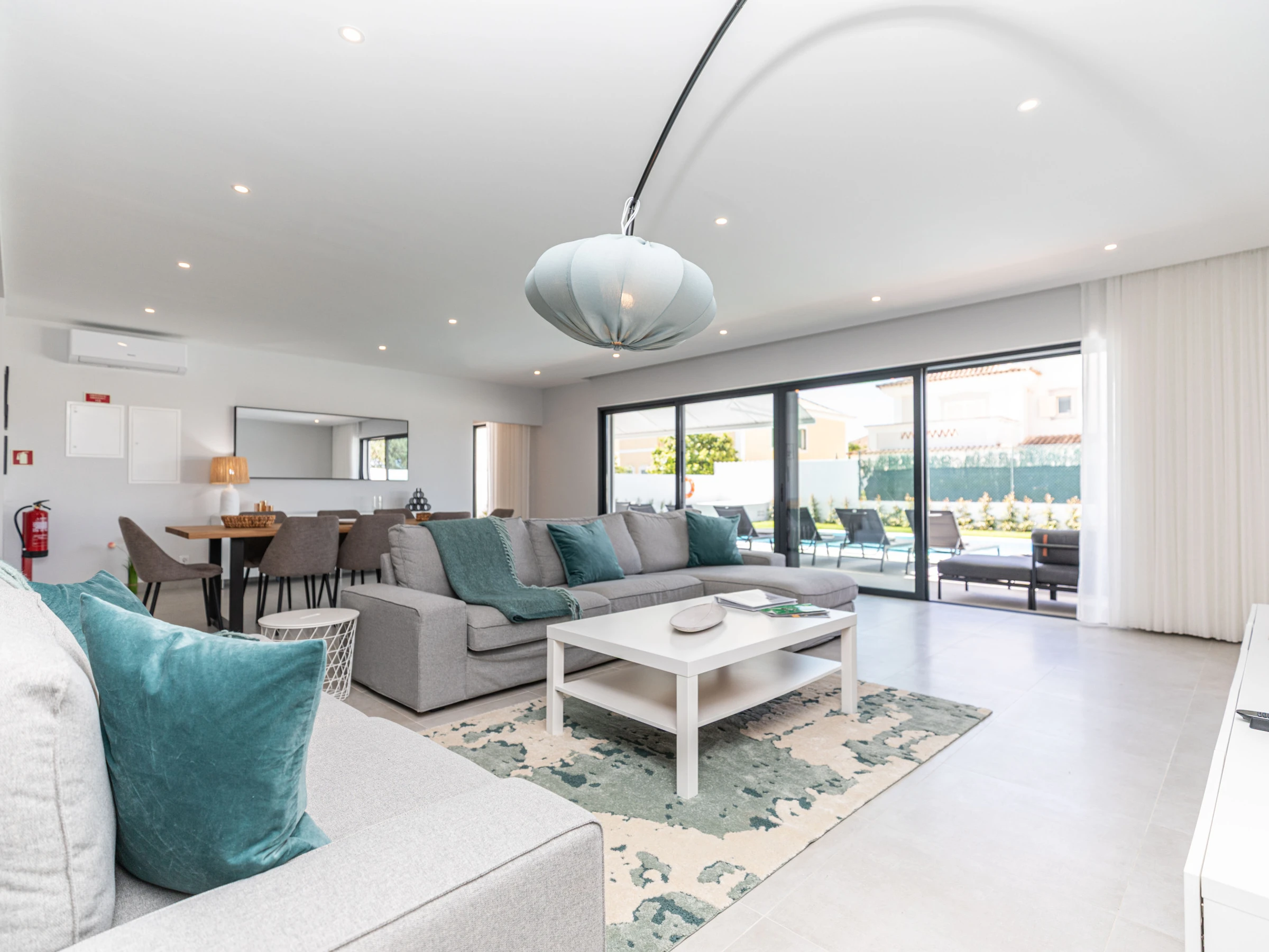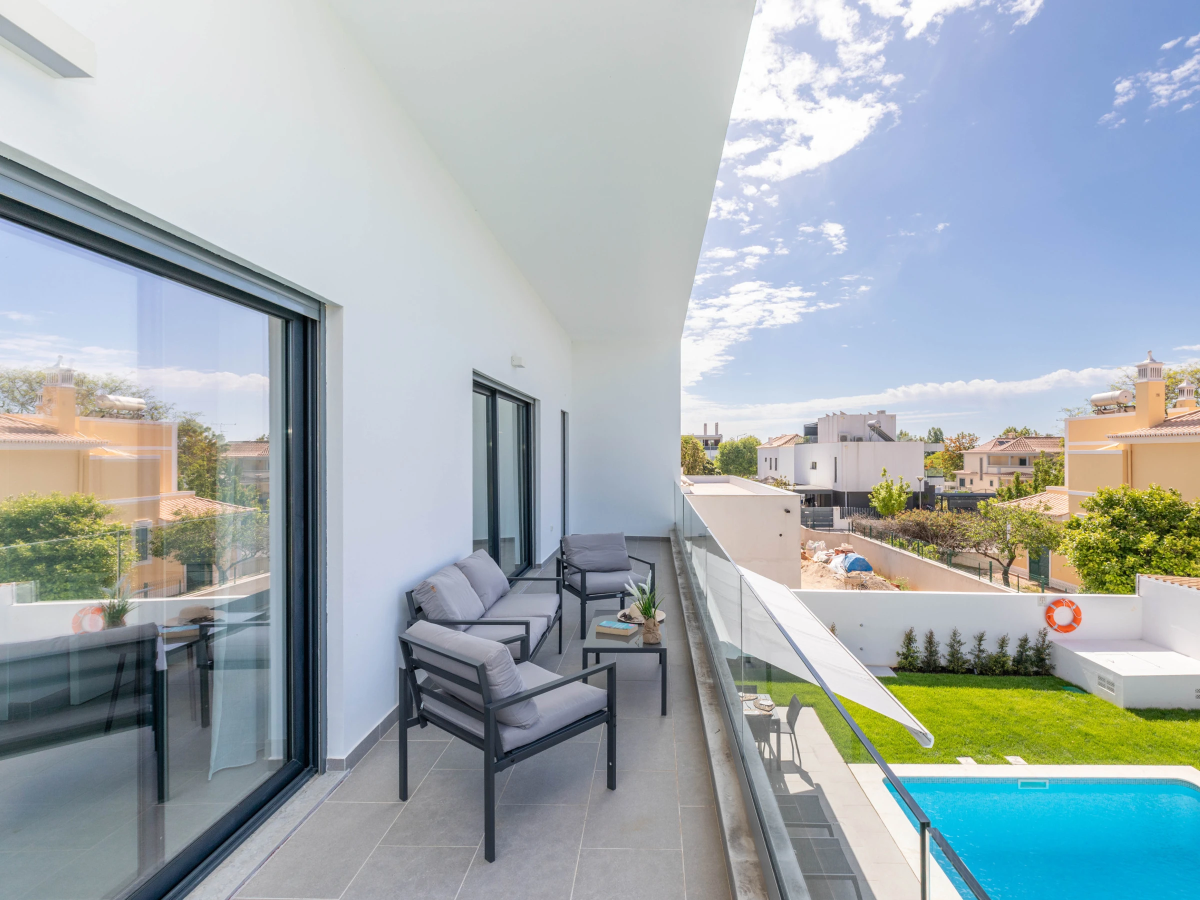 À l'arrière, une piscine privée scintillante de 10x5 m est intégrée dans une pelouse verdoyante, avec une terrasse et de nombreux bains de soleil accompagnés d'un ensemble de canapés extérieurs luxueux - idéal pour profiter du soleil de l'Algarve. Un généreux espace repas en plein air, doté d'un auvent rétractable pour l'ombre, est parfait pour de longs déjeuners ou des dîners détendus sous les étoiles.