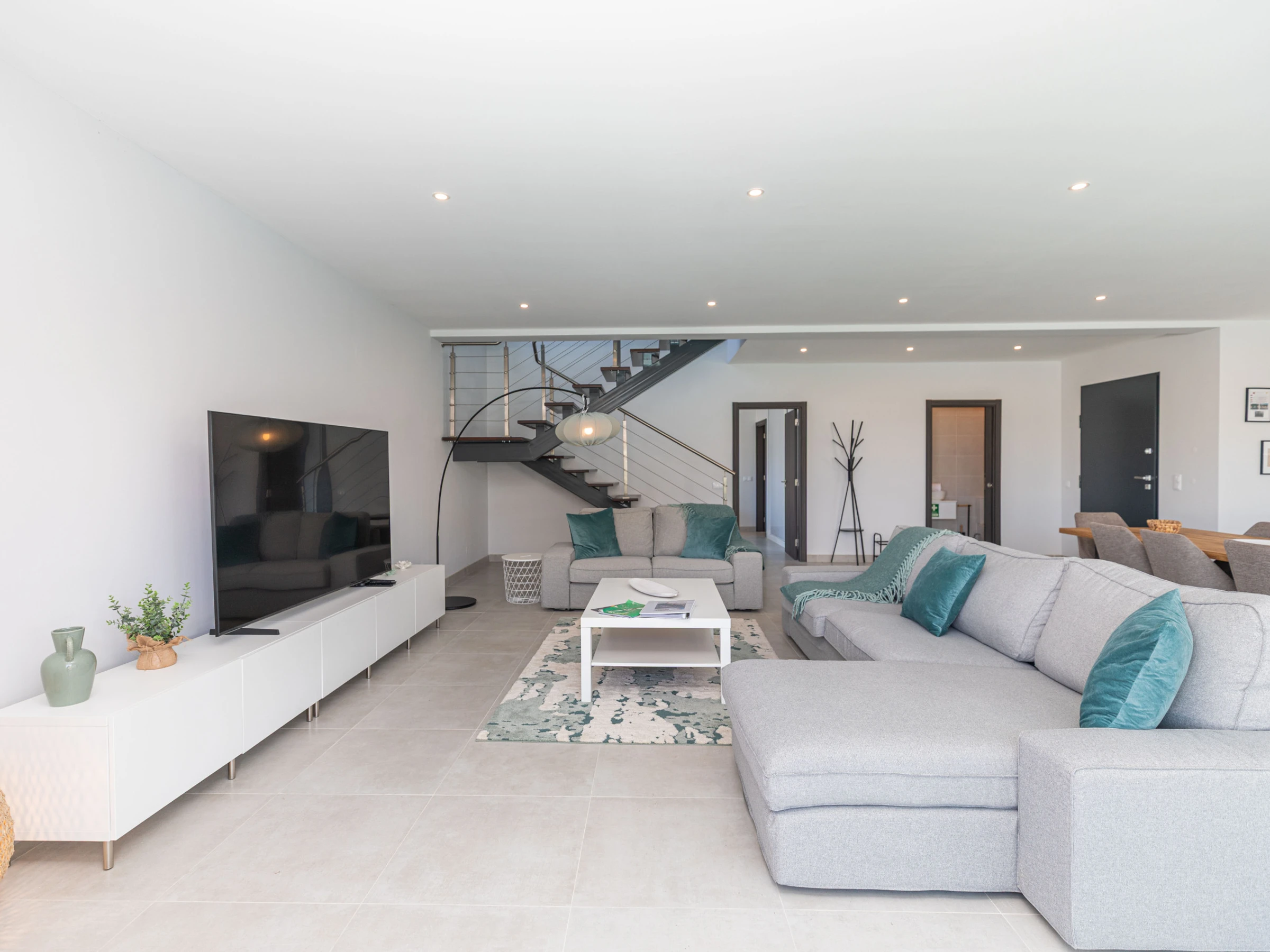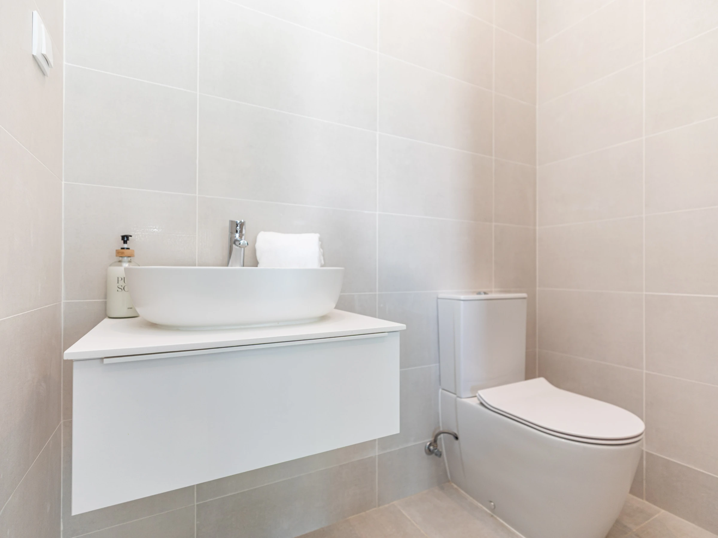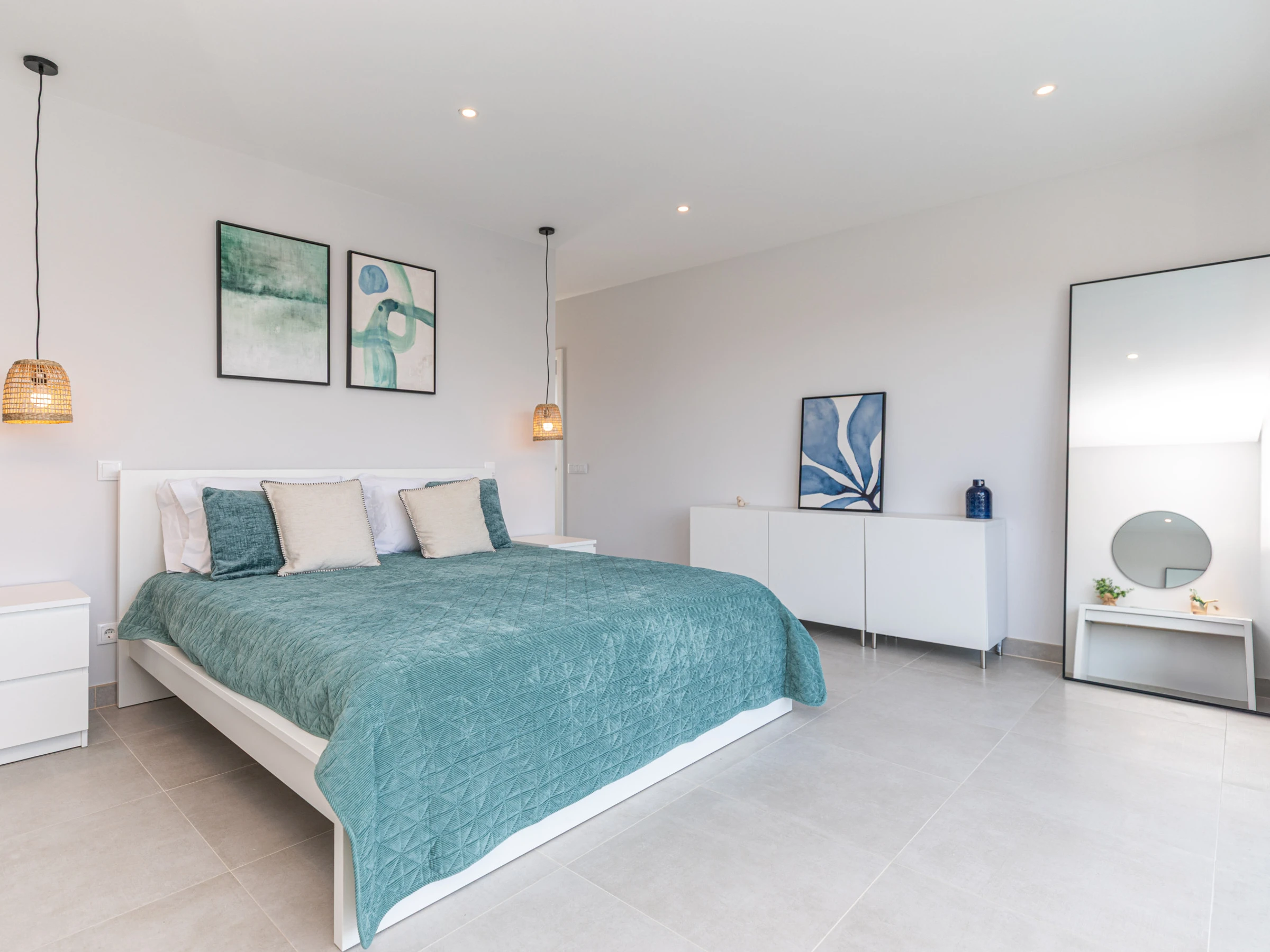Au rez-de-chaussée se trouve également une chambre spacieuse et magnifiquement meublée avec un lit king size, de grandes fenêtres, des volets électriques, des armoires intégrées, la climatisation et une salle de douche privative—parfaitement située pour les invités qui préfèrent moins d'escaliers. Un WC d'invités séparé est également disponible à ce niveau.
