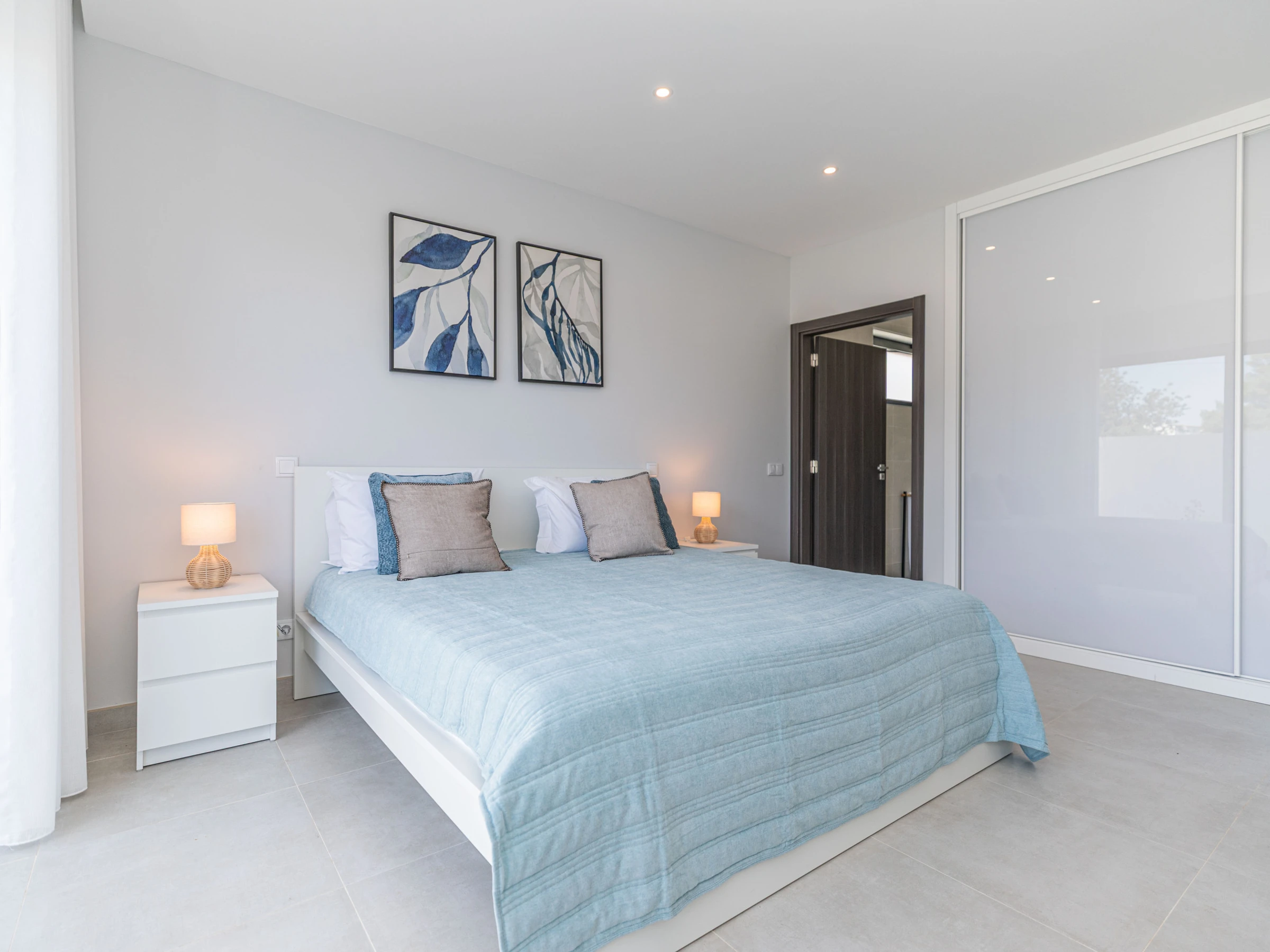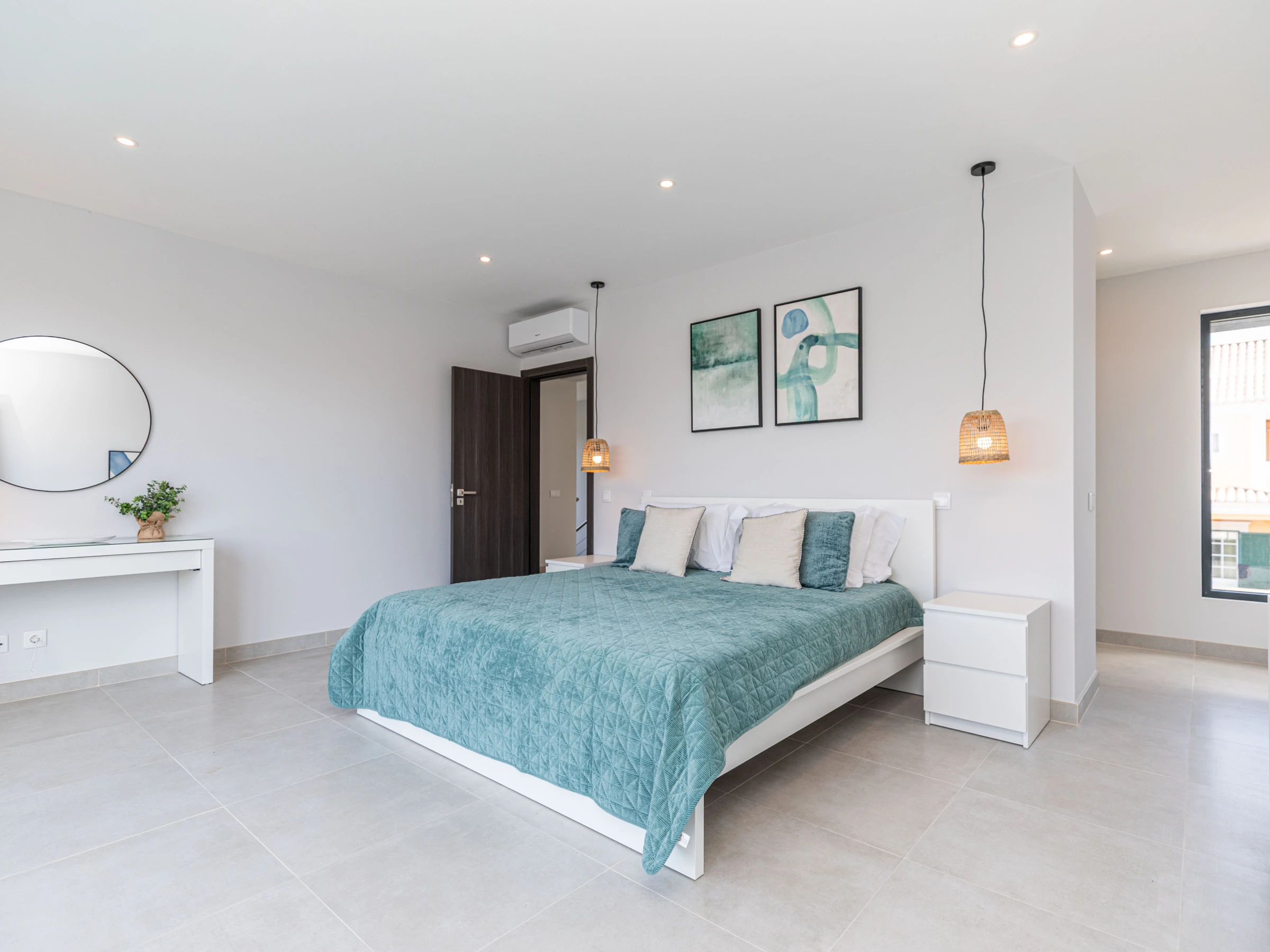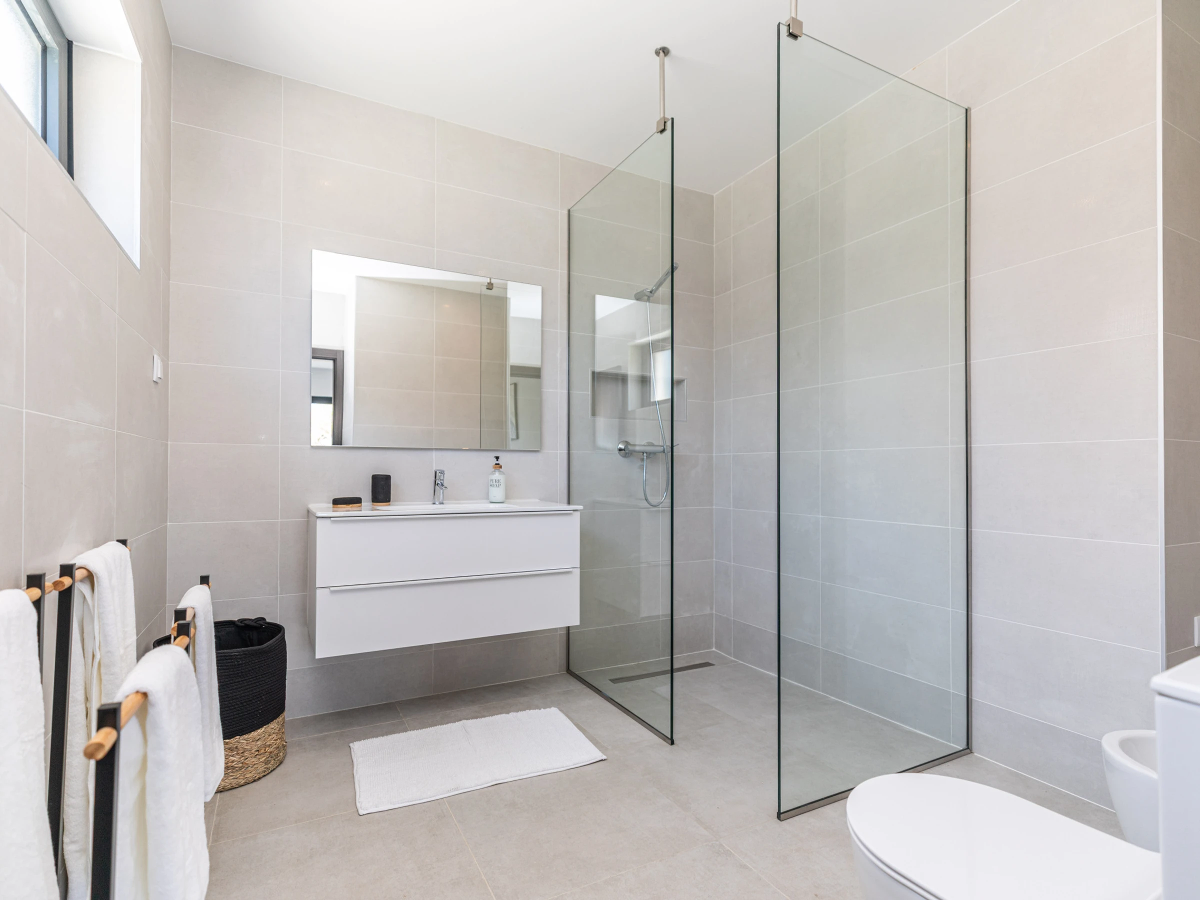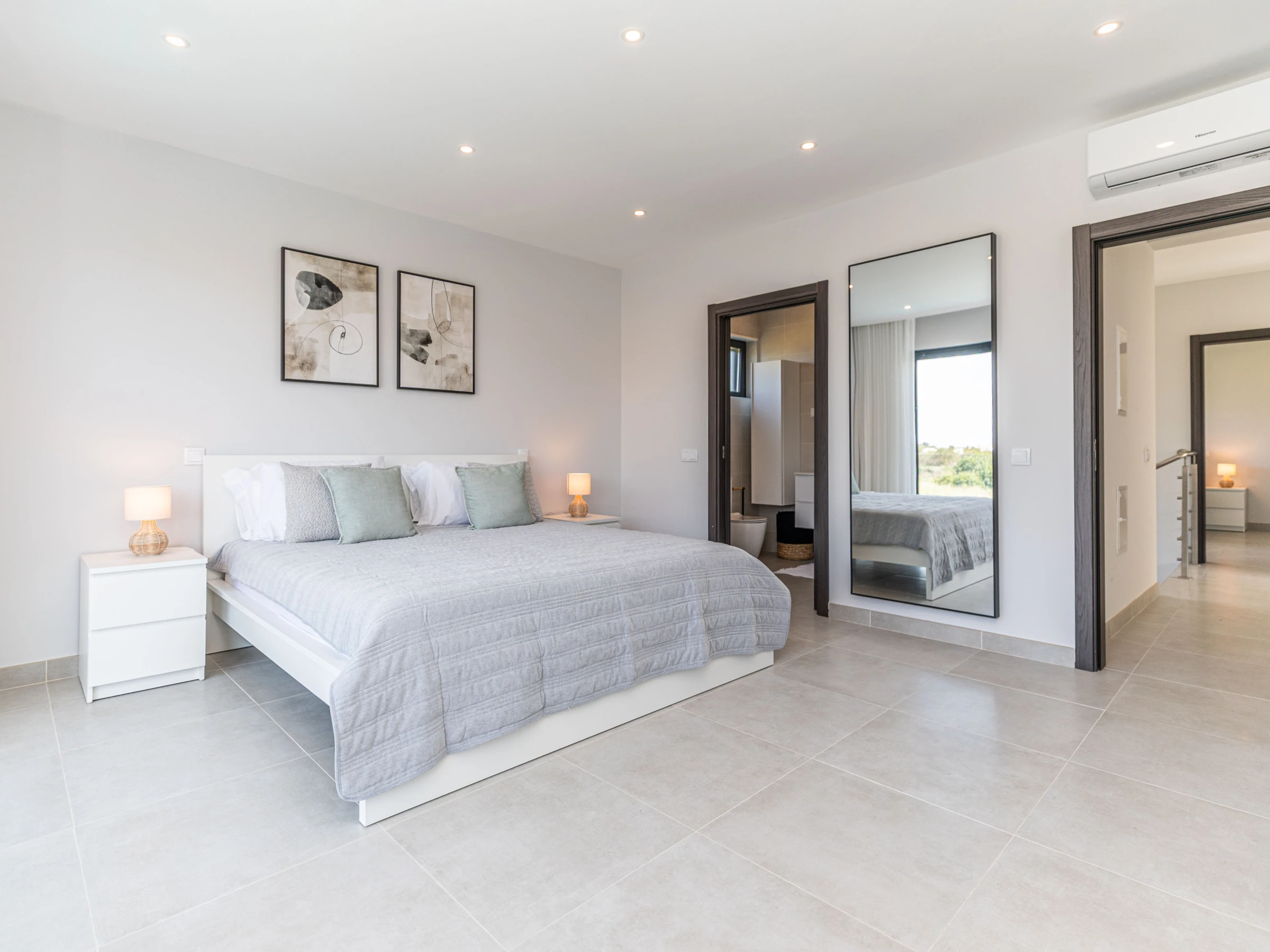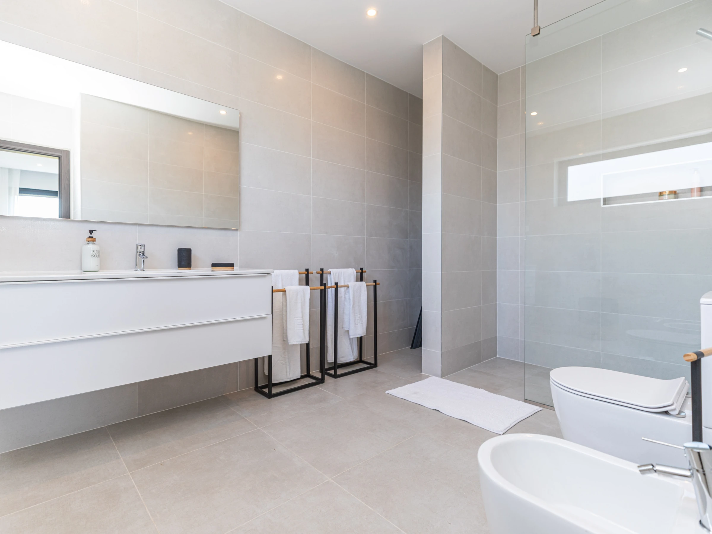 À l'étage, trois chambres supplémentaires magnifiques attendent : 2 chambres avec lit king size et une chambre avec un lit simple pour les enfants ou les amis partageant la chambre. Chacune est soigneusement conçue avec de grandes fenêtres, des volets électriques, des armoires intégrées, la climatisation et sa propre salle de douche privative pour un confort et une intimité maximaux.