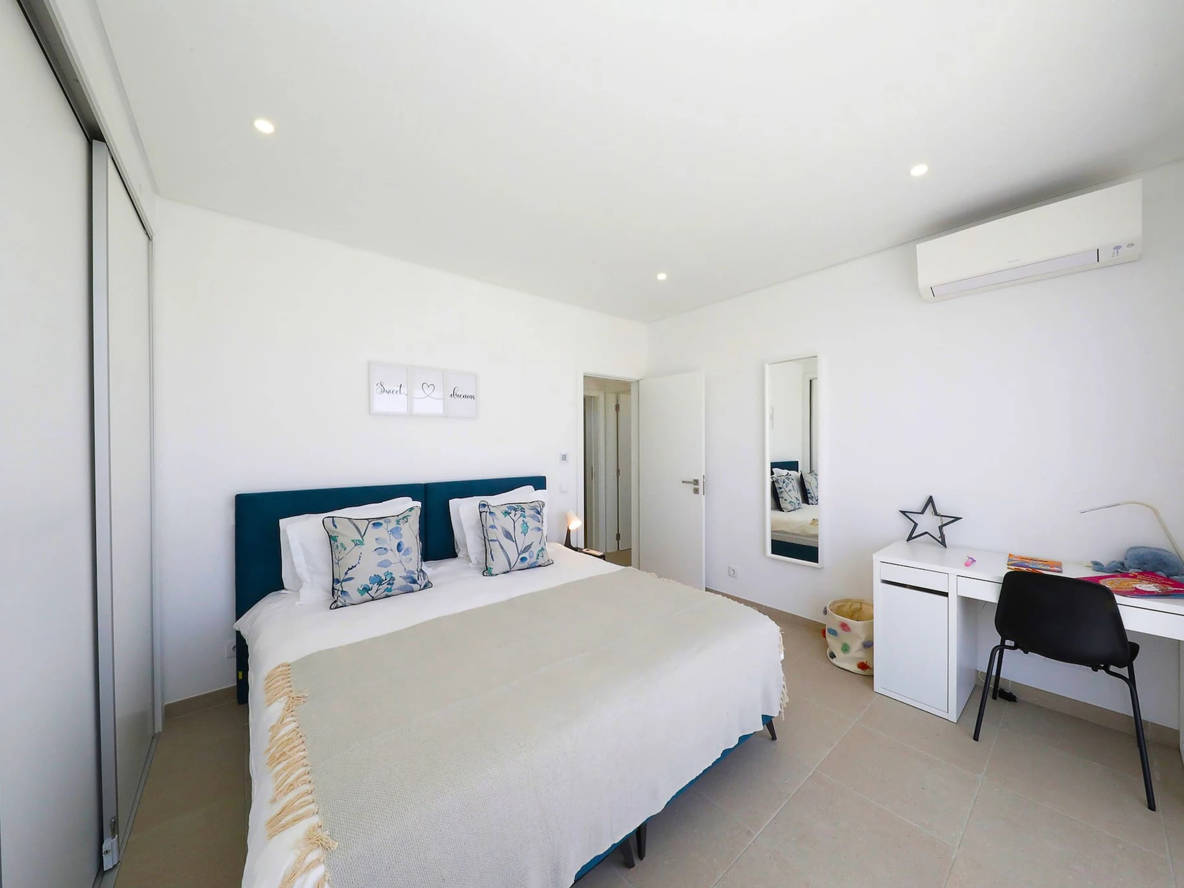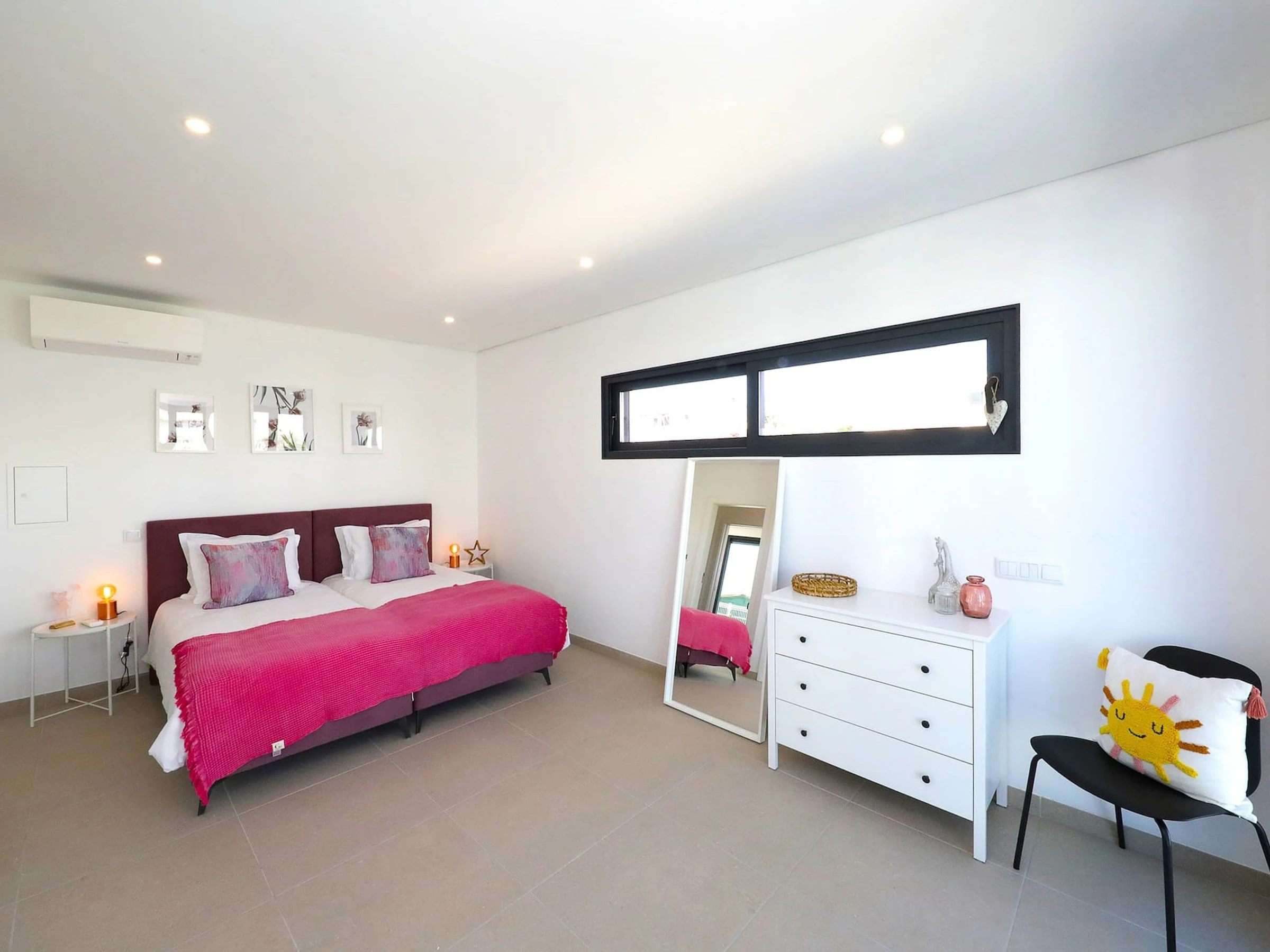 Le confort et la commodité se rencontrent au rez-de-chaussée, où vous trouverez une chambre bien aménagée avec deux lits simples et une salle de douche adjacente. À l'étage, deux chambres spacieuses et confortables vous attendent, toutes deux pourvues de lits king-size. L'une des chambres dispose d'un bureau offrant un espace de jeu pour les enfants ou un poste de travail pratique pour les adultes. Des armoires encastrées spacieuses et des balcons accessibles depuis chaque fenêtre de patio ajoutent à l'ambiance aérée et accueillante. Une salle de bain commune complète l'étage supérieur.