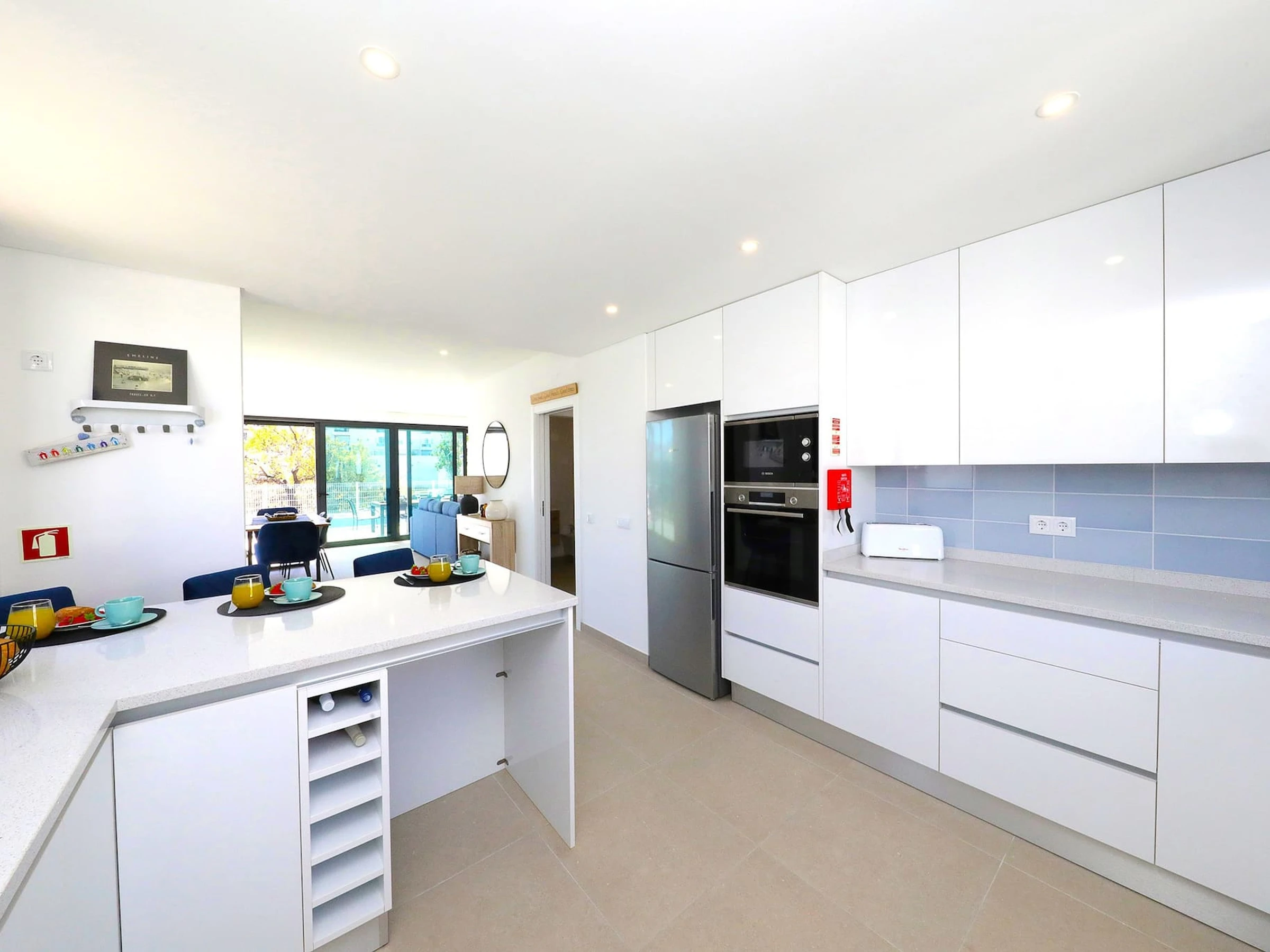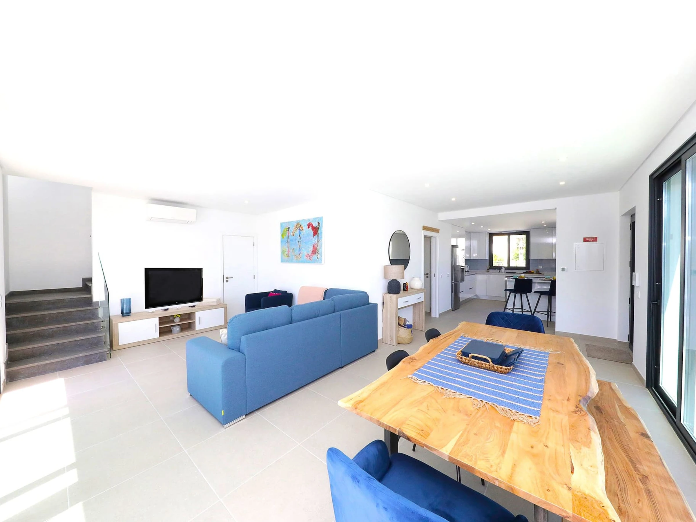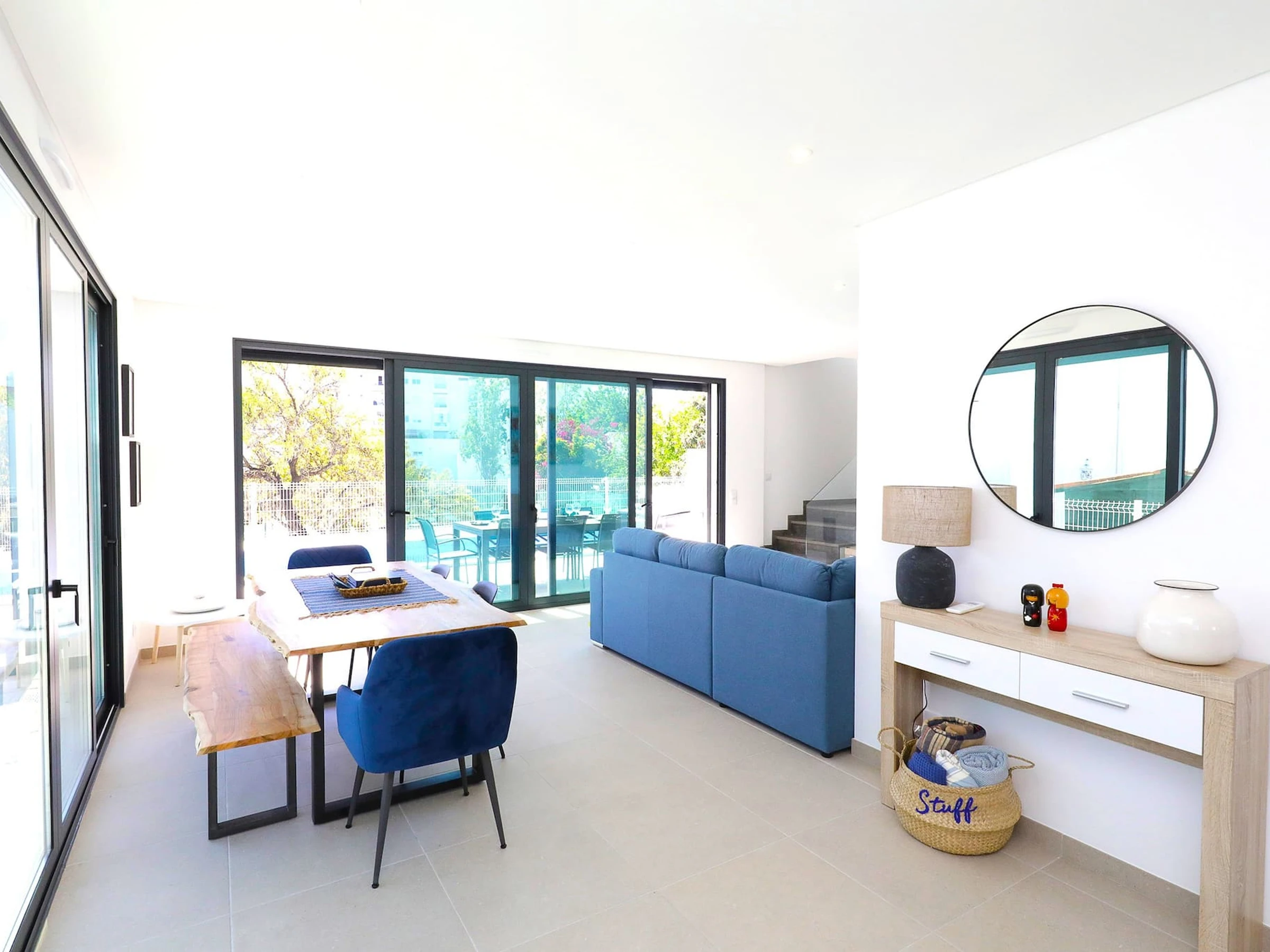Entrez et laissez-vous accueillir par l'intérieur frais et lumineux qui dégage un sentiment de tranquillité. La disposition en plan ouvert relie harmonieusement la cuisine sur la droite et mène à la salle à manger/salon accueillante sur la gauche. Enfoncez-vous dans les canapés moelleux et profitez du divertissement sur la télévision tandis que les grandes fenêtres de la terrasse offrent une vue sur la piscine privée.
