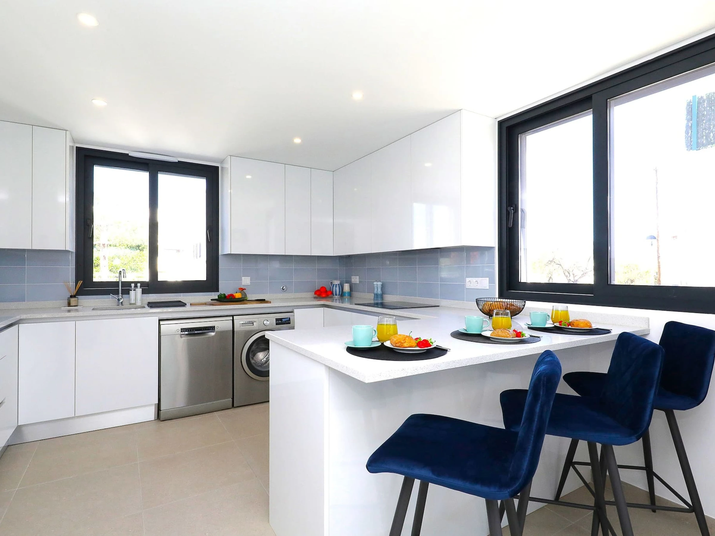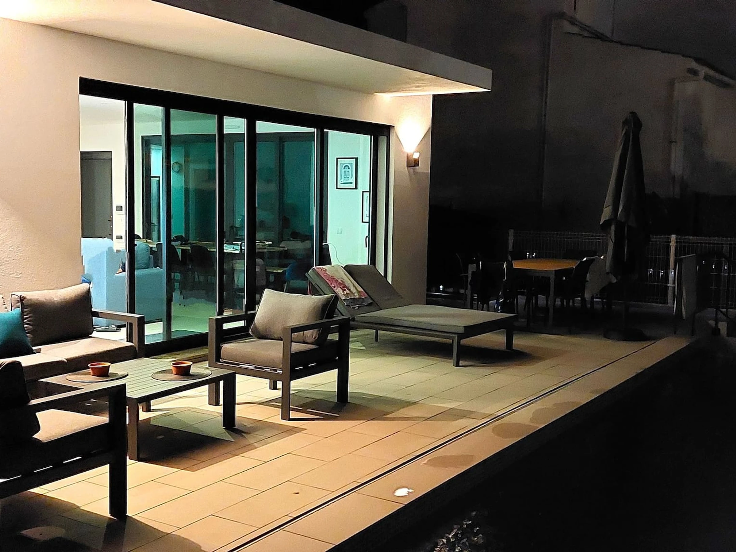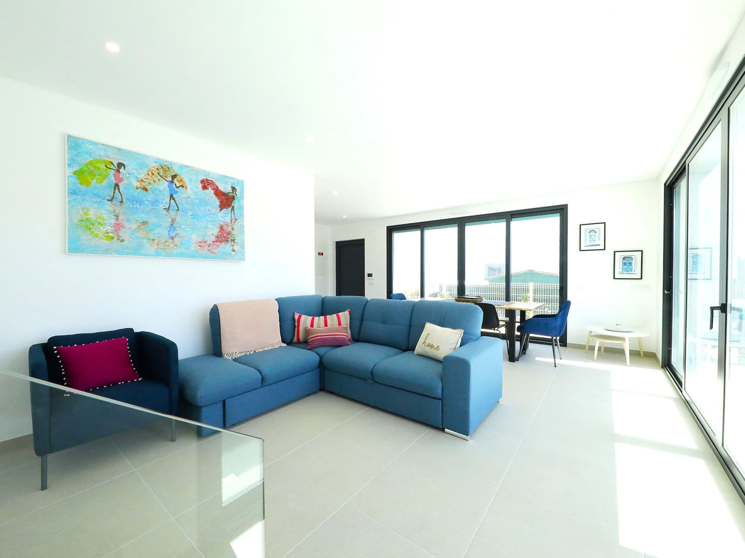 Entrez et laissez-vous accueillir par l'intérieur frais et lumineux qui dégage un sentiment de tranquillité. La disposition en plan ouvert relie harmonieusement la cuisine sur la droite et mène à la salle à manger/salon accueillante sur la gauche. Enfoncez-vous dans les canapés moelleux et profitez du divertissement sur la télévision tandis que les grandes fenêtres de la terrasse offrent une vue sur la piscine privée.