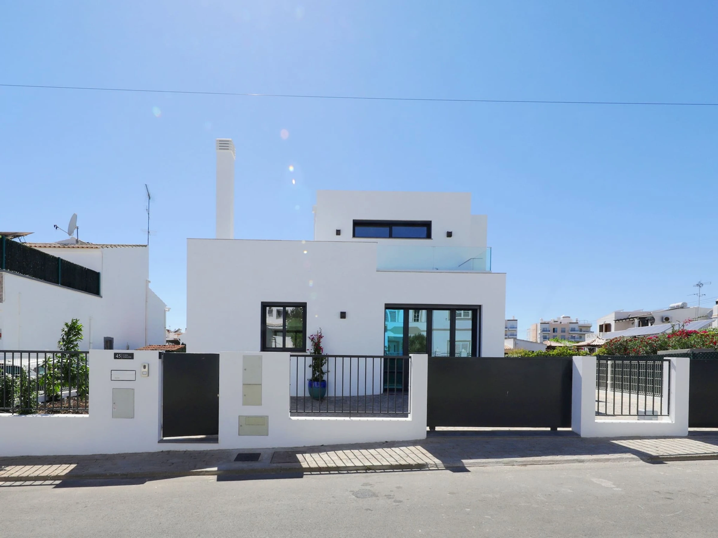 La villa est sécurisée par un portail, offrant un parking juste devant la maison pour votre commodité. Empruntez le chemin à côté de la maison pour accéder aux terrasses spacieuses et à la piscine à débordement scintillante avec son eau claire et bleue. Les transats vous invitent à vous prélasser sous le soleil chaleureux, tandis que les canapés confortables offrent un endroit idéal pour se détendre et profiter de l'atmosphère sereine.