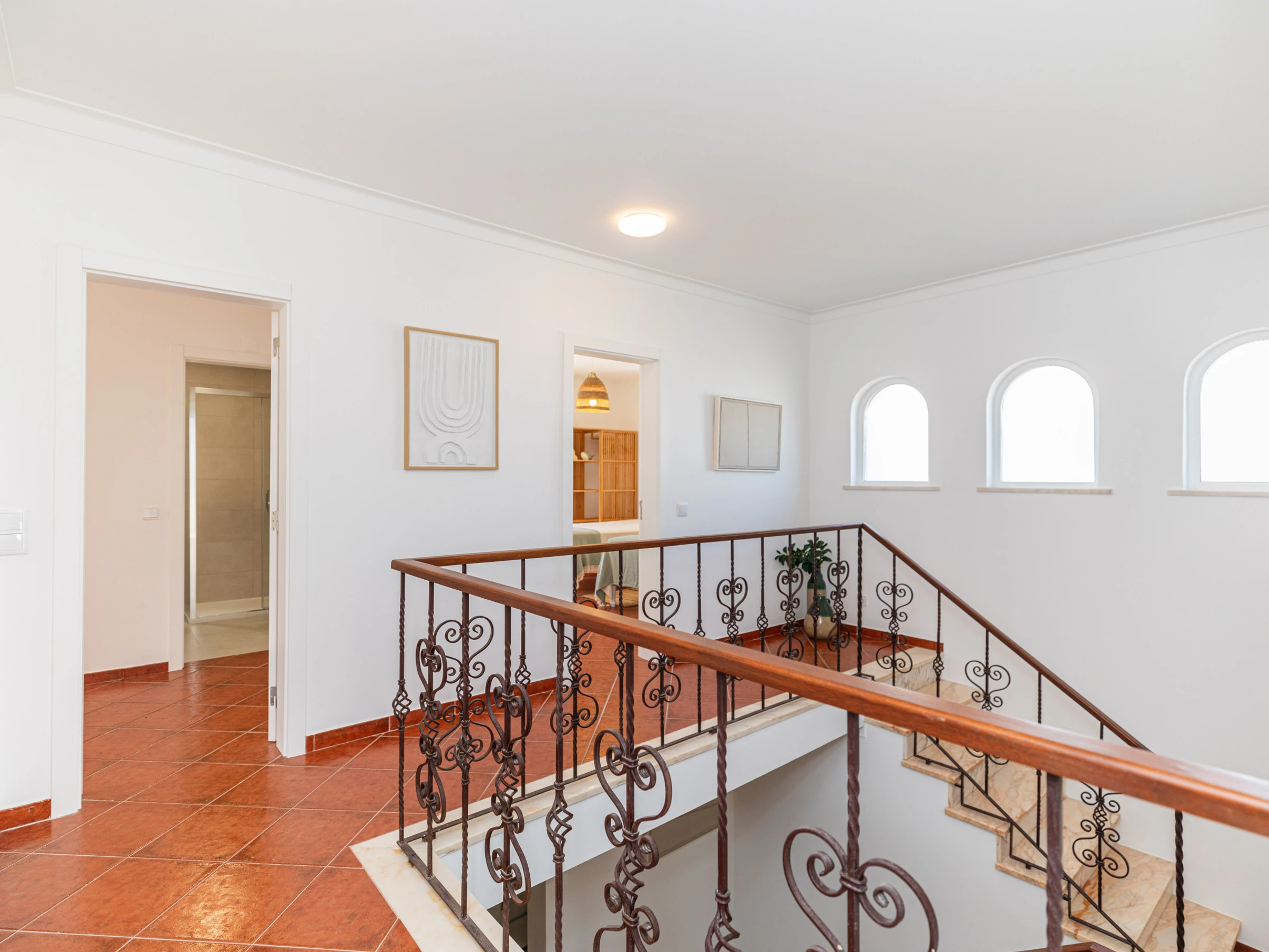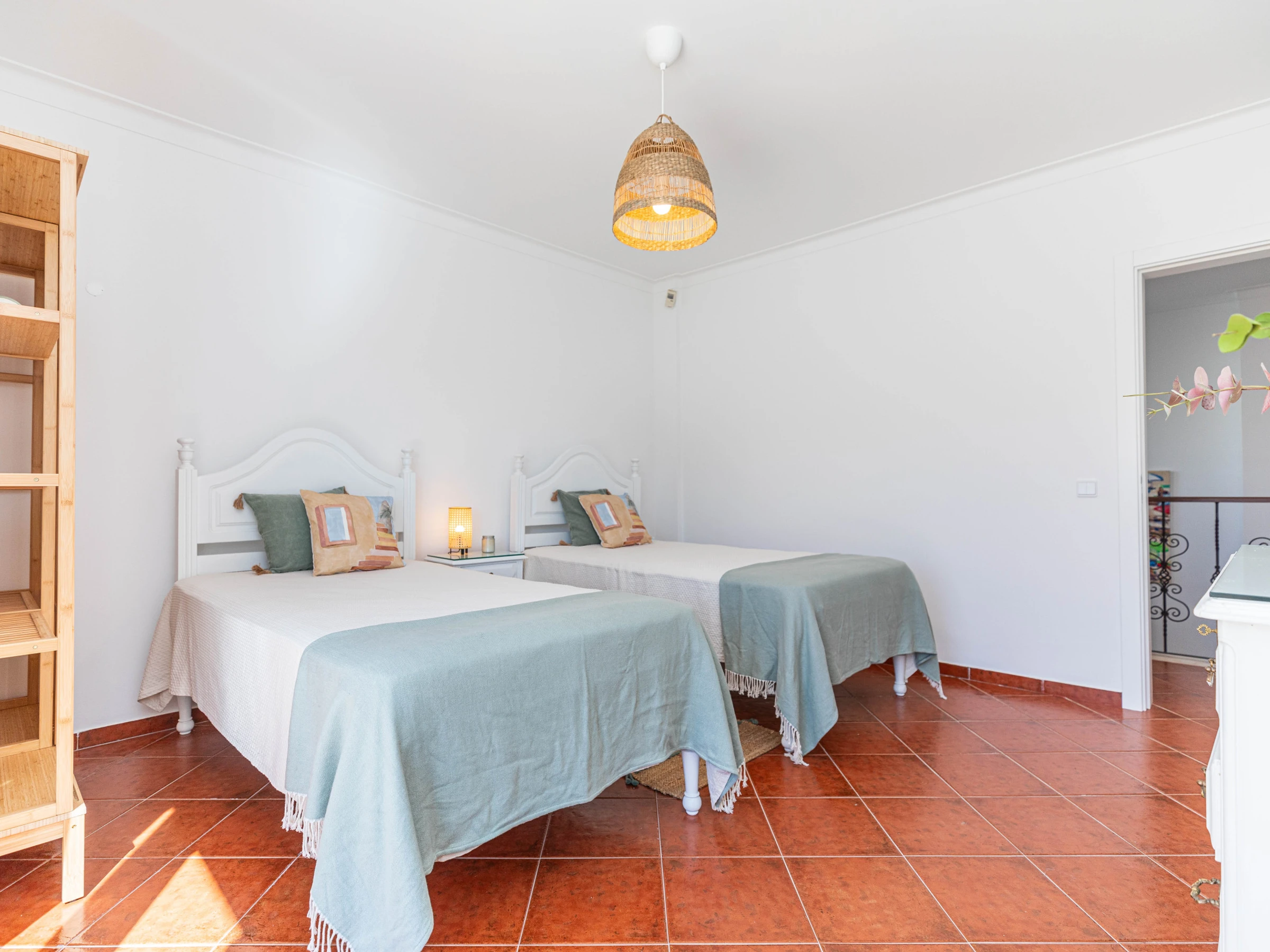 À l'étage, vous trouverez trois autres suites de chambres : deux chambres avec lits jumeaux et balcons, dont l'une dispose d'une salle de bain privative, ainsi qu'une chambre double. Une salle de bain séparée est partagée par les 2 chambres.