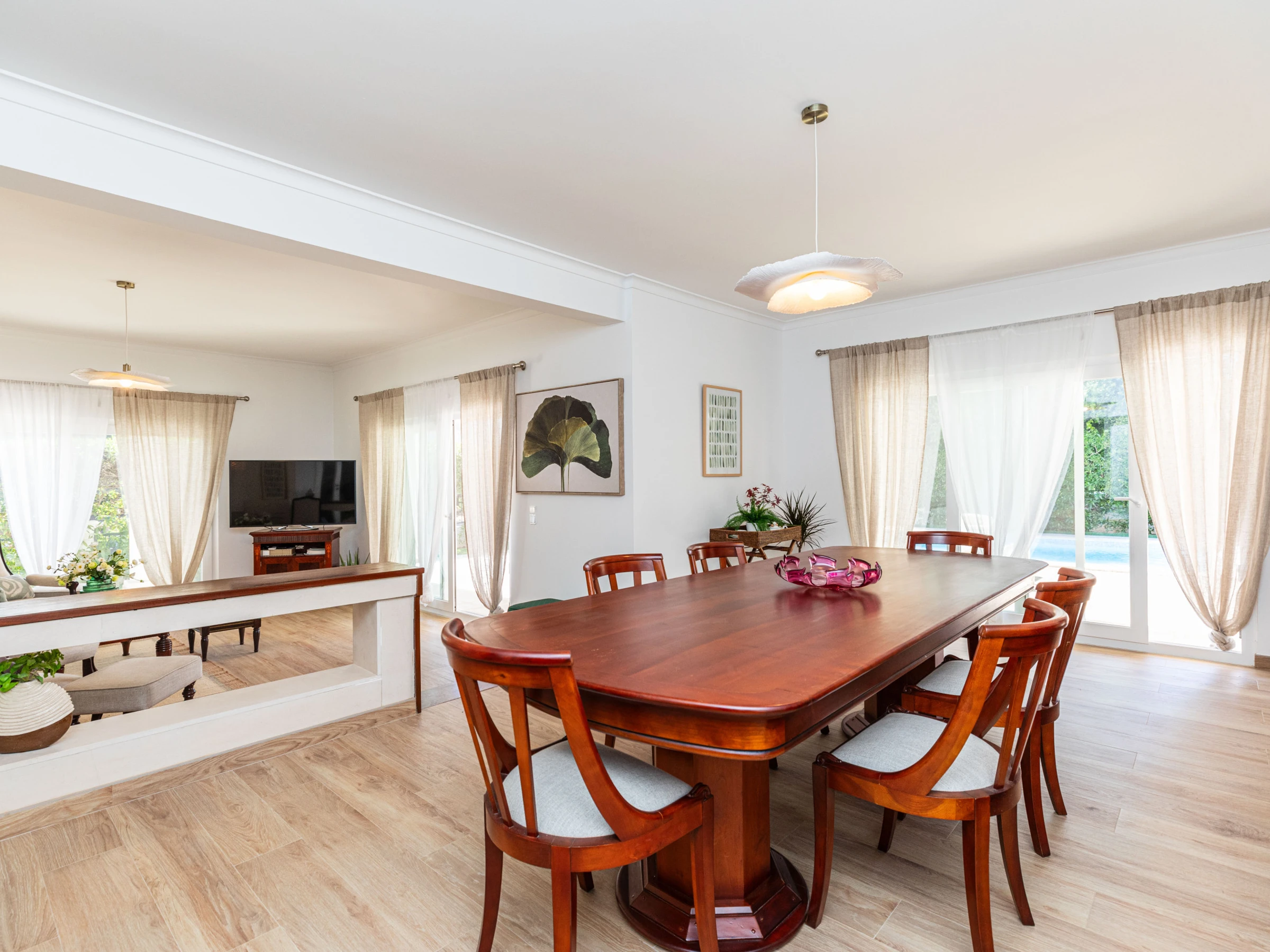 Vous êtes accueilli par un hall d'entrée impressionnant, avec des espaces de vie à gauche et une chambre à droite. Le salon spacieux et ouvert dispose d'une télévision et de grandes baies vitrées donnant sur la piscine. L'espace de repas surélevé comprend une table et des chaises élégantes, et l'ensemble de l'espace est richement meublé. La cuisine lumineuse à l'arrière offre de nombreux espaces de rangement, des appareils complets et une table de petit-déjeuner. Une porte arrière s'ouvre sur les jardins. À droite, se trouve une chambre pratique au rez-de-chaussée avec un espace dressing et une salle de douche privative.