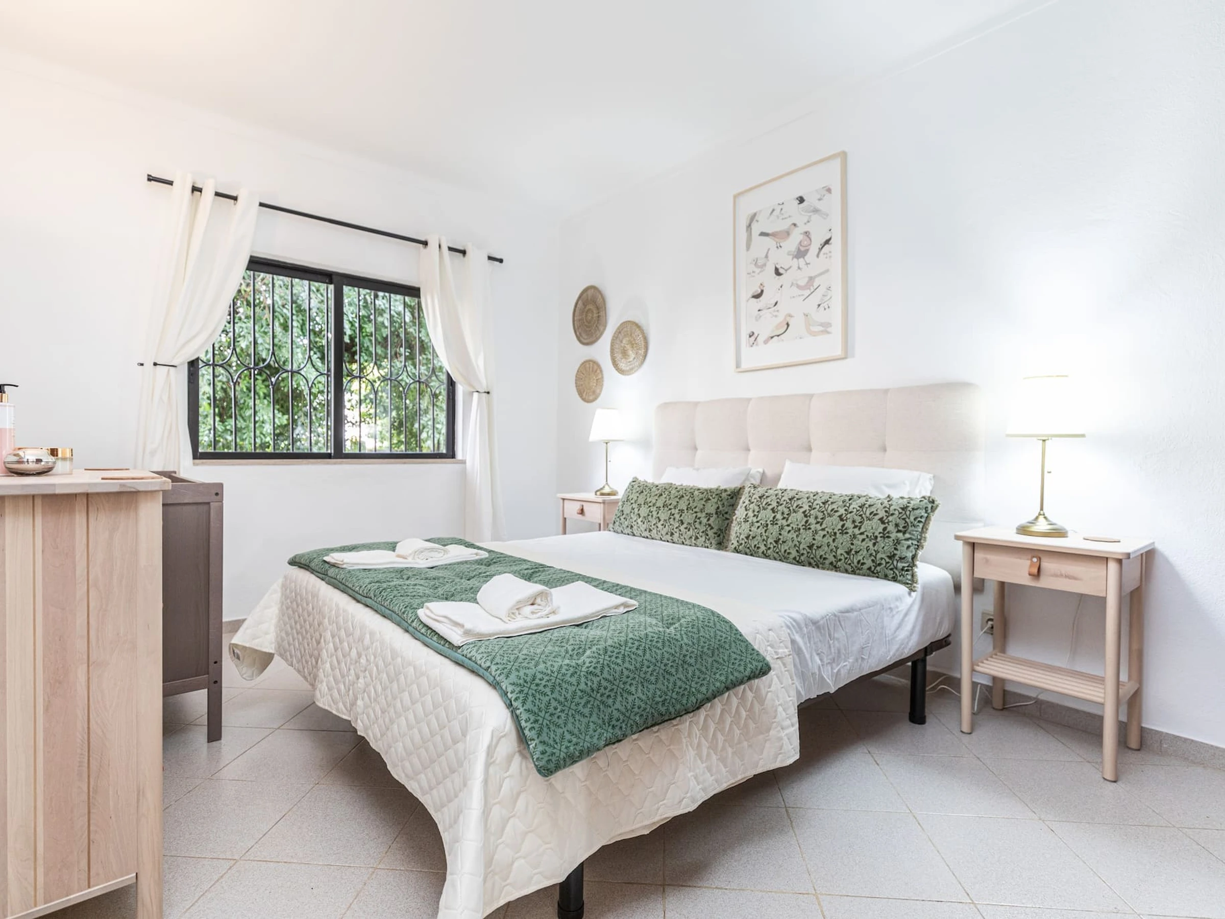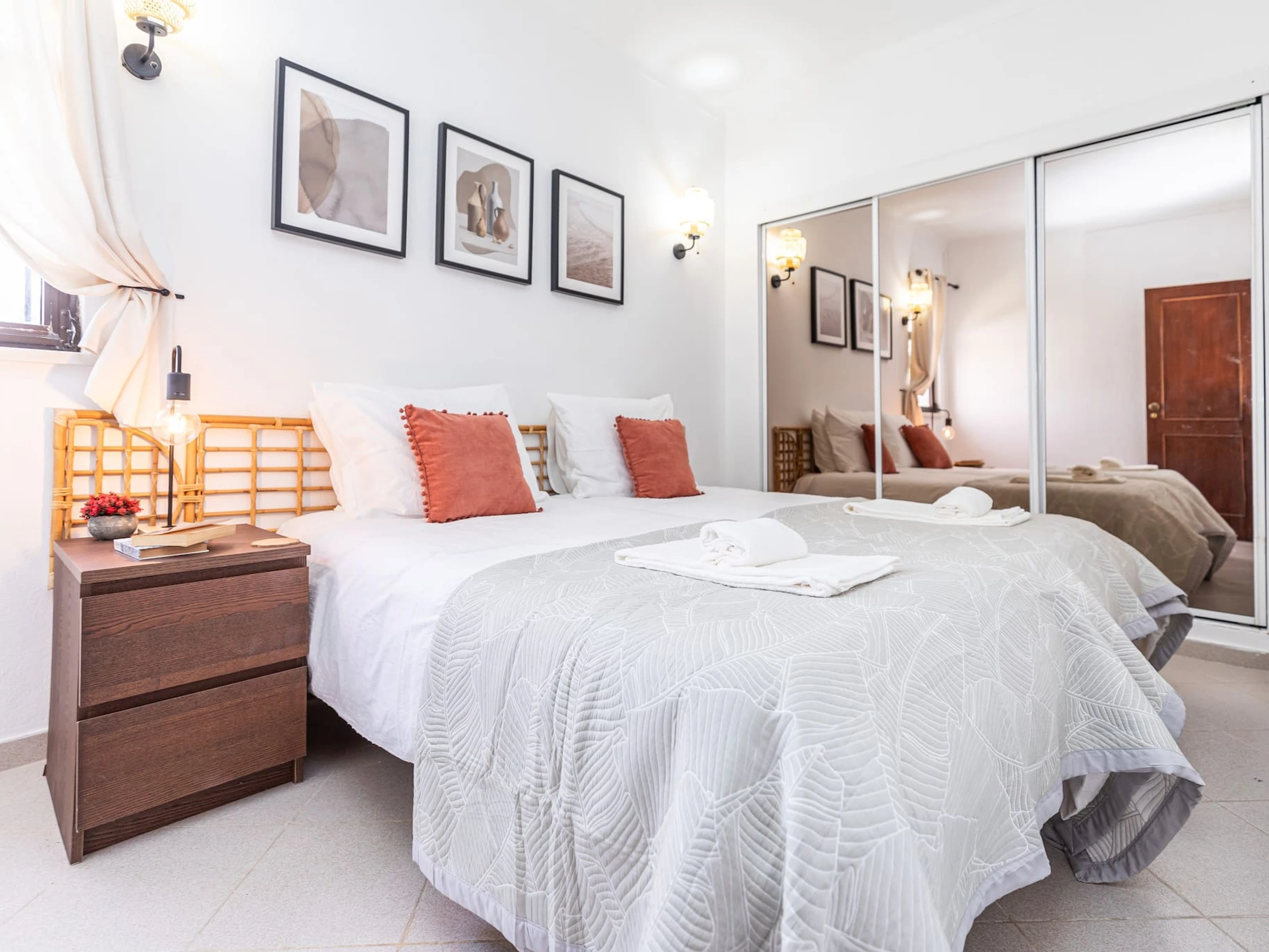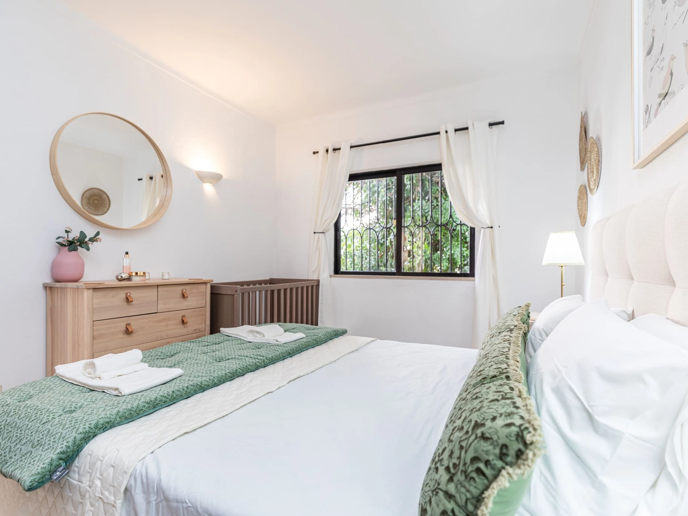 Ce charmant appartement de plain-pied est conçu pour le confort et la détente de votre famille. Entrez dans cet appartement de plain-pied accueillant, accueilli par un couloir élégant avec une console chic et un miroir. La chambre principale, dotée d'un lit king-size confortable et d'un lit de bébé, dispose de nombreuses armoires et d'une climatisation rafraîchissante. Une salle de bain lumineuse présente des armoires blanches et une douche à l'italienne simple, adjacente à la deuxième chambre offrant deux lits simples confortables - parfaite pour une retraite familiale idéale.