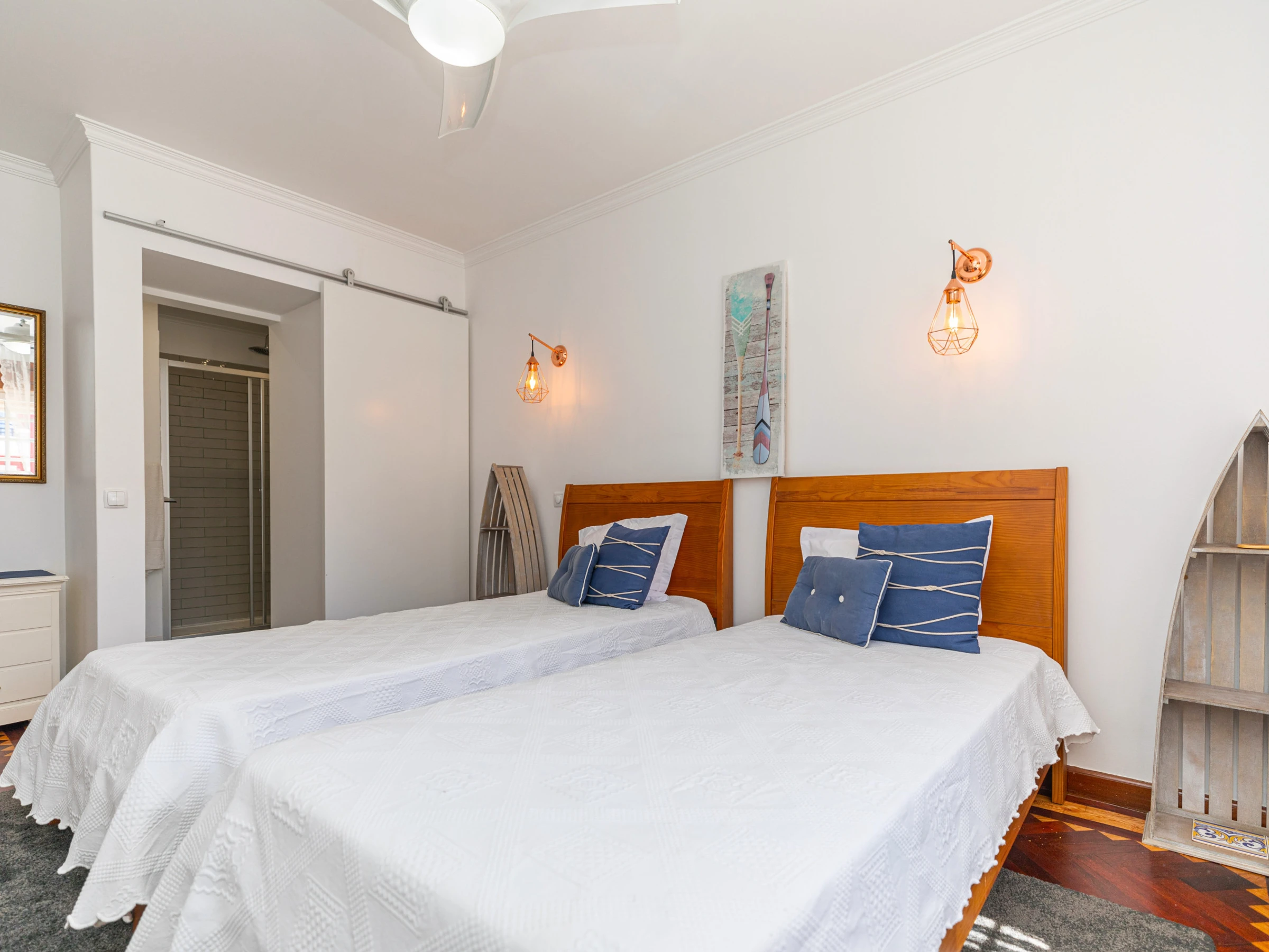 Au premier étage, vous découvrirez quatre chambres. Deux chambres avec un lit king-size disposent de salles de douche privatives, une chambre avec deux lits dispose également de sa propre salle de bain privée tandis que la quatrième chambre, avec un lit double, partage une salle de bain séparée. Toutes les chambres présentent de magnifiques parquets traditionnels. Incontestablement confortables et parfaitement aménagées pour les couples/familles.