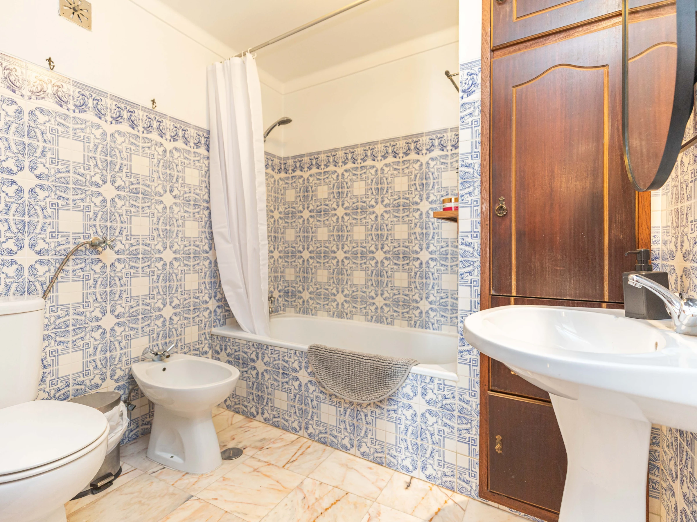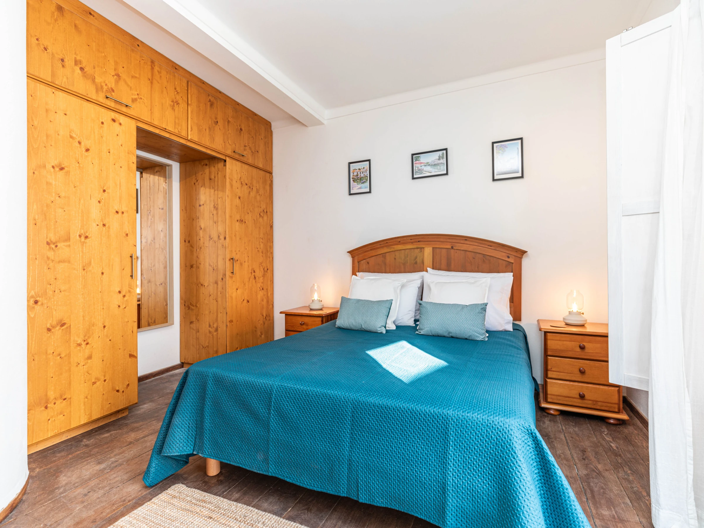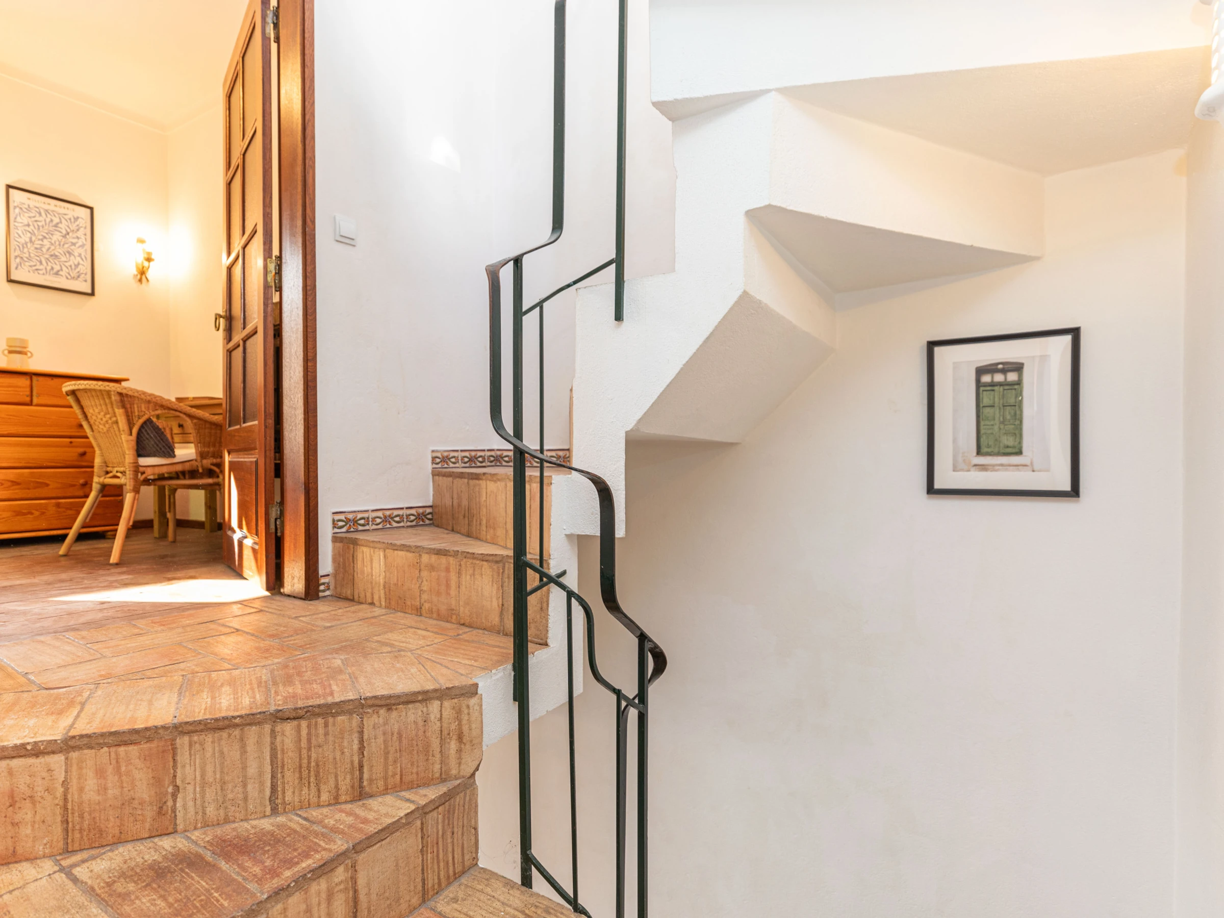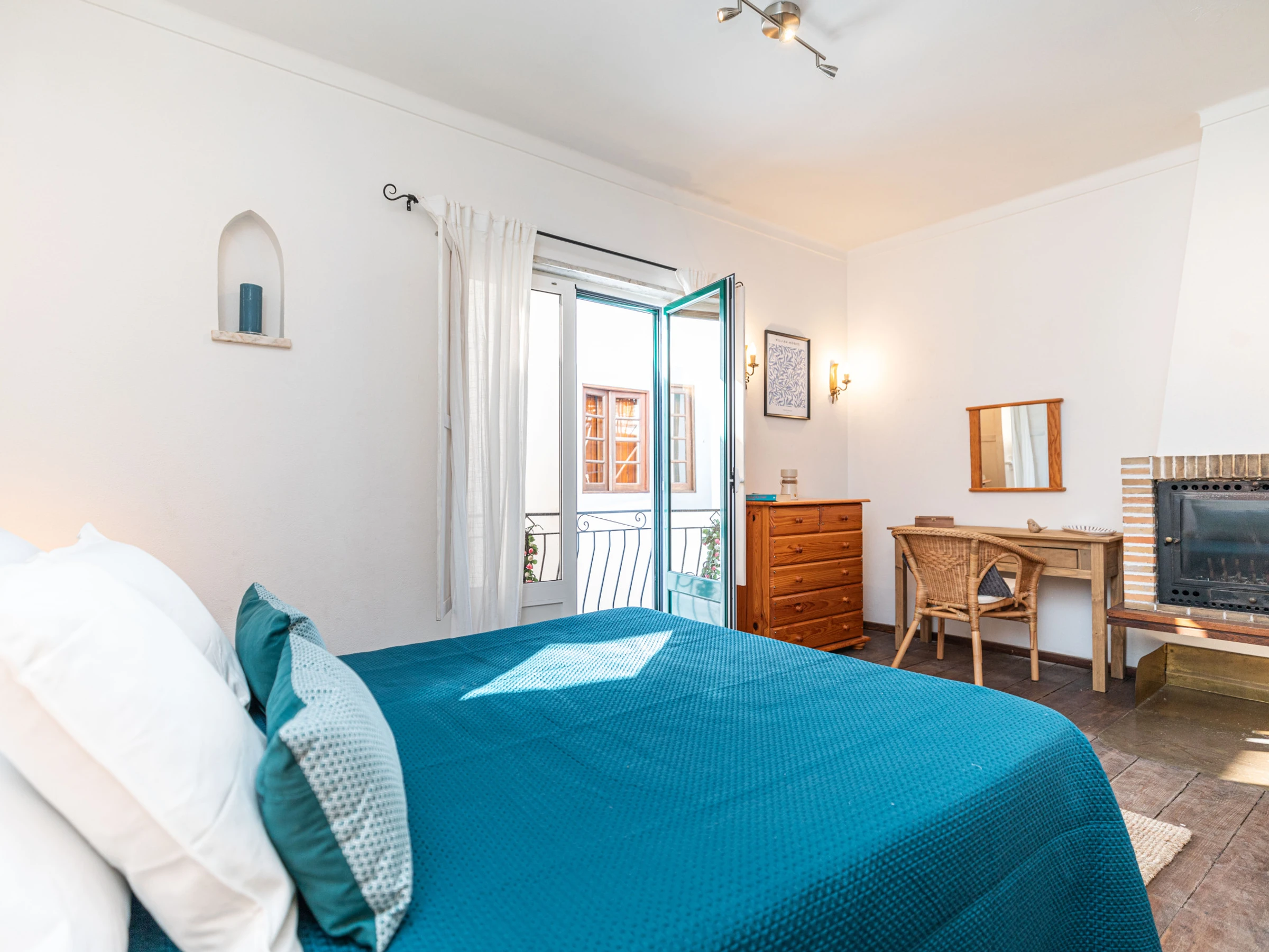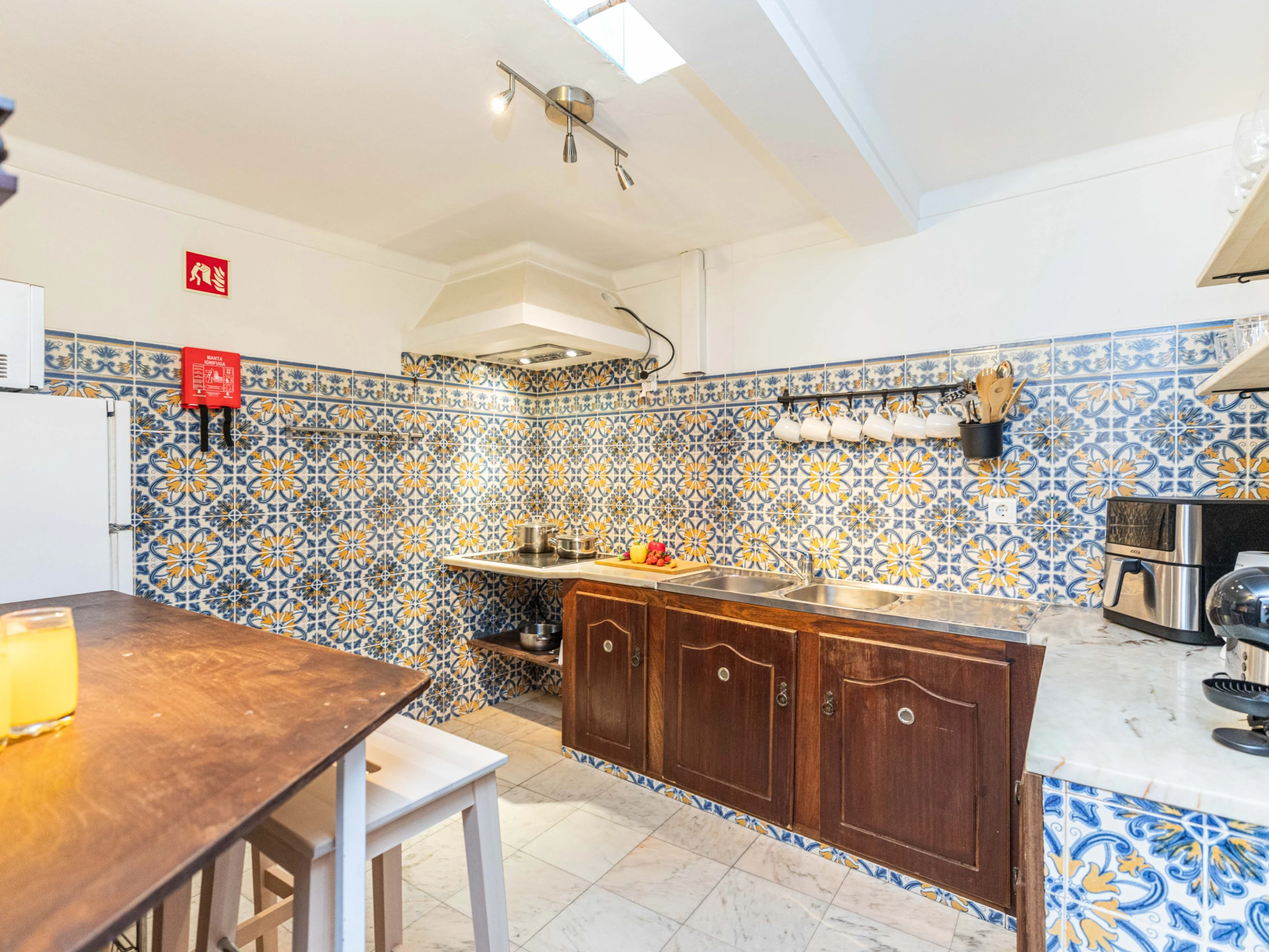 Montez au premier étage pour découvrir une cuisine traditionnelle et la chambre principale accueillante. La cuisine, avec sa décoration rustique, est équipée d'une plaque de cuisson électrique, d'un four à friteuse à air et d'une machine à café. (Le lave-linge se trouve au deuxième étage.) La chambre principale dispose d'un balcon Juliet avec vue sur la rue historique en contrebas, des armoires intégrées et une coiffeuse. La salle de bain commune à cet étage offre une baignoire avec douche suspendue, ornée de magnifiques carreaux bleus.