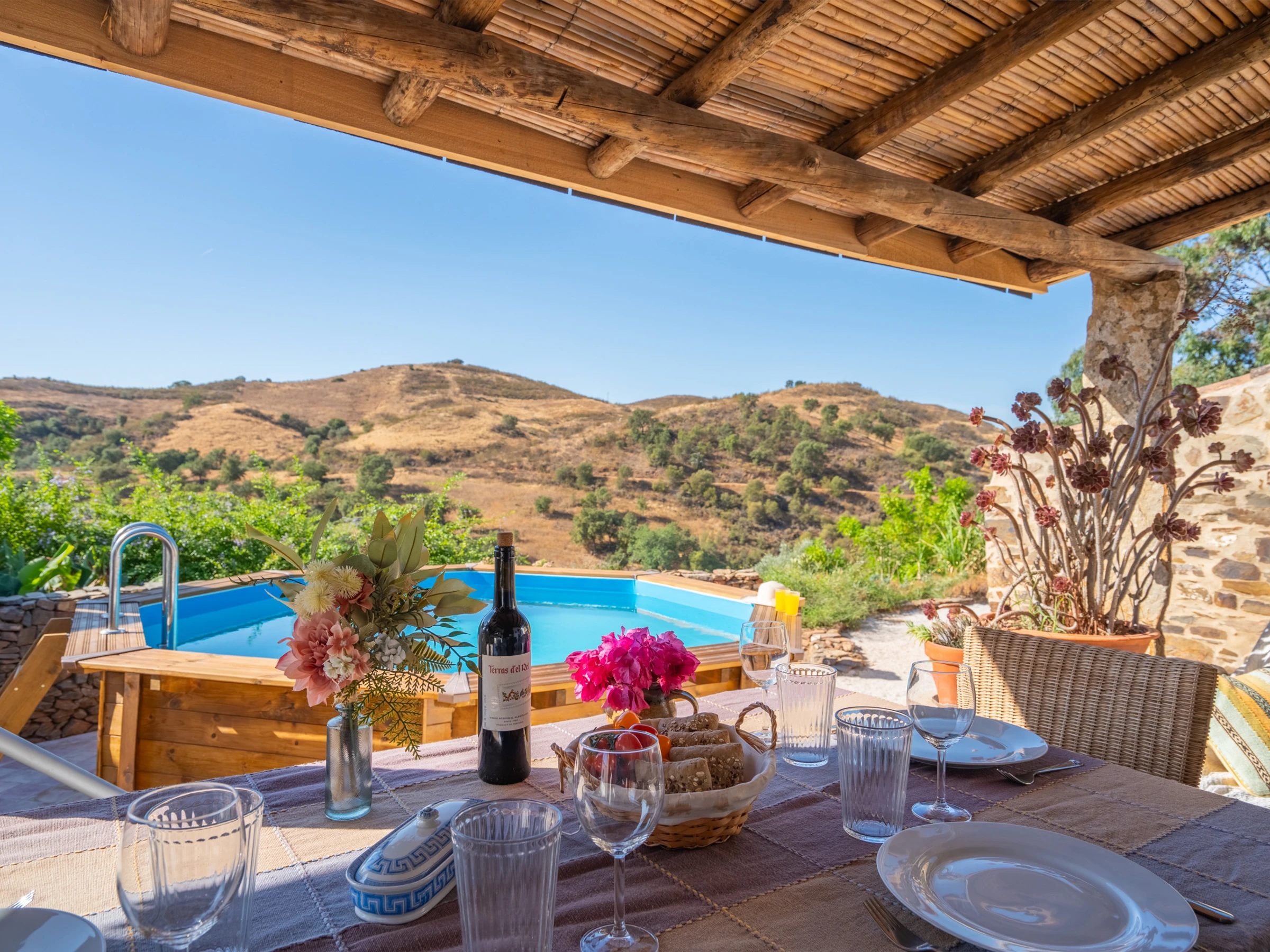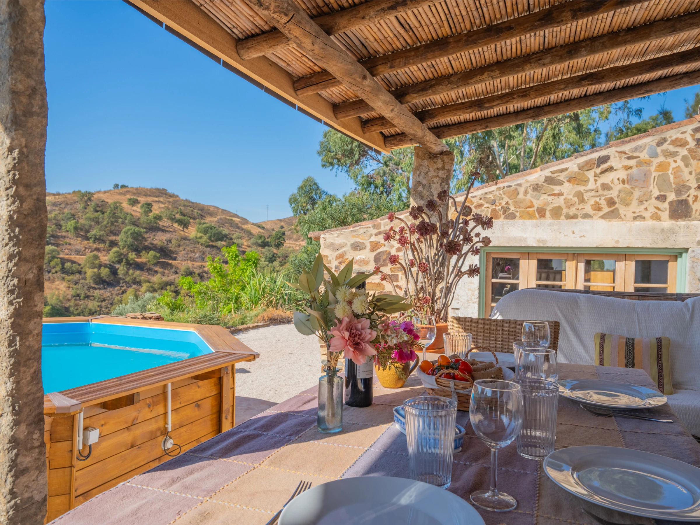 À l'extérieur, une grande terrasse avec une table à manger en bois et des bancs confortables offre des vues spectaculaires et le cadre parfait pour des petits-déjeuners ensoleillés, des déjeuners relaxants ou des dîners en plein air. Une piscine hors-sol permet une retraite rafraîchissante par temps chaud, complétant cette échappée idyllique à la campagne.