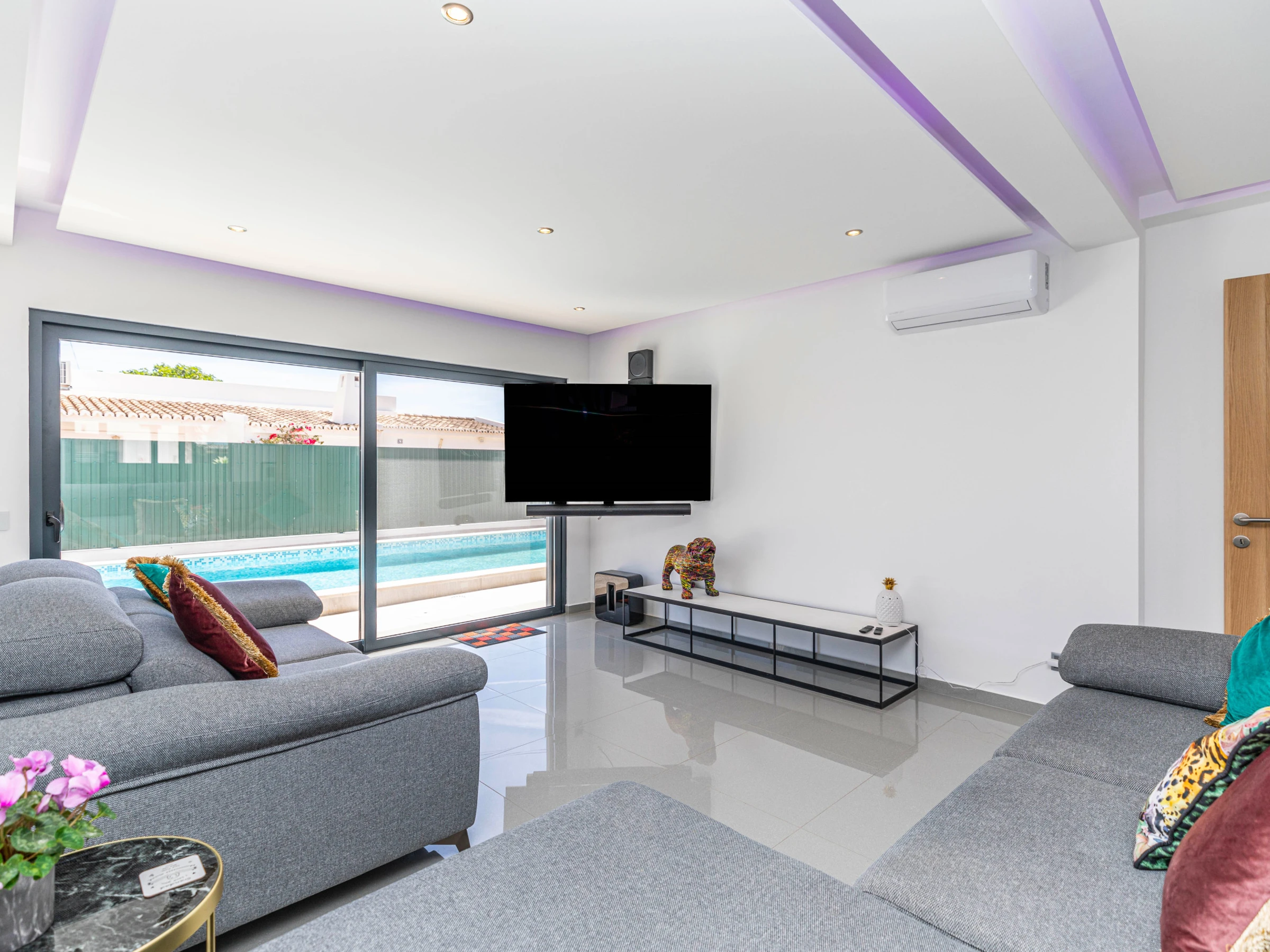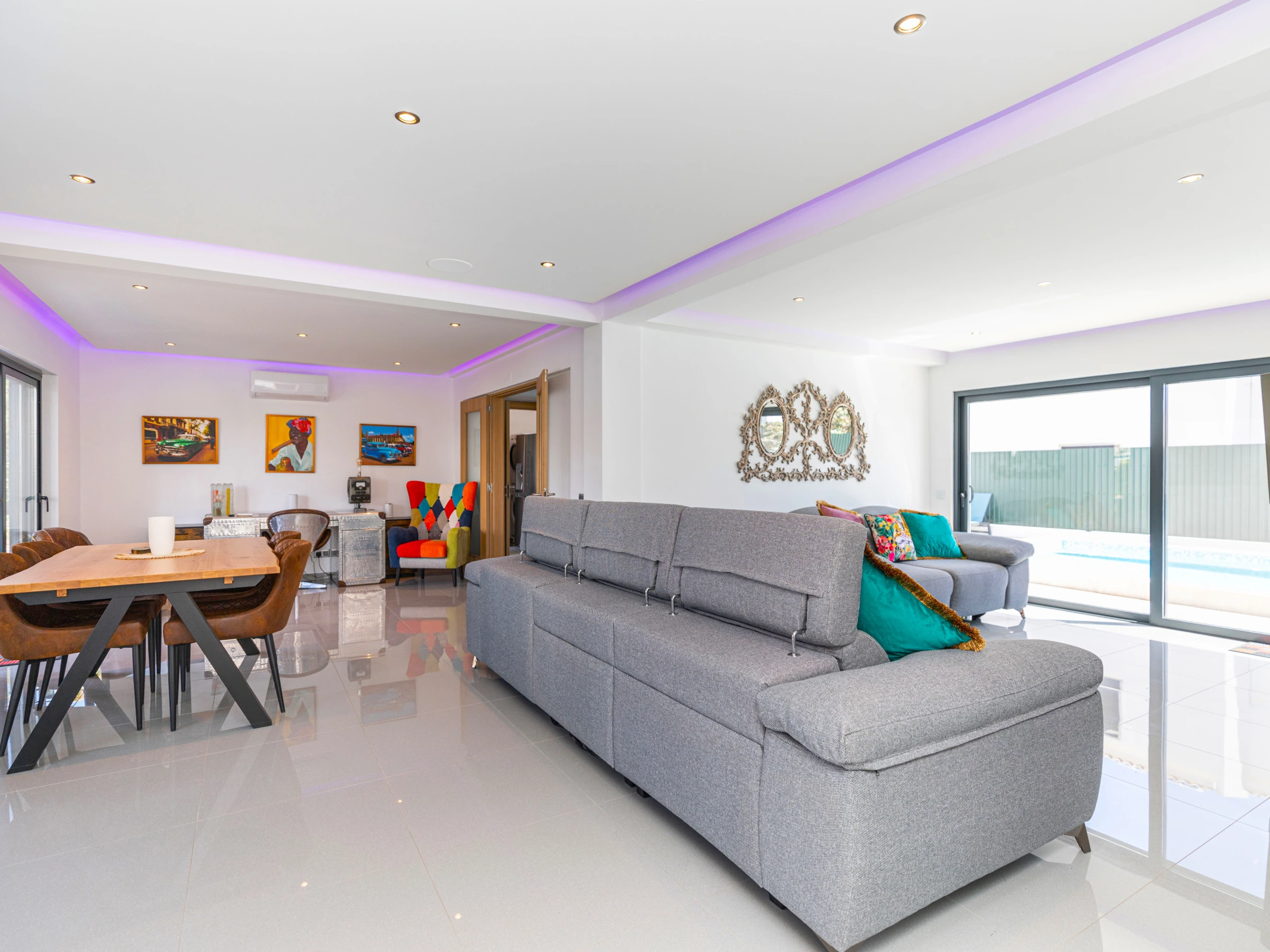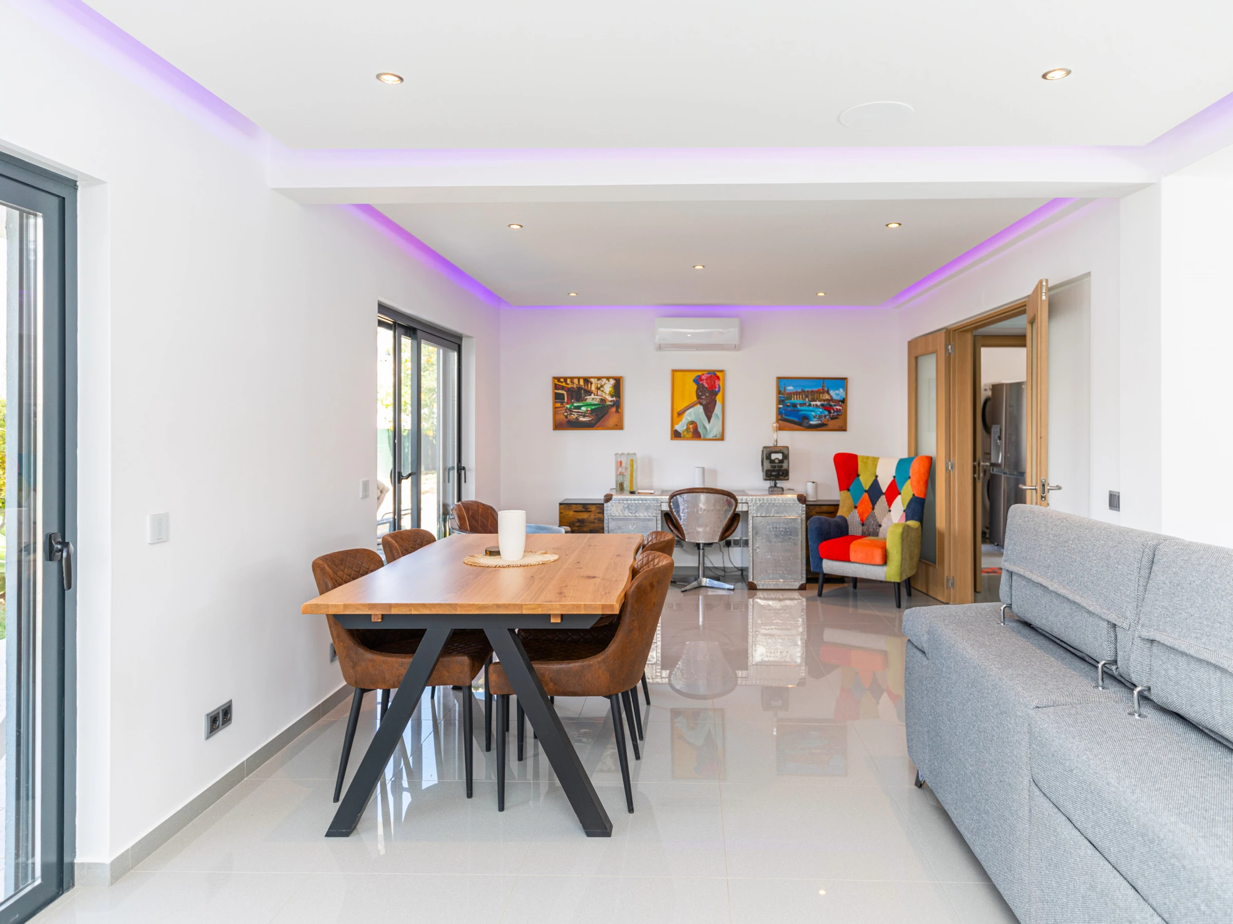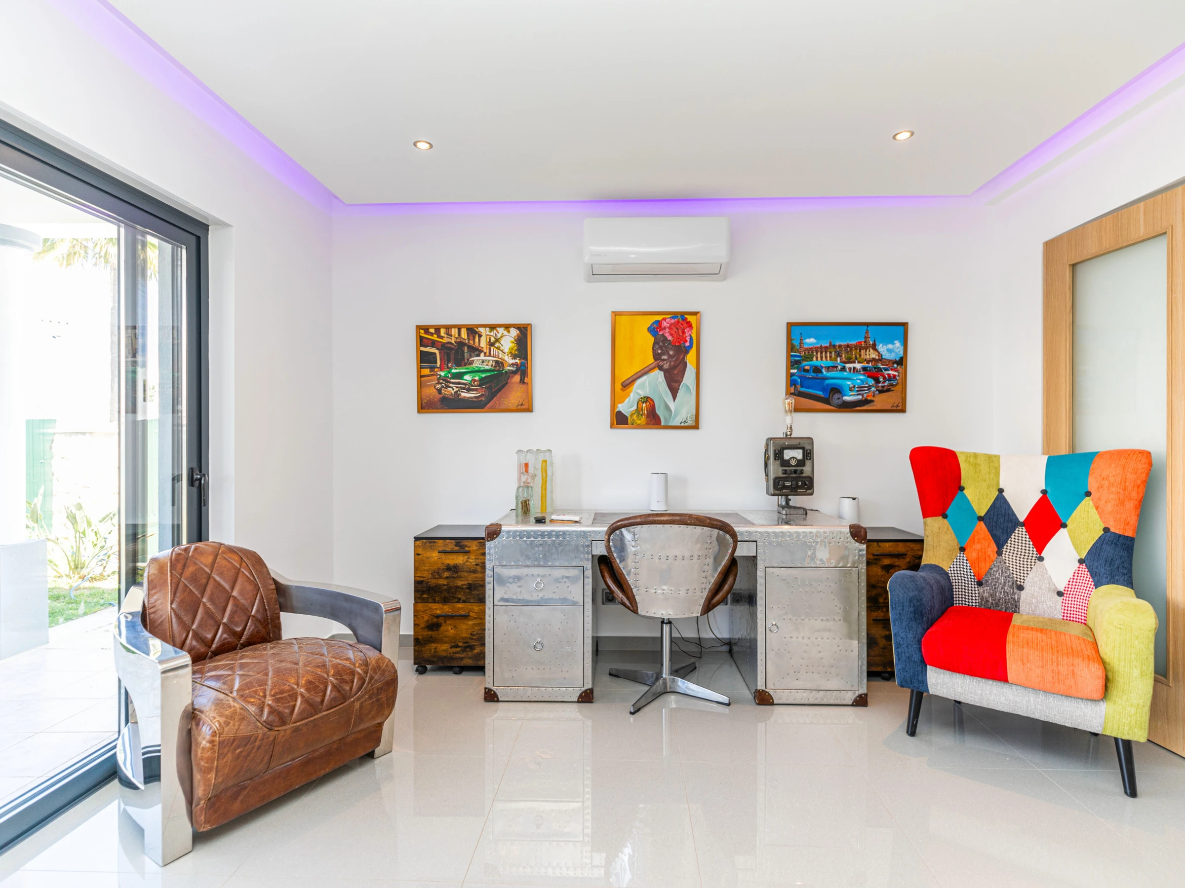 Salon : Dès l'entrée sur votre gauche, un vaste espace de vie ouvert vous attend. Enfoncez-vous dans des canapés moelleux et confortables tout en profitant du divertissement sur le téléviseur intelligent impressionnant de 65 pouces. Adjacent à cette zone de salon douillette avec ses touches de couleur, une table de salle à manger spacieuse vous invite à savourer des repas élégants. Les grandes fenêtres donnant sur la terrasse inondent la pièce de lumière naturelle et offrent une vue sur la piscine scintillante. À noter également - un bureau et un espace de travail sont disponibles pour ceux qui doivent rester en contact avec leurs proches ou travailler !