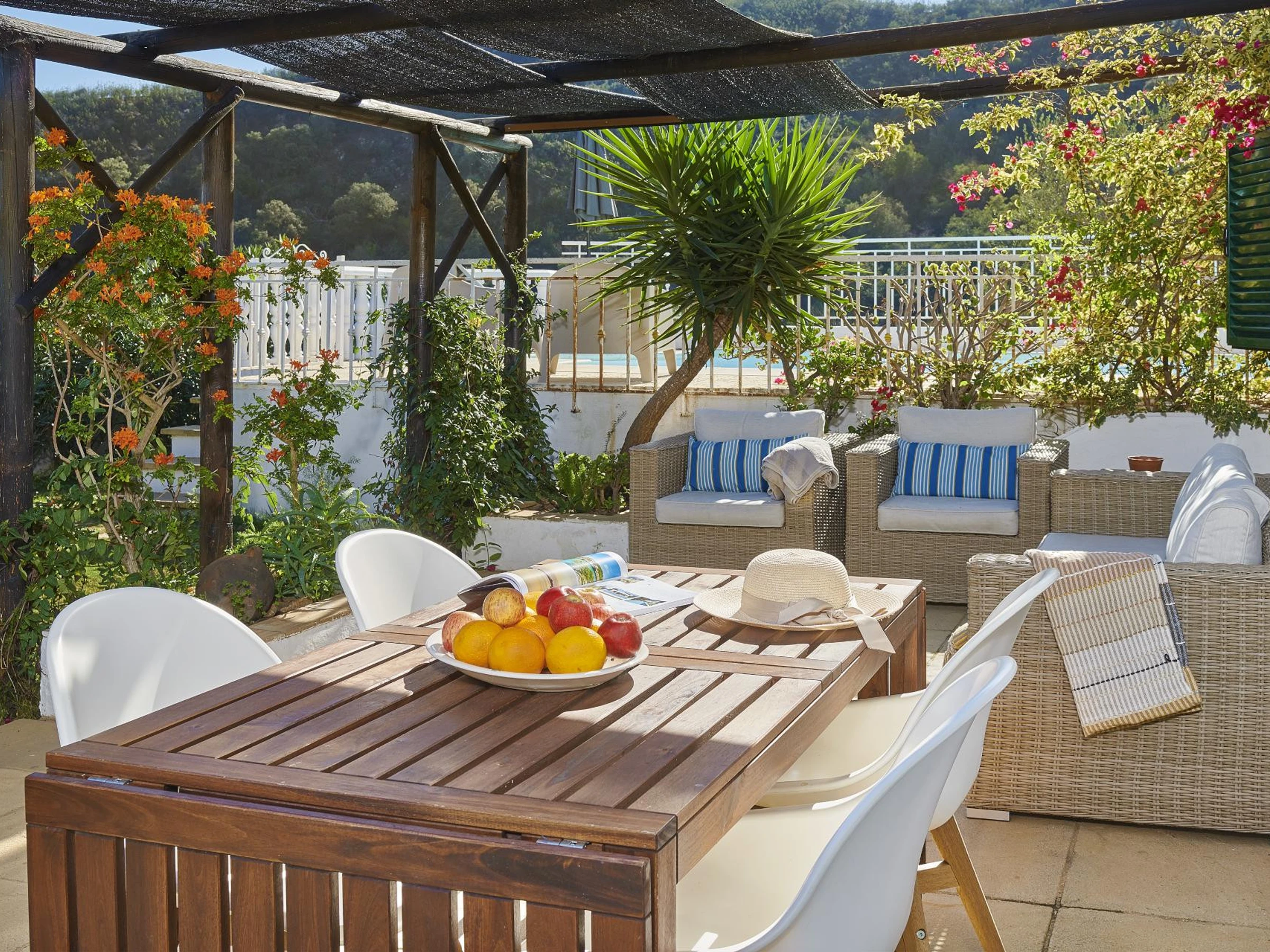 Franchissez les portes-fenêtres du salon pour accéder aux terrasses extérieures, où plusieurs espaces de repos vous invitent à vous détendre et à profiter de l'environnement serein. Le repas en plein air est un plaisir ici, avec un barbecue traditionnel au charbon de bois niché dans un coin tranquille près de la piscine. Adjacent au salon, un coin salon confortable offre un espace ombragé pour se détendre, tandis que les abords de la piscine sont parfaits pour bronzer. Le jardin de la villa est clos et privé, combinant pelouse, arbustes et oliviers, offrant un espace sécurisé pour que les enfants puissent jouer ou pour que les adultes profitent du calme extérieur.