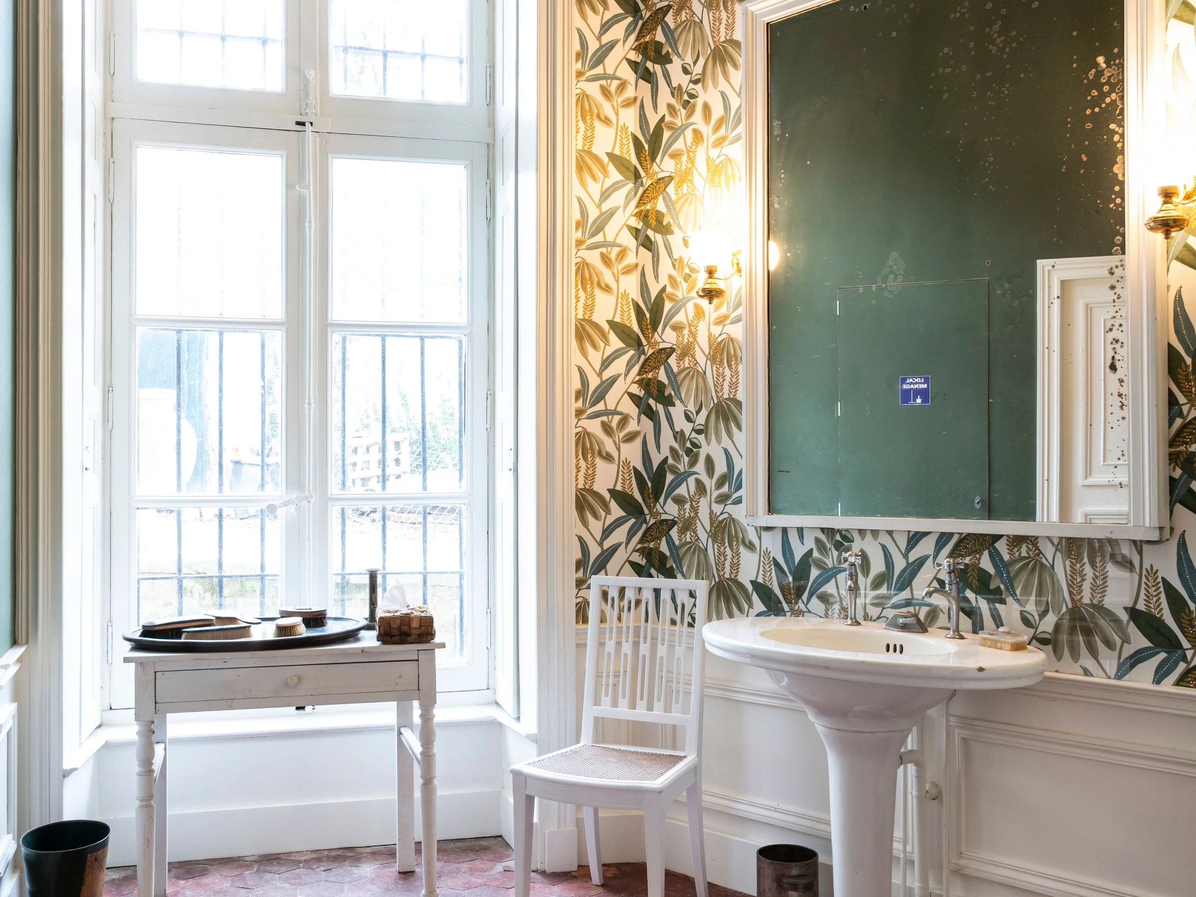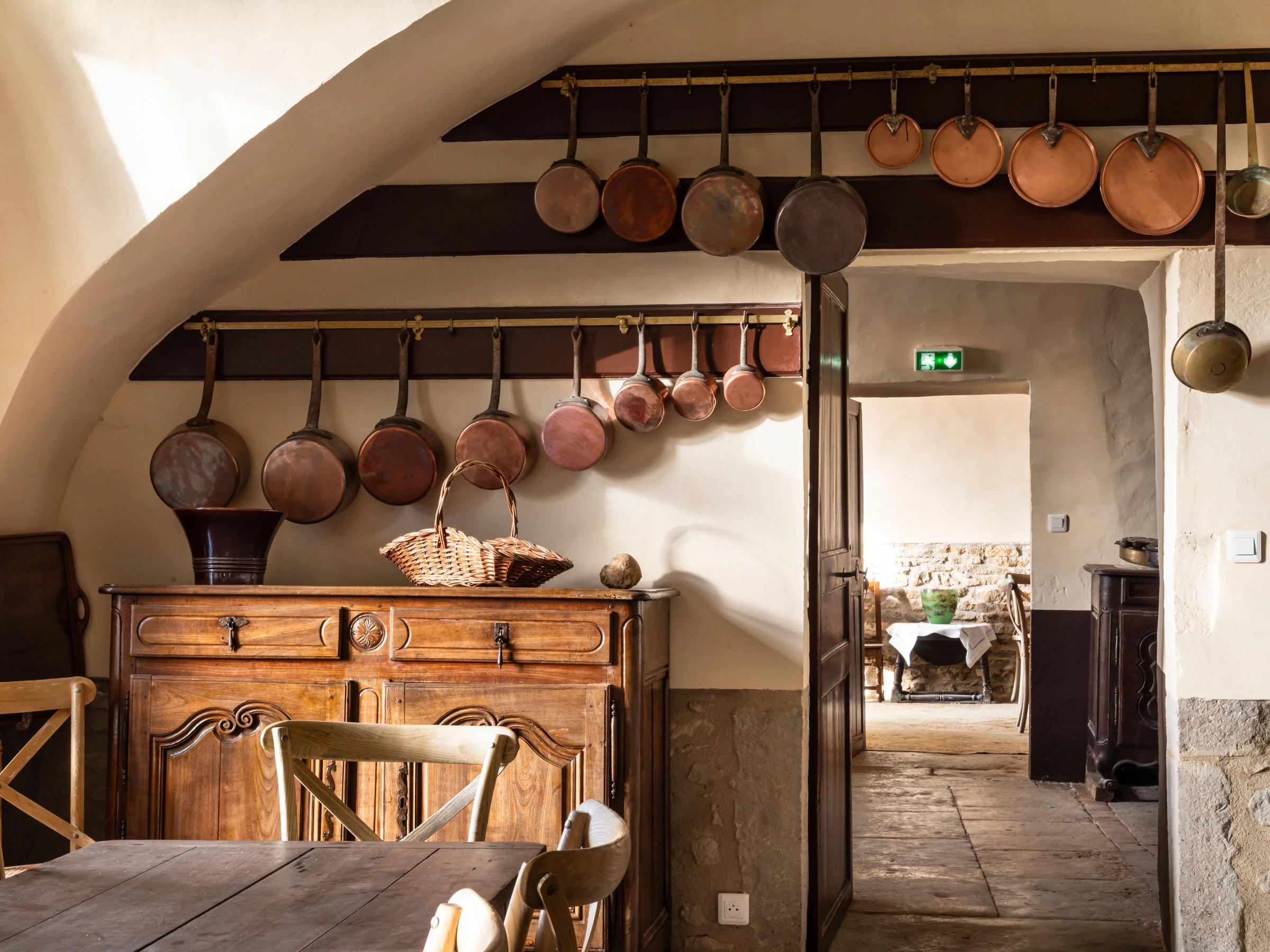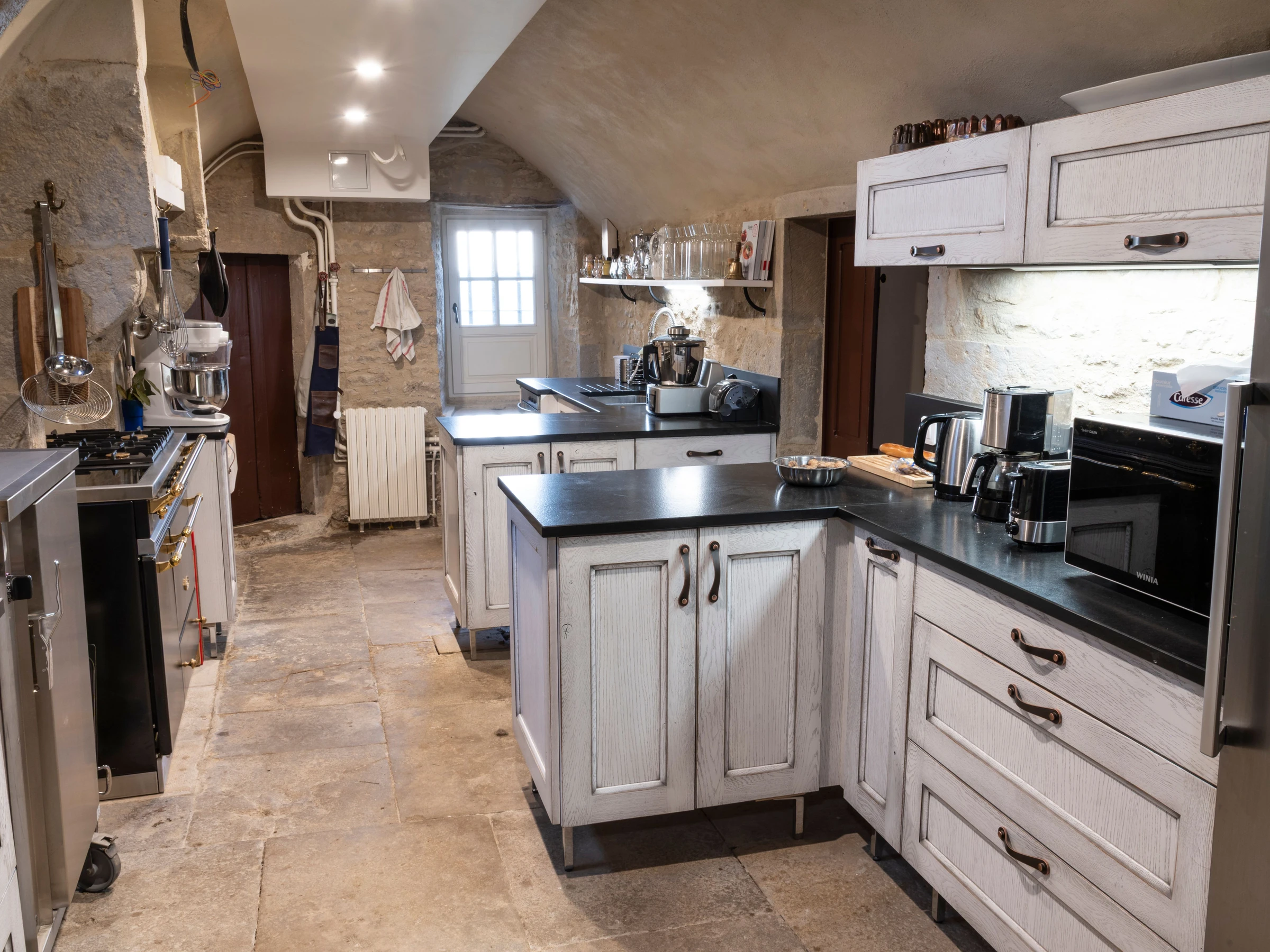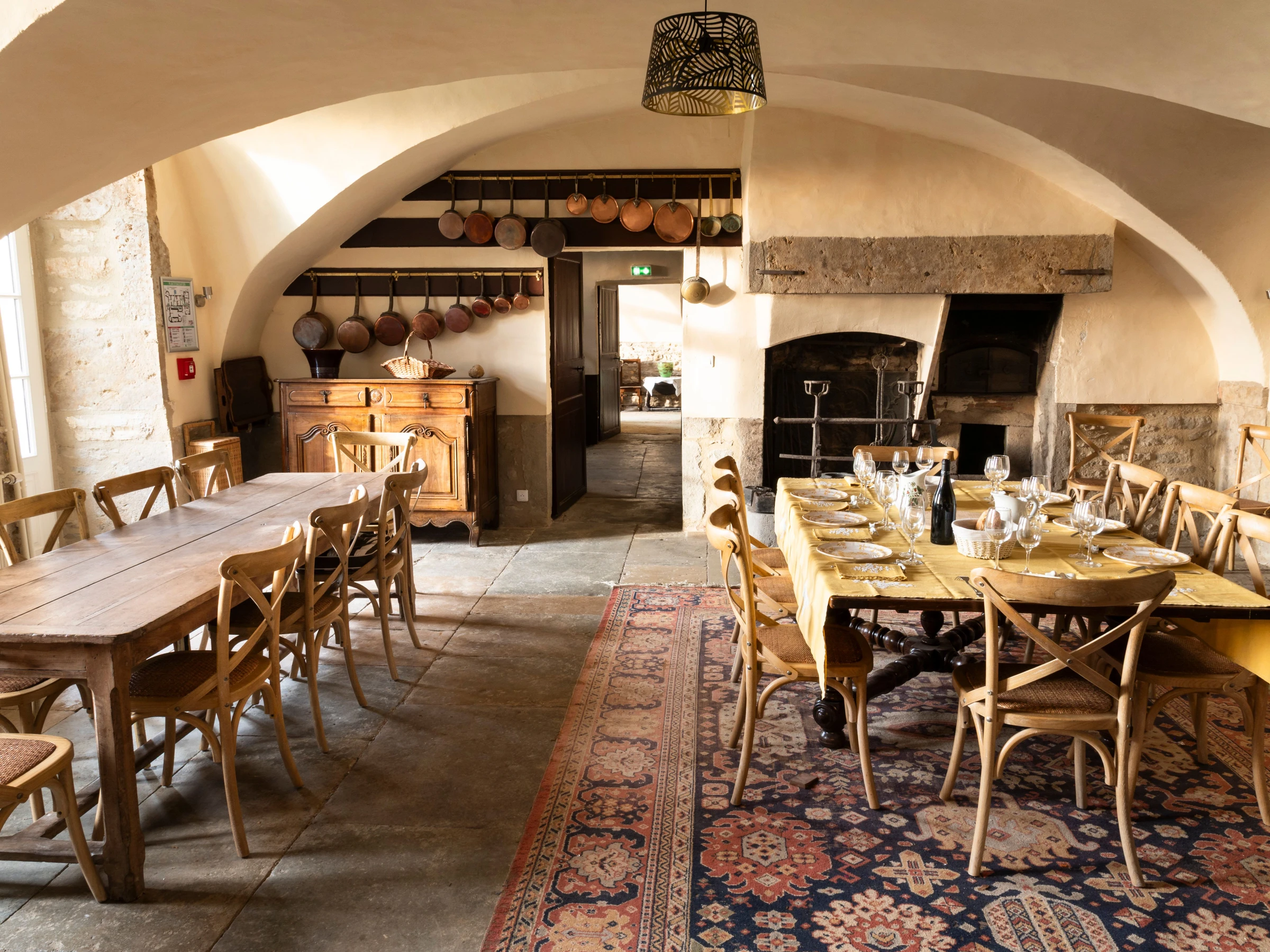 Rez-de-jardin : grande cuisine professionnelle entièrement équipée, deux salles à manger (jusqu’à 50 personnes), salon d’accueil, salle de réunion, sanitaires dont WC PMR, chambre accessible PMR avec salle de bain adaptée. Lingerie équipée et ascenseur.