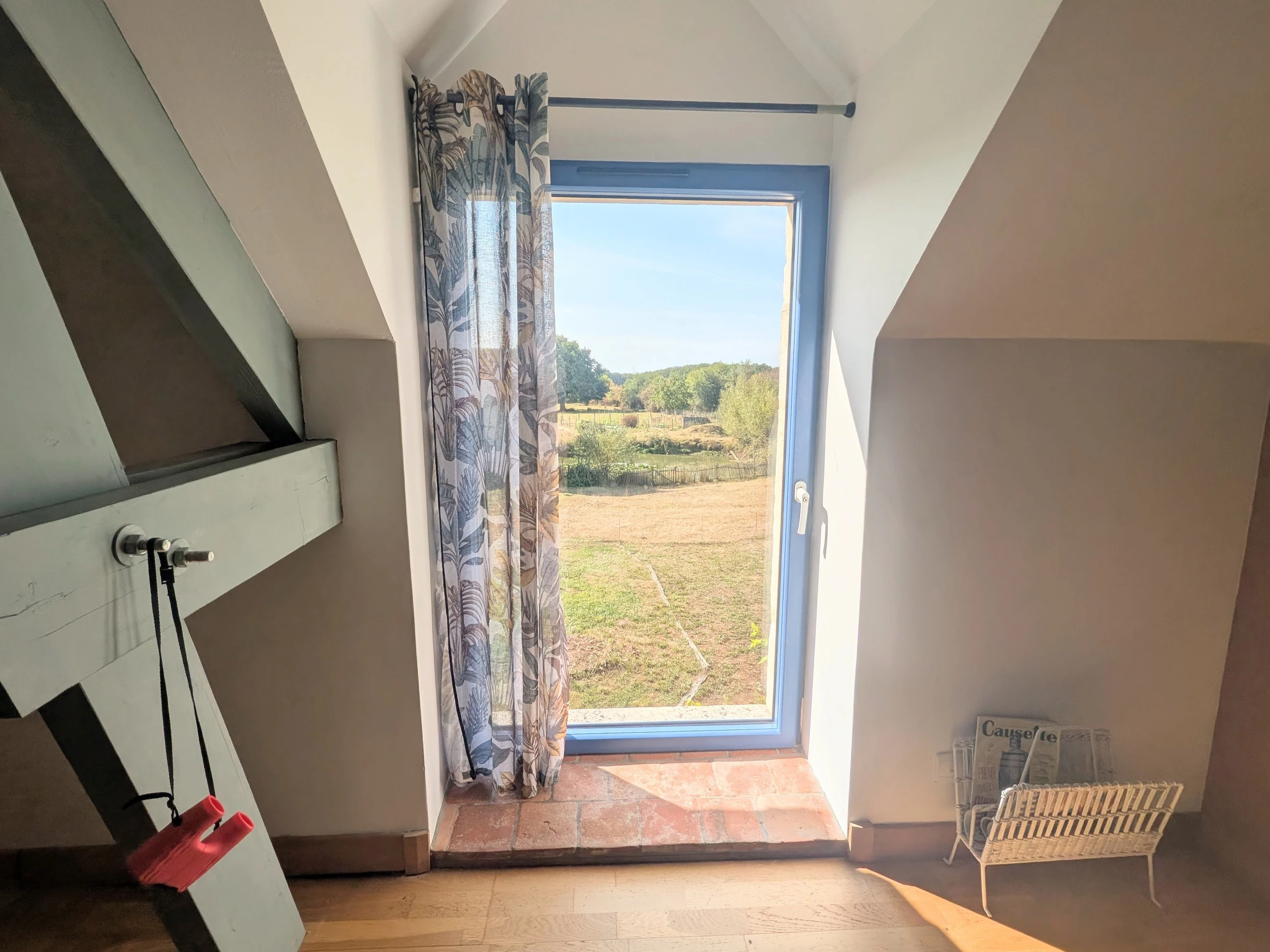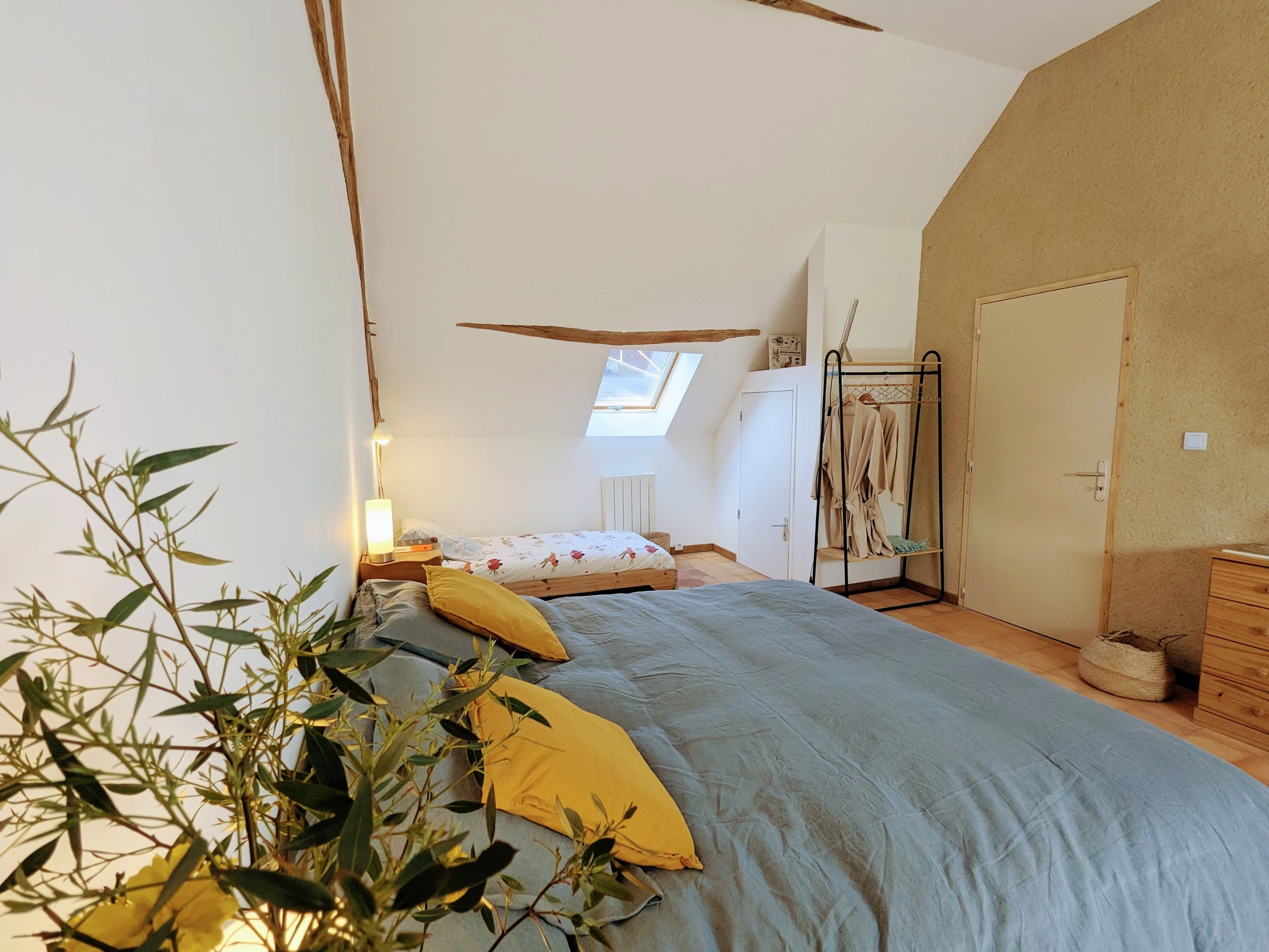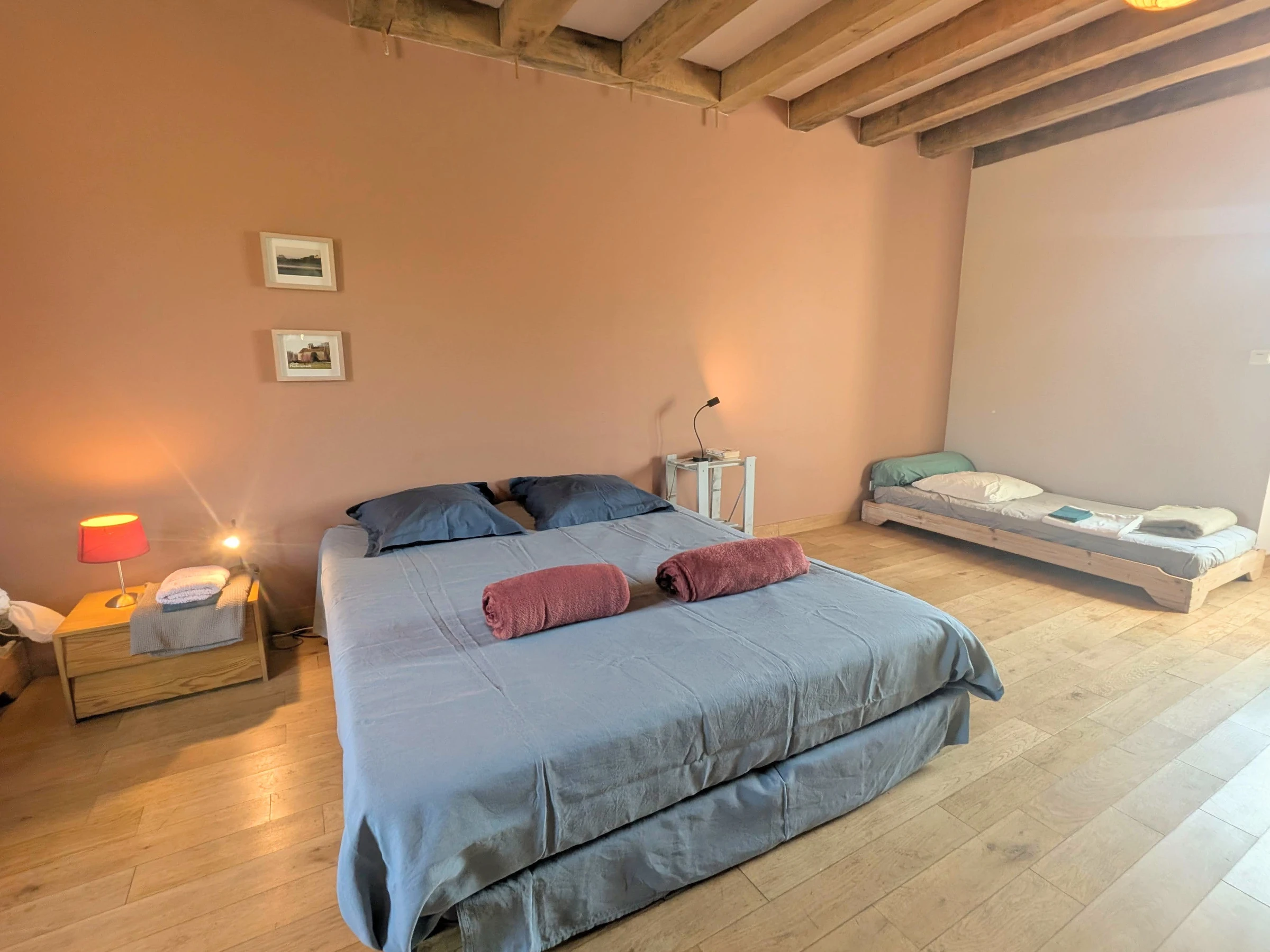 Au 1er étage : palier avec vue sur mare (clôturée), 1 chambre avec un lit 2 pers. de 160 x 200 cm, 1 chambre avec avec 2 lits 1 pers. jumelables (90 x 190 cm), 1 chambre avec 1 lit 2 pers. (140x 190 cm) et 1 canapé-lit d'appoint (type clic-clac avec 2 vrais matelas 70 x 190 cm). 1 chambre avec 2 lits une pers., jumelables (90 x 190 cm).