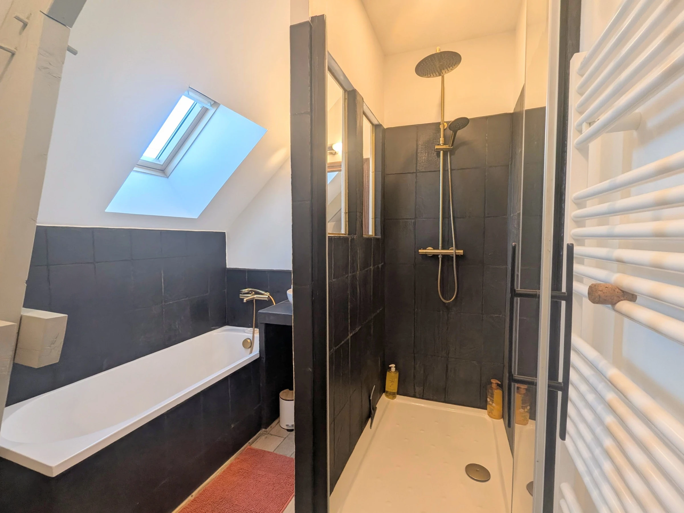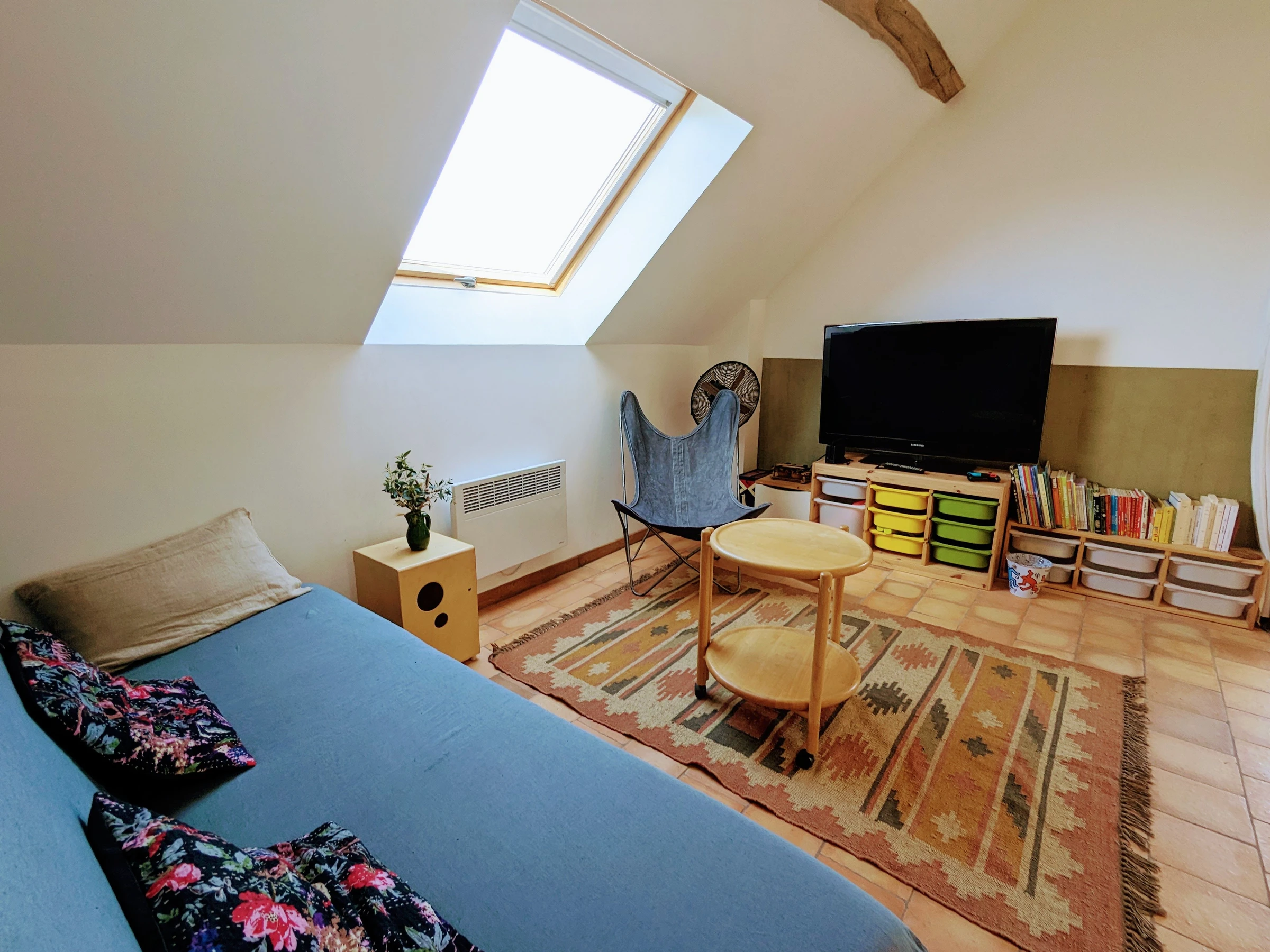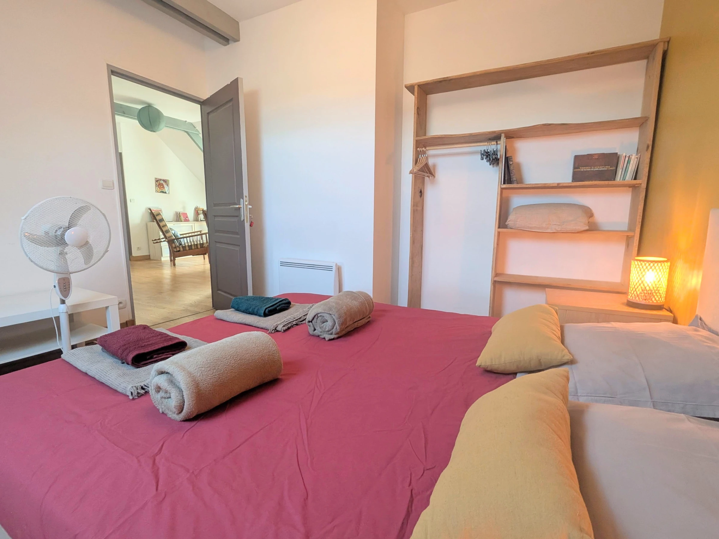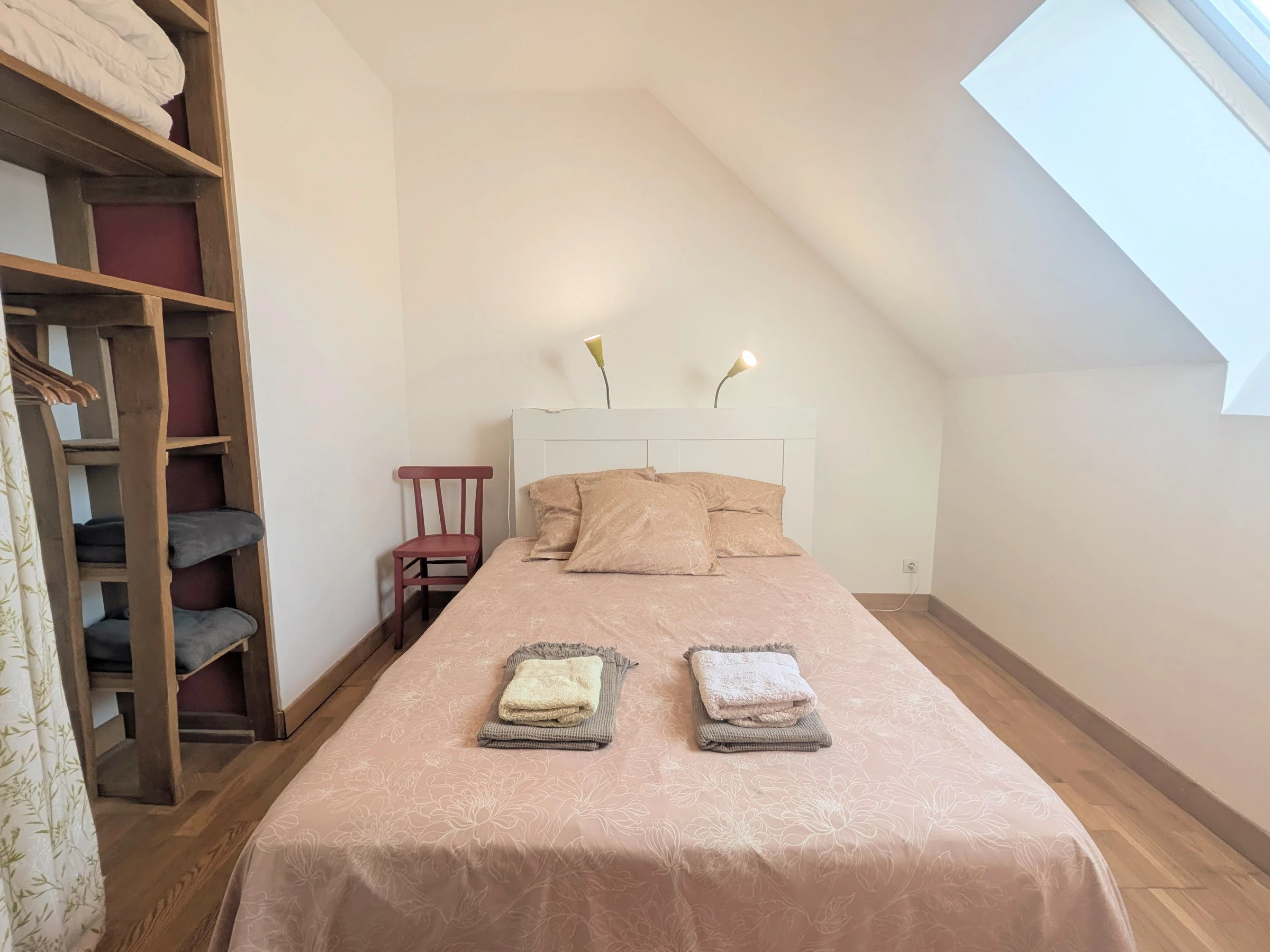 A l'étage: palier avec canapé convertible (couchage d'appoint, + TV, jeux, bibliothèque). Salle de bain + baignoire avec colonne de douche, sèche serviettes, 1 chambre avec 1 lit king size 180 x 200 cm soit 2 lits de 90x200 rassemblé pour former le lit 2 personnes) et 2 lits de 80x190 cm.