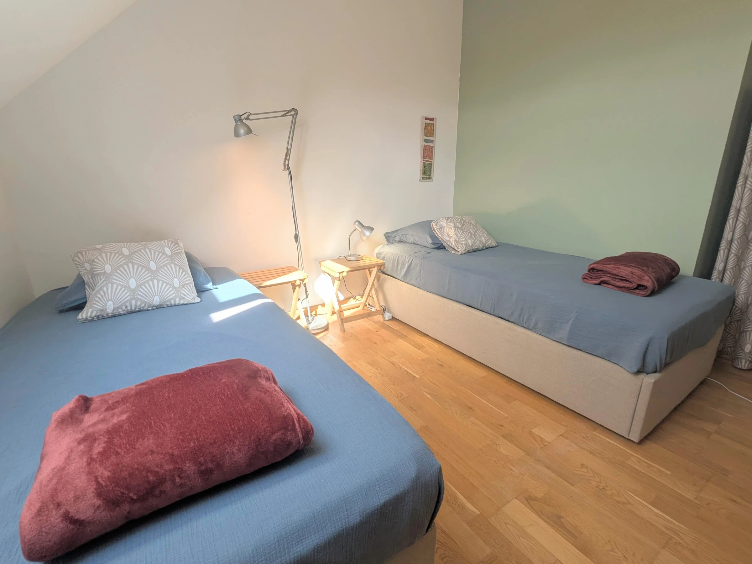 Chambre RDC: 2 lits 1 pers. de 80x200 cm jumelables en un grand lit 180x200 et 2 lits simples 90x190 cm, dit "Suedois" type lit-tiroirs, à 24 cm du sol; chambre avec salle d'eau+wc attenants.