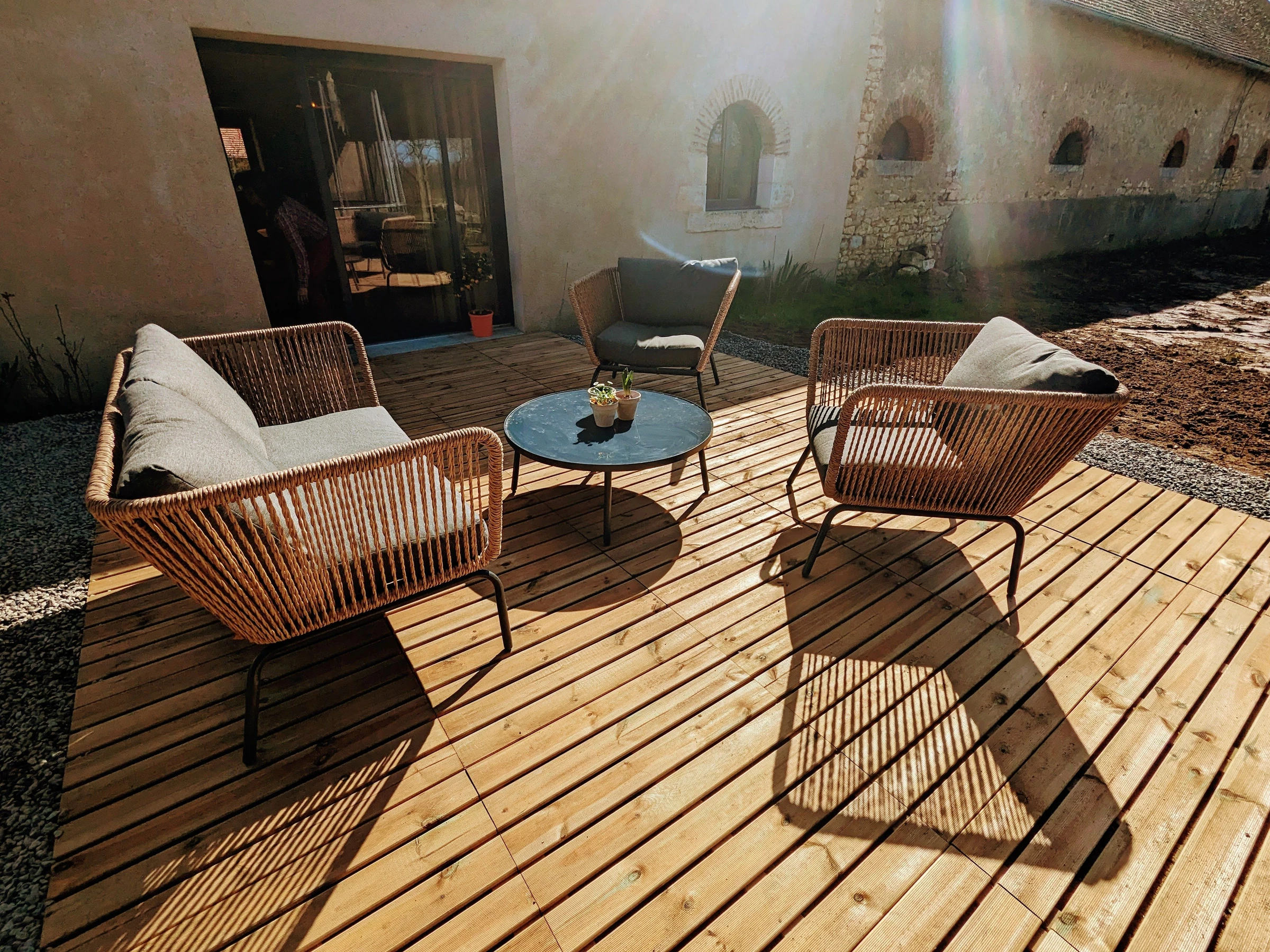 Jardin clos (grillage à mouton) tranquille, privatif avec terrasse, verger, BBQ, set de Badminton, Molky, Hamac, voiles d'ombrage.