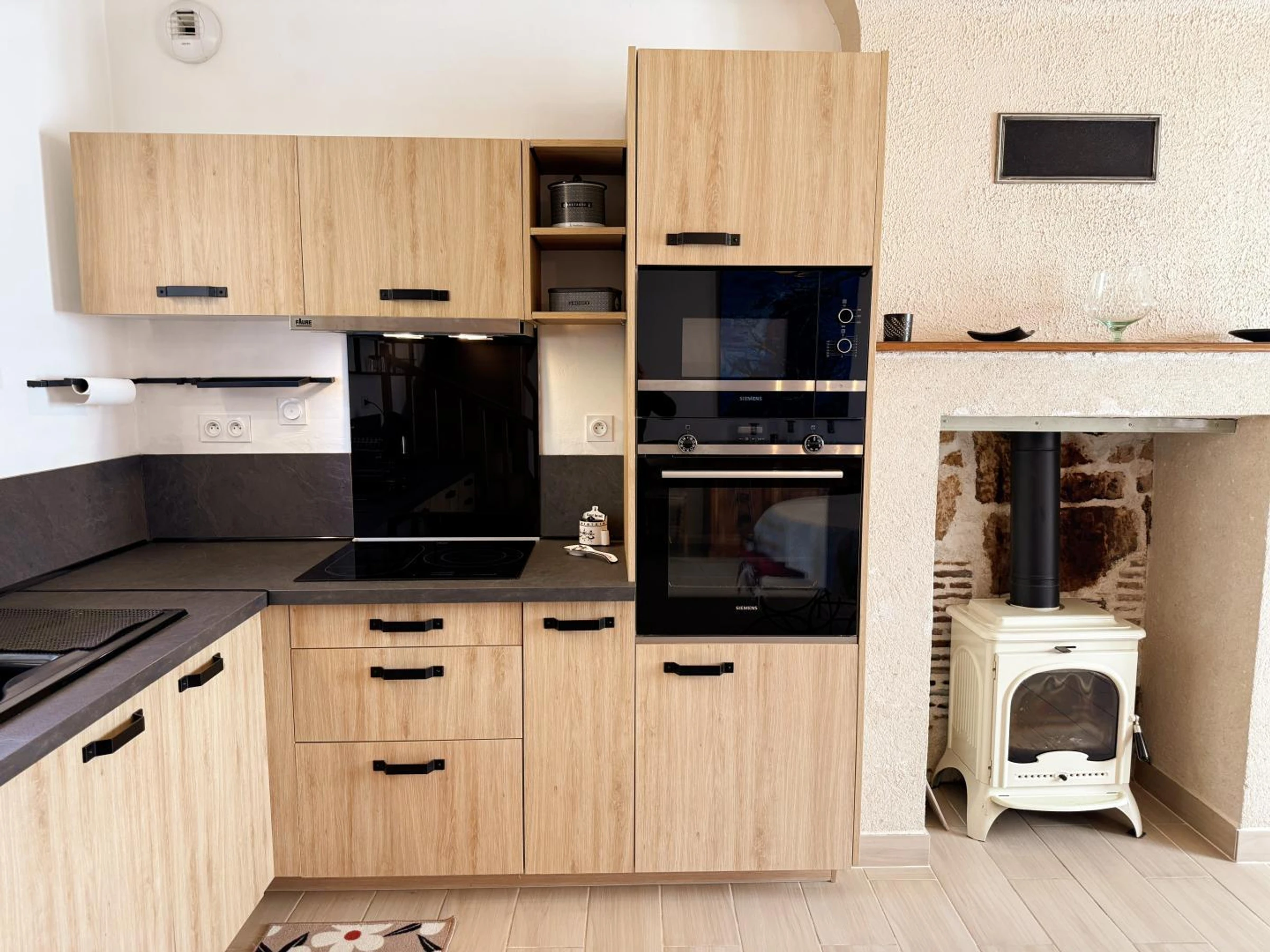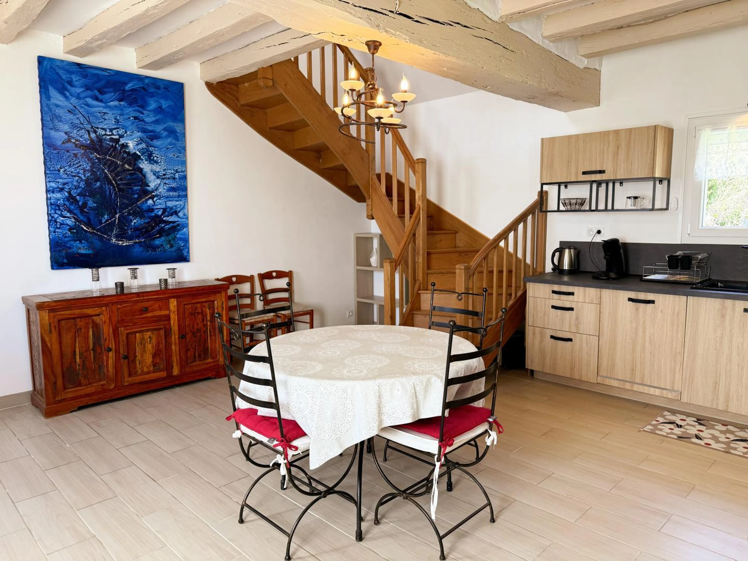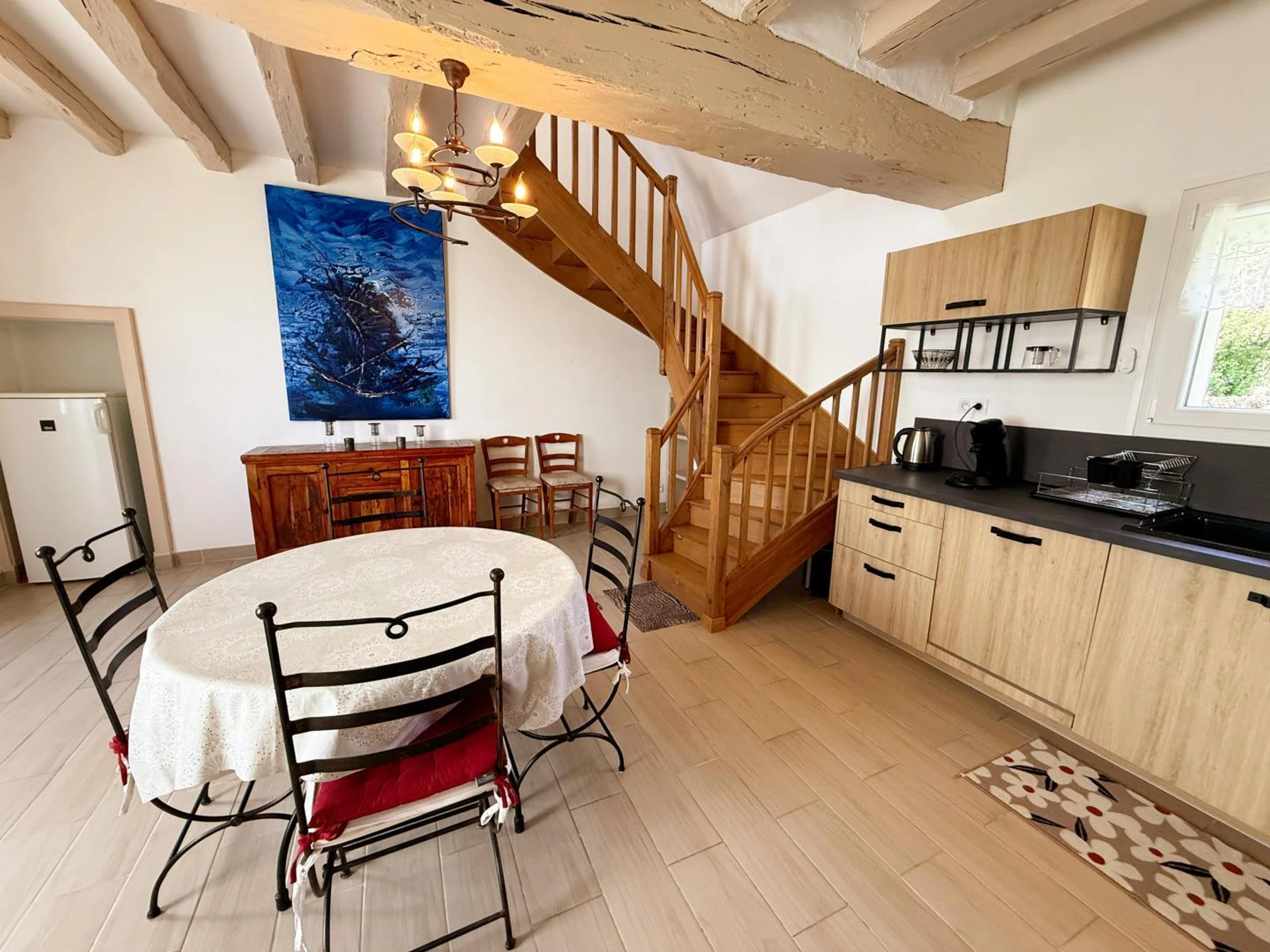 Au rez-de-chaussée, vous profitez d'un séjour convivial avec poêle à bois, d'une cuisine entièrement équipée (plaque induction 3 feux, cafetière Senseo), ainsi que d'un salon avec TV. Une salle d'eau avec douche et WC complète ce niveau.