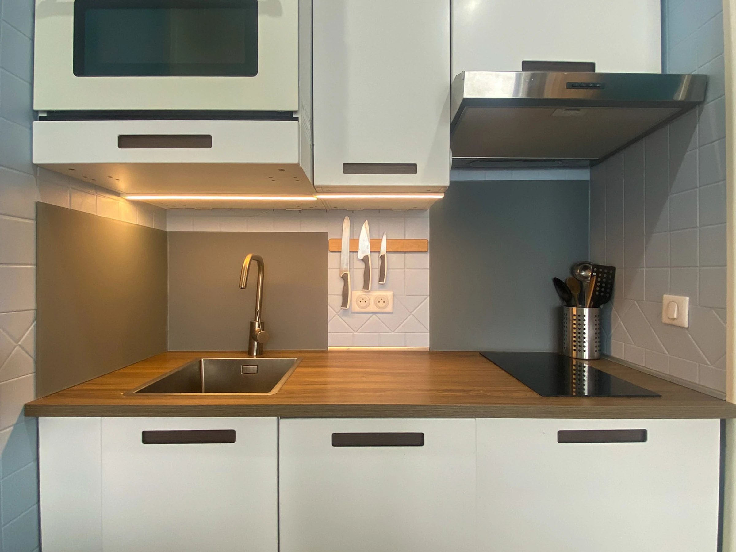 Il est équipé de plaques vitrocéramiques, d'un combiné four et micro-ondes, d'un lave vaisselle et d'un réfrigérateur.