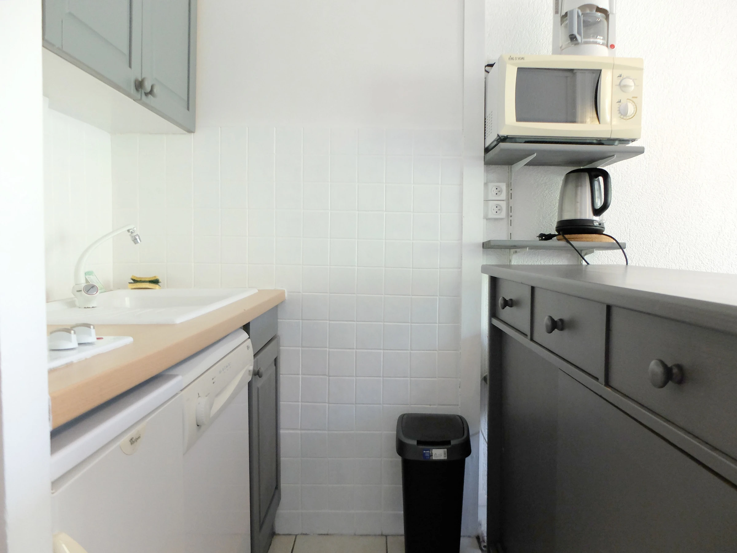 Kitchenette avec plaques électriques, micro-ondes et lave-vaisselle