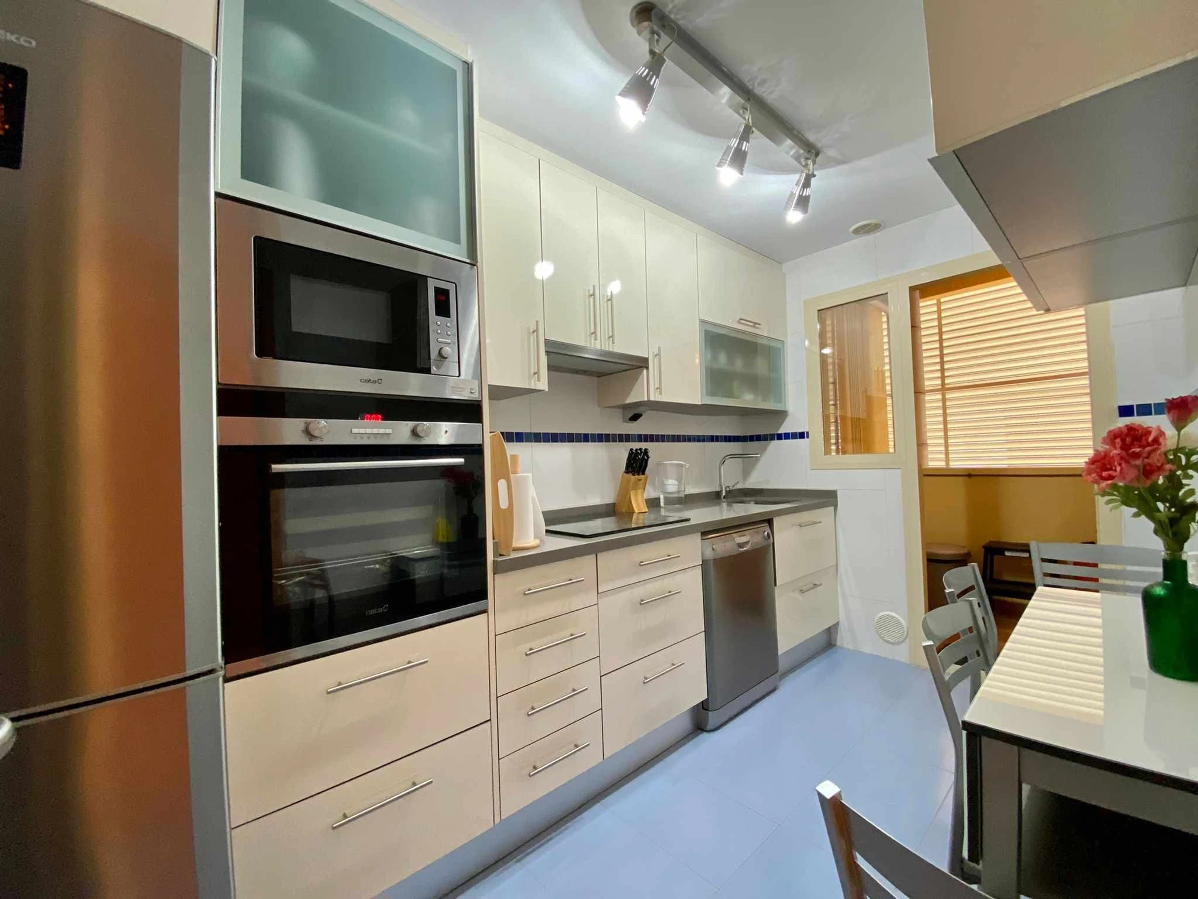 La cuisine indépendante, à vitrocéramique, est équipée avec réfrigérateur, micro-ondes, four, congélateur, ustensiles/cuisine, cafetière, grille pain et bouilloire.