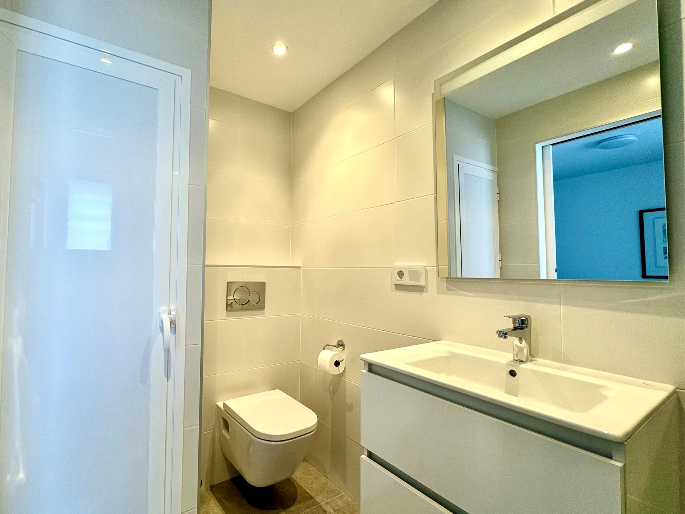 * salle de bains attenante avec lavabo simple, douche, toilettes et