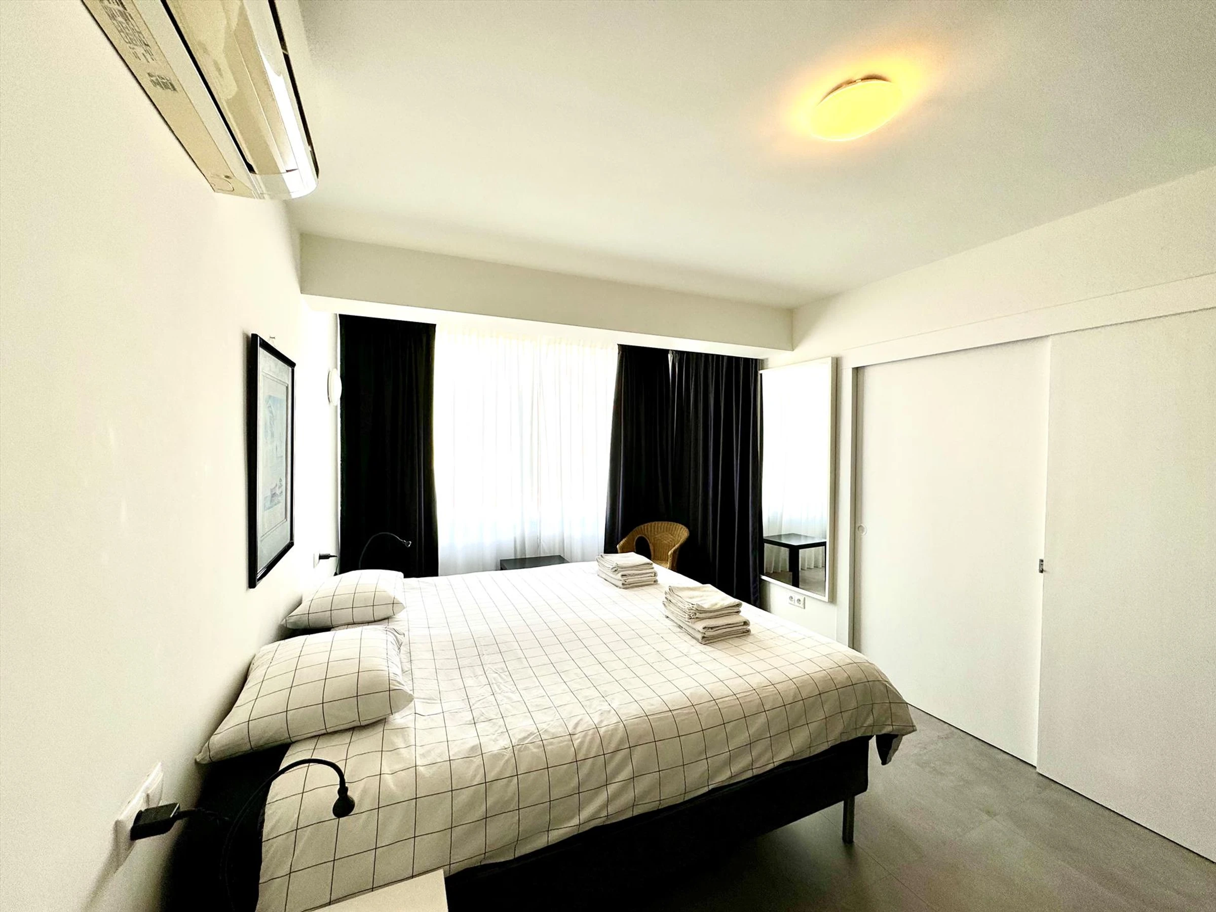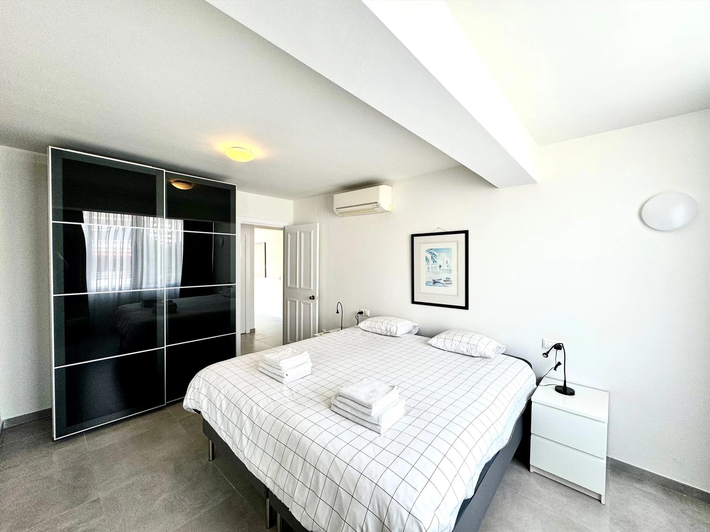 * chambre avec climatisation, lit double et salle de bains attenante