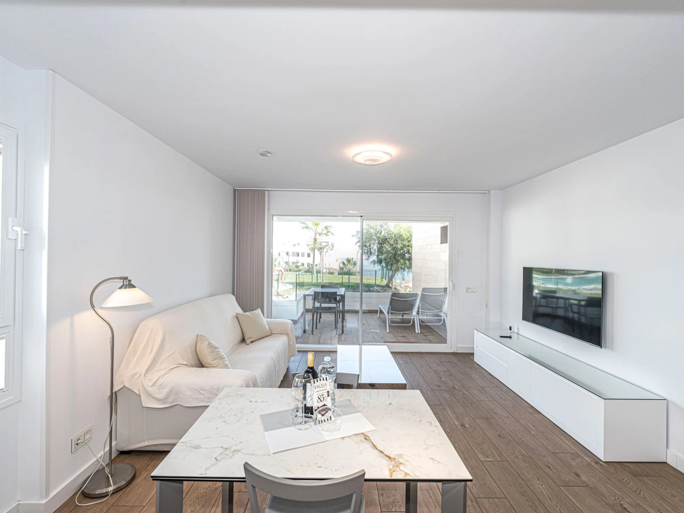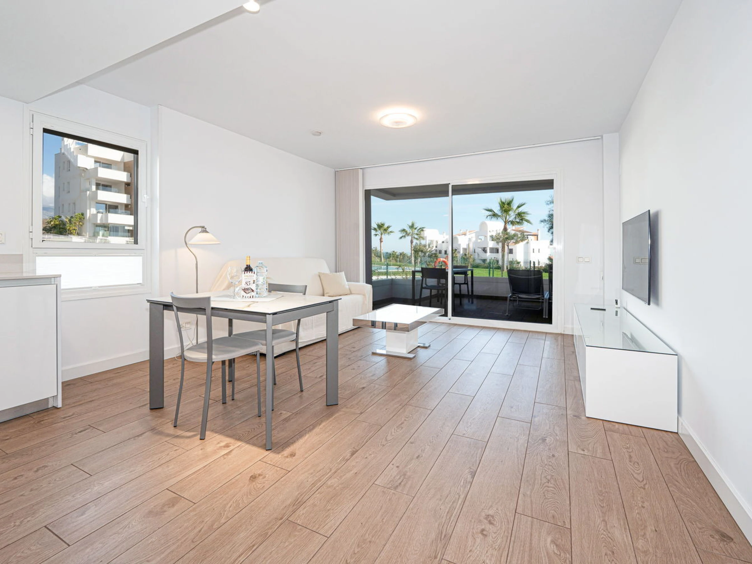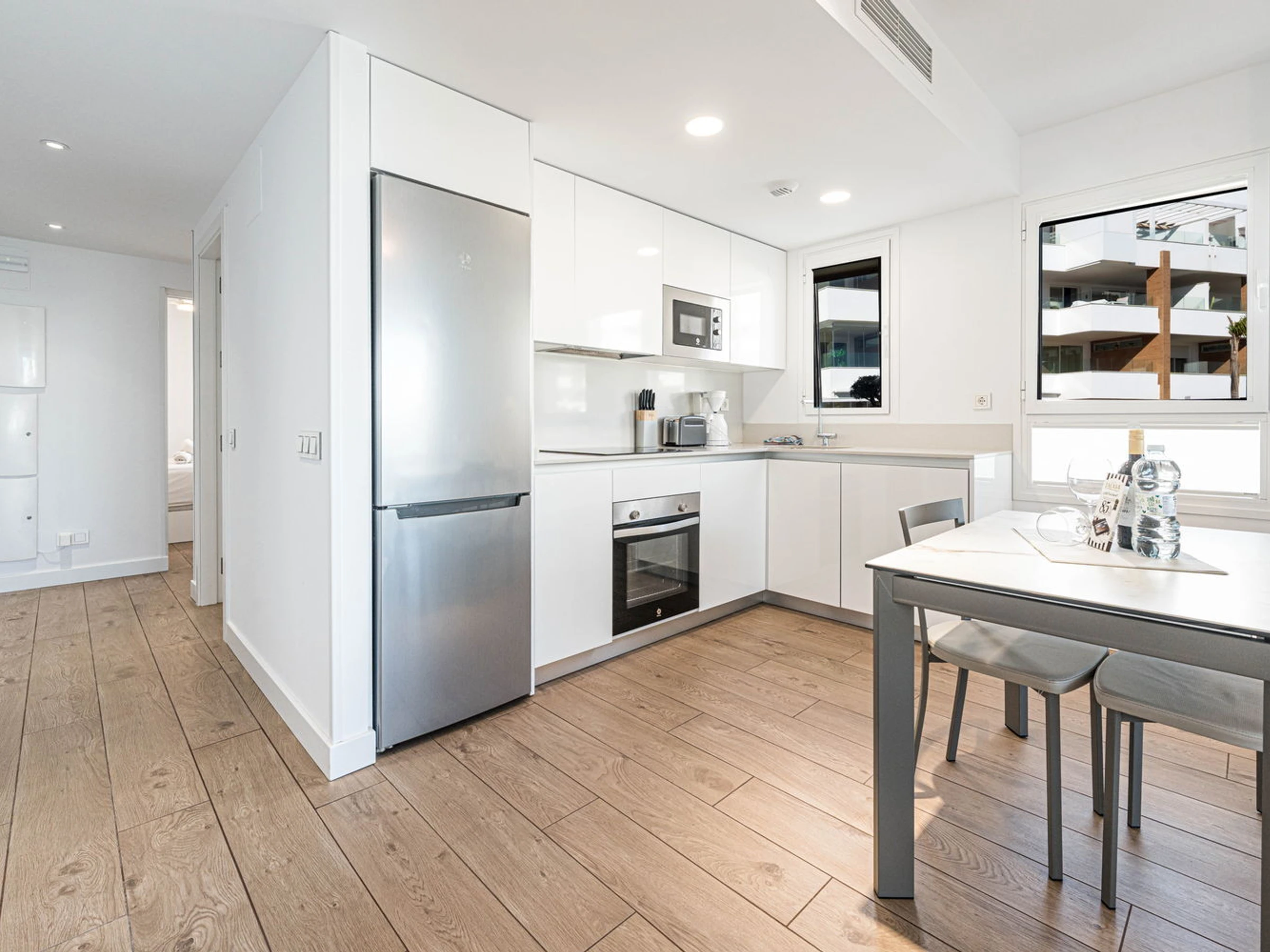 La Propriété : Appartement neuf, conçu pour un maximum de 2 personnes. Il dispose d'une chambre principale avec un lit double et d'une salle de bain moderne avec douche à l'italienne. La zone de vie intègre un salon-salle à manger avec une cuisine ouverte haut de gamme, équipée de détails de qualité : ensemble de couteaux Russell Hobbs, machine à café L'Or Barista, lave-vaisselle et lave-linge. Tout respire le style et la fonctionnalité.