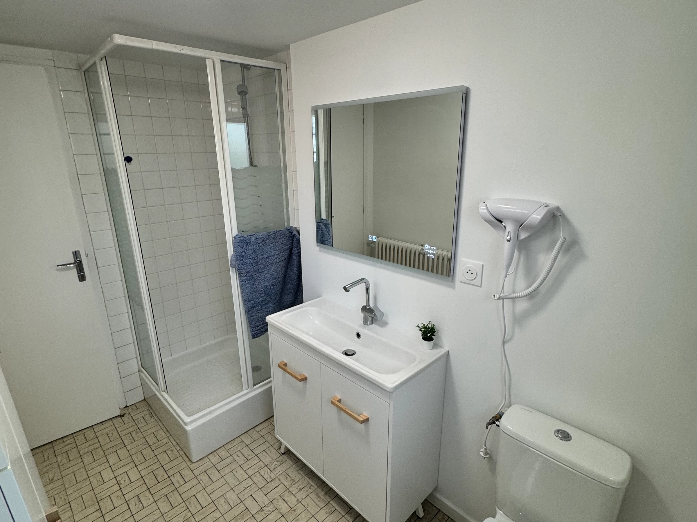 Une chambre avec lit double (140) et salle de douche avec miroir connecté et wc.