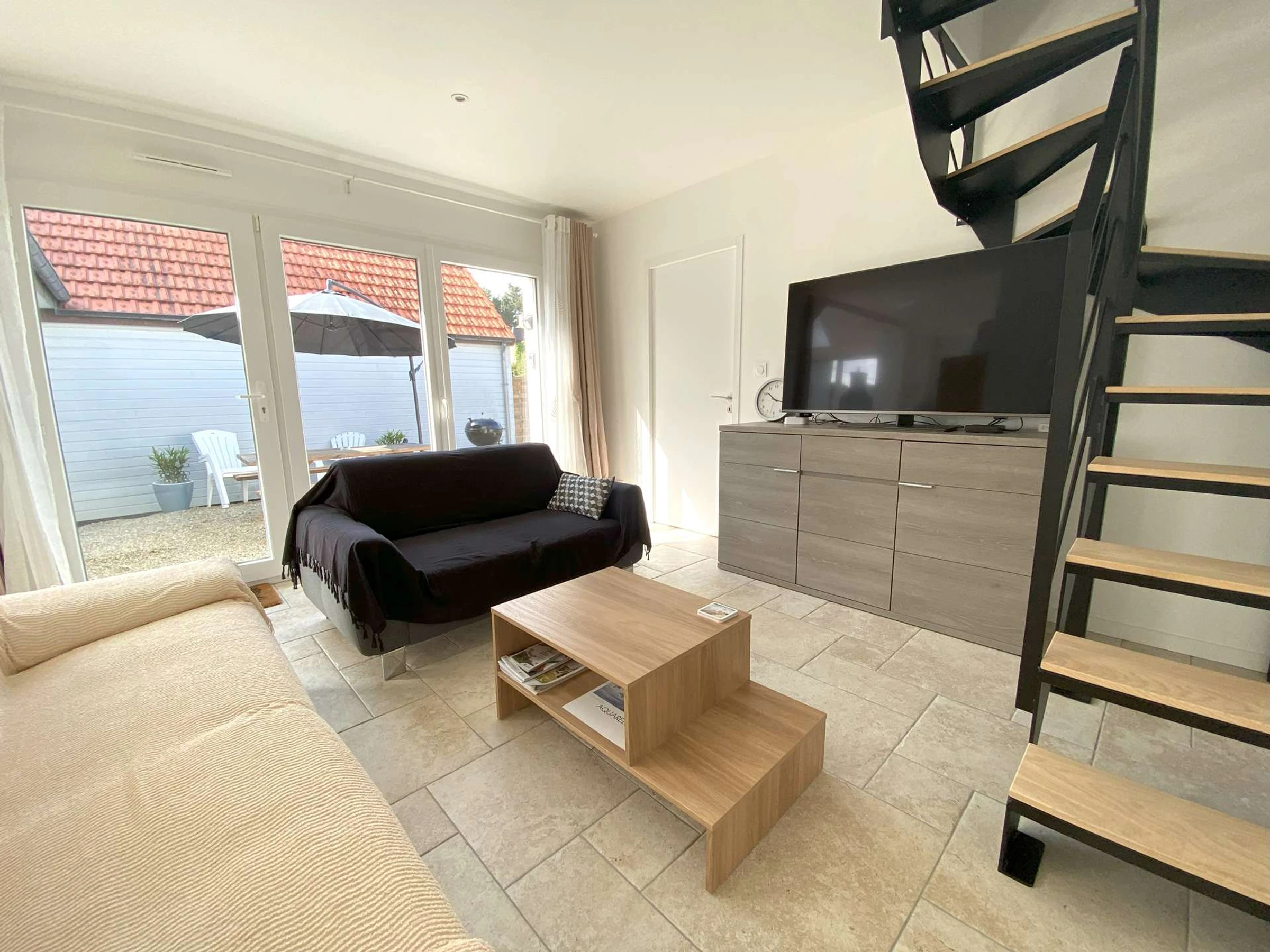 1 séjour/salon avec canapé, TV, donnant sur une terrasse gravillonnée exposée au sud -