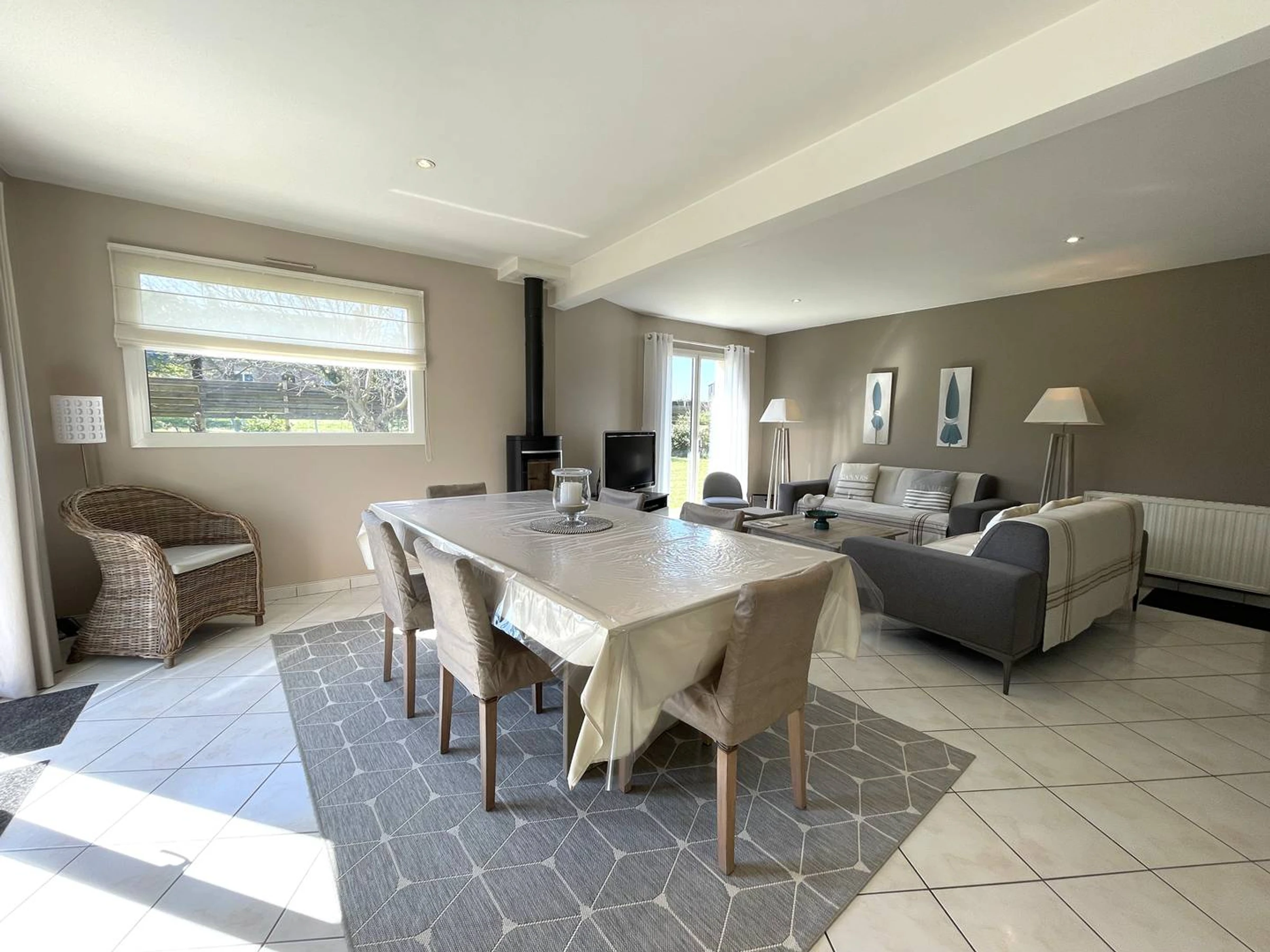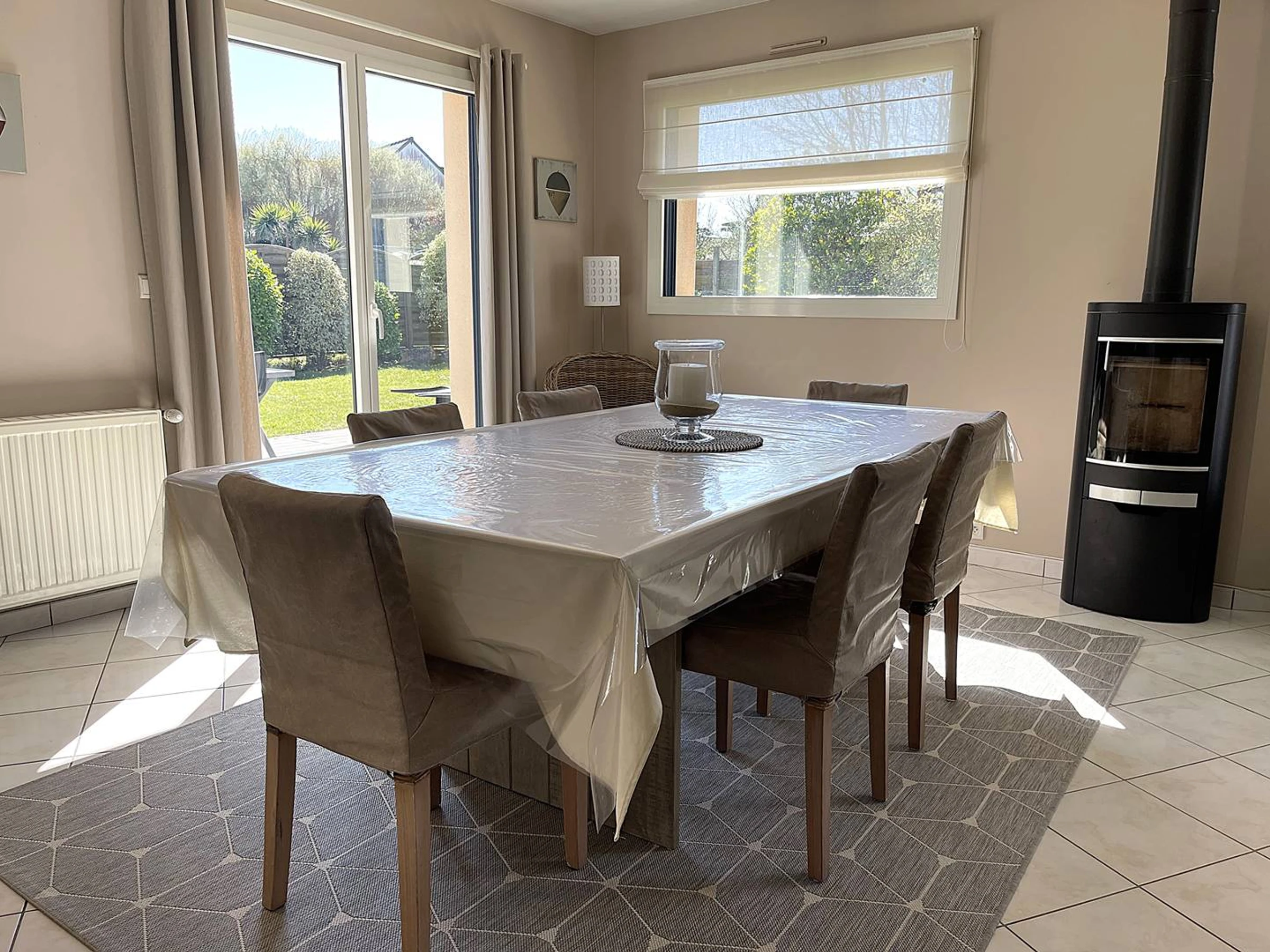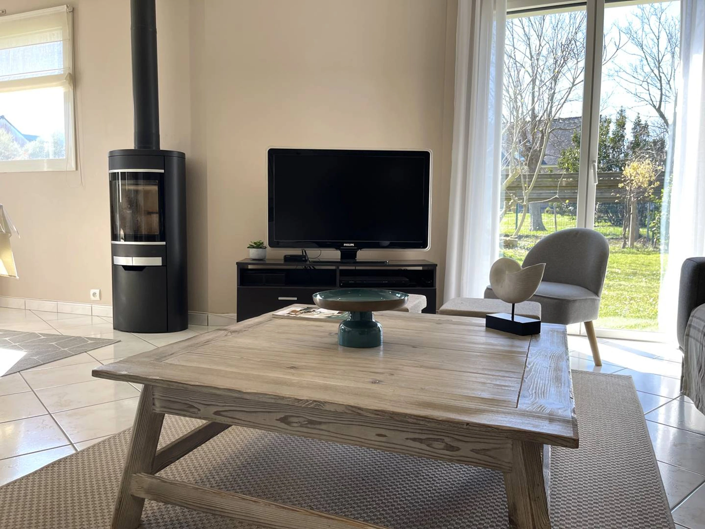 1 grand séjour/salle à manger (46m2 environ) avec coin salon, TV, lecteur DVD, poêle à bois, donnant sur la terrasse et jardin -