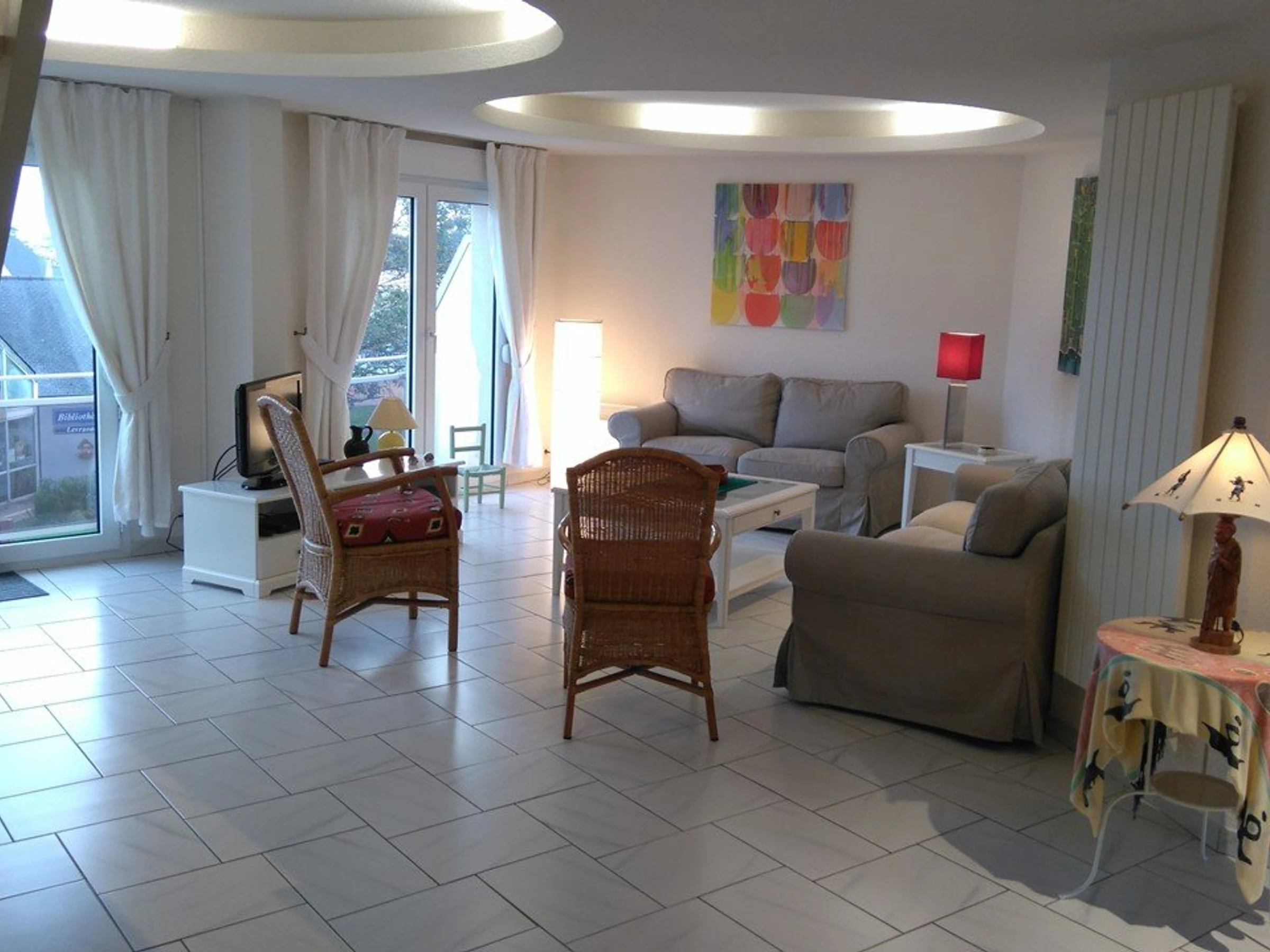 N°745 - Superbe appartement Duplex de 105 m2 VUE MER ET SITUATION EXCEPTIONNELLE, avec WIFI gratuit, 2 terrasses, au centre de Trégastel, aux 2ème étage de la résidence Ar Gouélani, à 200m de la Baie Sainte-Anne et à 10m des commerces comprenant :