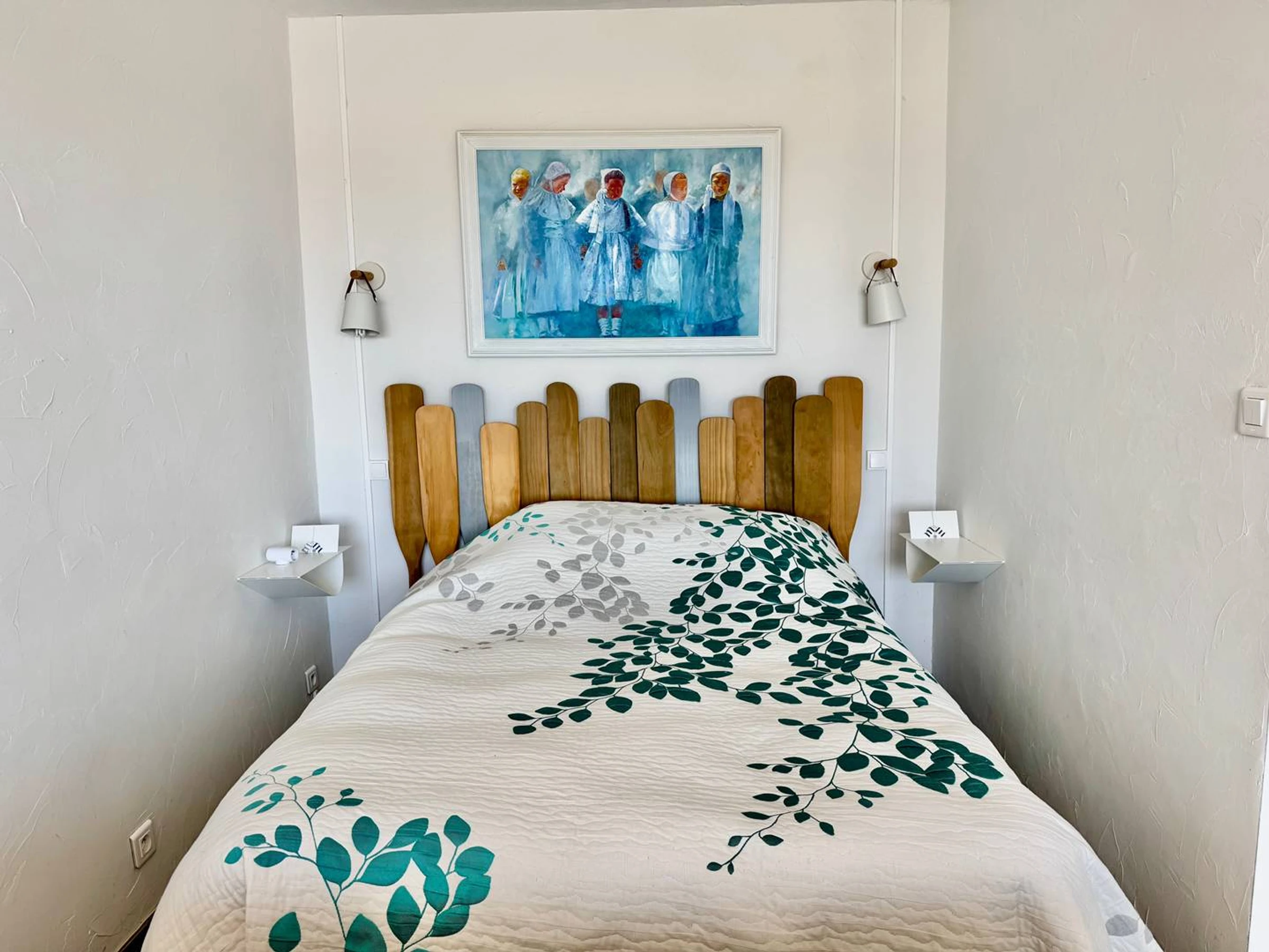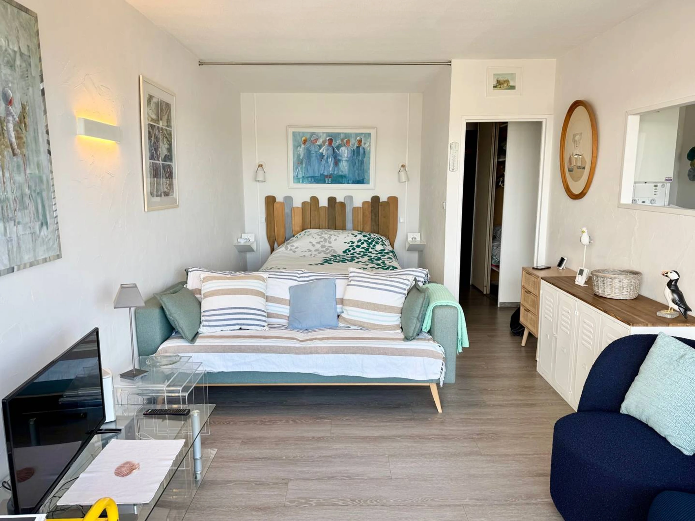 1 séjour avec une partie chambre avec 1 grand lit pour 2 personnes avec couette, et une partie salon avec canapé, TV, donnant sur une terrasse-véranda VUE SUR MER -