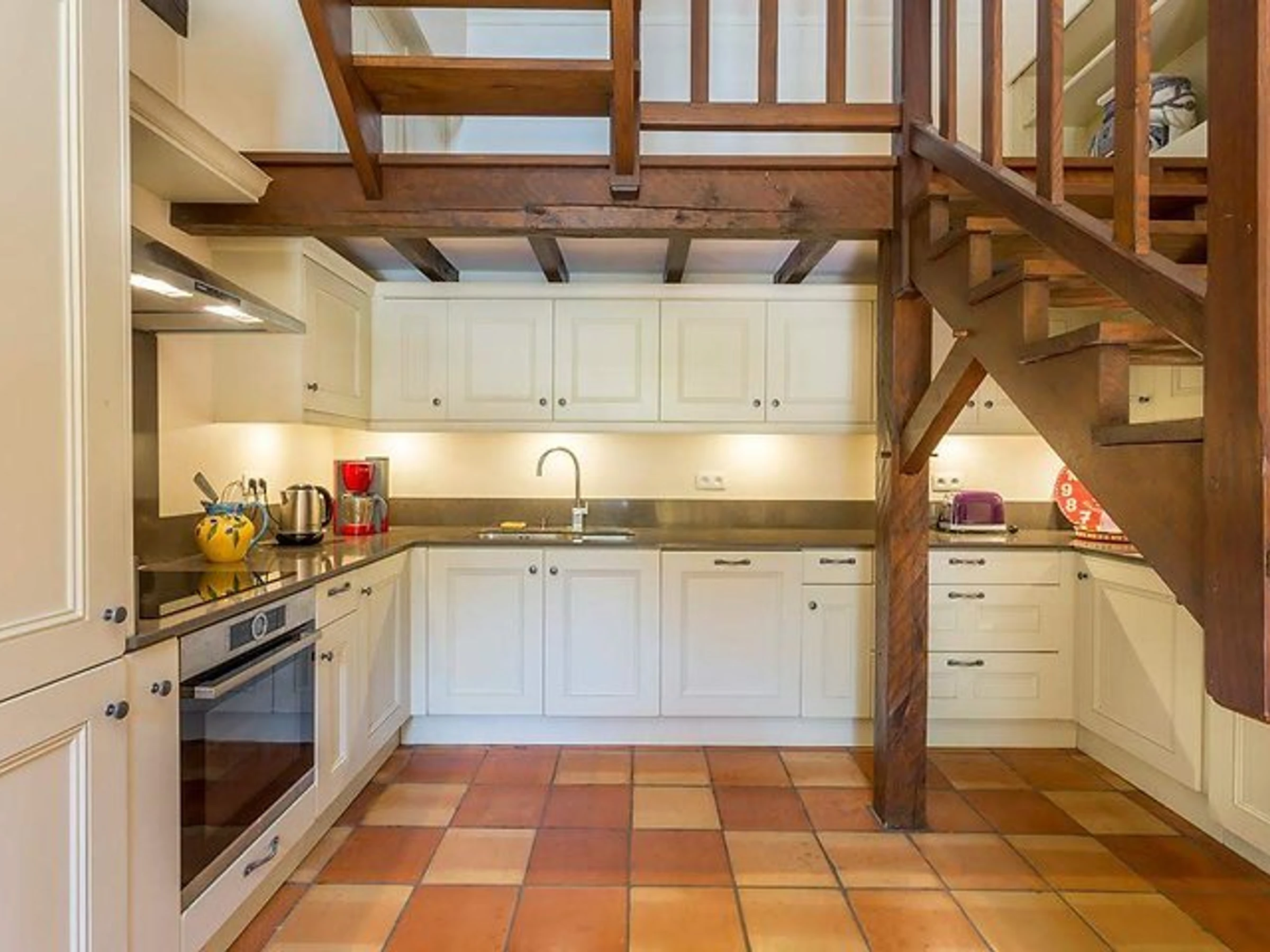 Depuis la cuisine, un escalier mène à une bibliothèque en mezzanine idéale pour se détendre. (Veuillez noter : pour les parents avec de jeunes enfants, cet escalier n'a pas de rampe sur la première montée.)