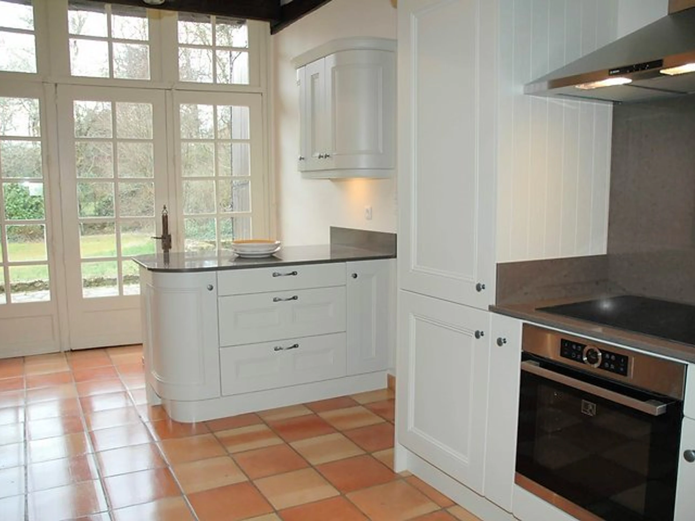 De la salle à manger, deux marches nous mènent à la cuisine moderne avec accès sur une première terrasse extérieure.