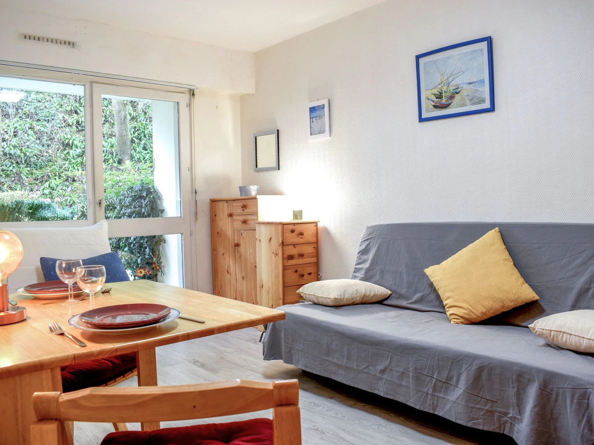 Studio 25 m2, au rez-de-chaussée, situation est. Séjour/salle à manger avec 1 divan-lit double (140 cm), coin repas et TV (écran plat). Sortie sur la terrasse. Coin cuisine (2 plaques de cuisson, grille-pain, bouilloire électrique, four micro-ondes, cafetière électrique). Douche/WC. Terrasse 10 m2. Meubles de terrasse. Vue sur la forêt. A disposition: Internet (Connexion WIFI, gratuit). Veuillez noter: logement non-fumeur. Détecteur de fumée. Annonce d'un particulier (art 155, IV du CGI).