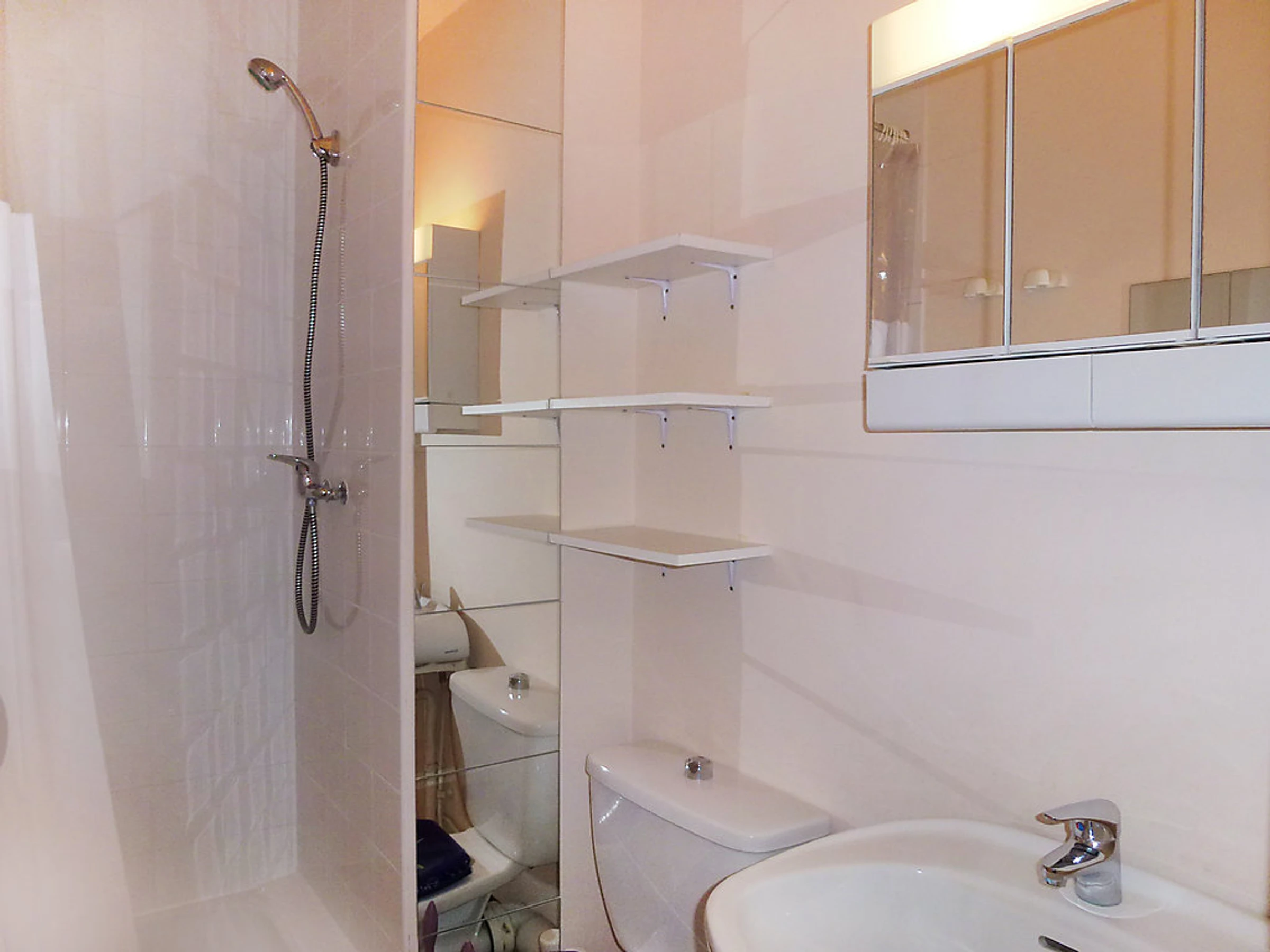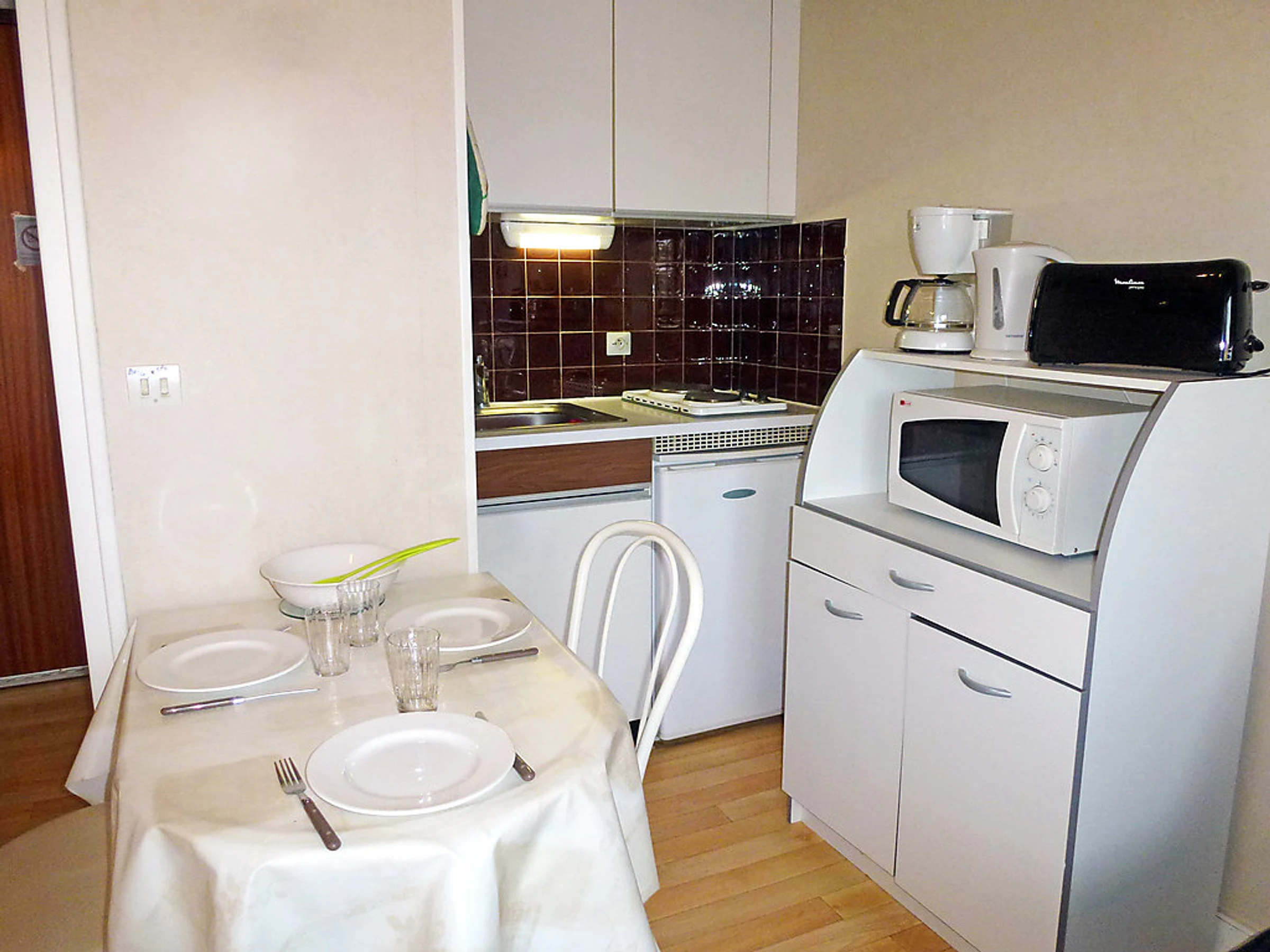 Studio 23 m2 au 3ème étage. Bien convenant à 2 adultes + 1 enfant. Aménagement simple et fonctionnel: séjour/salle à manger avec 1 divan-lit double (1 x 130 cm), 1 lit pliant (90 cm), TV et radio. Coin cuisine (2 plaques de cuisson, four micro-ondes). Douche/WC. Balcon 9 m2. Mobilier de balcon. Vue sur le jardin et les alentours. A disposition: fer à repasser. Internet (Connexion WIFI, en sus). Veuillez noter: logement pour non fumeurs. Détecteur de fumée, sans ascenseur.