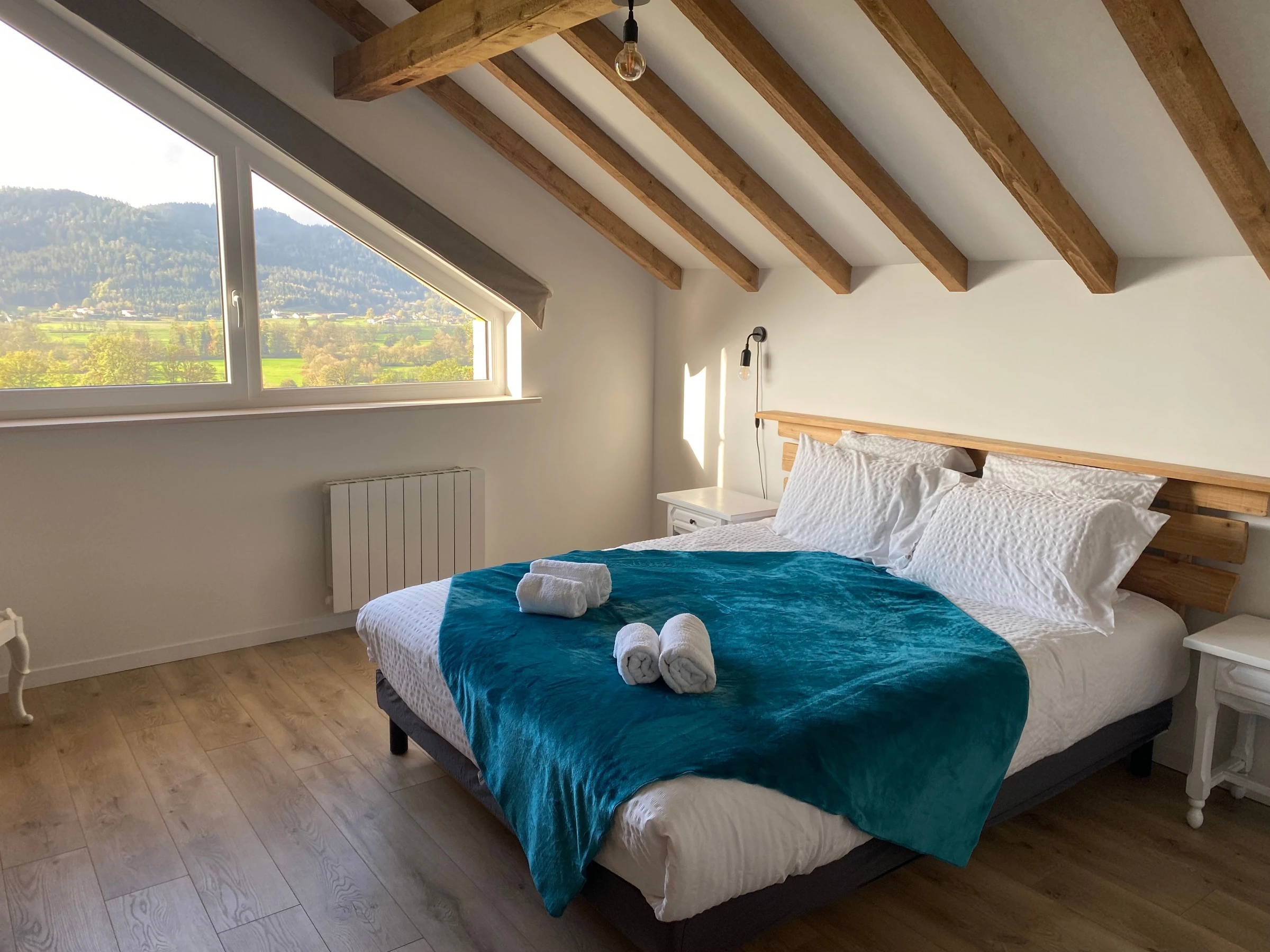 Chambre 4 et Chambre 5 : chacune avec 1 lit 160x200, offrant une vue panoramique à 180° sur la vallée et les montagnes.
