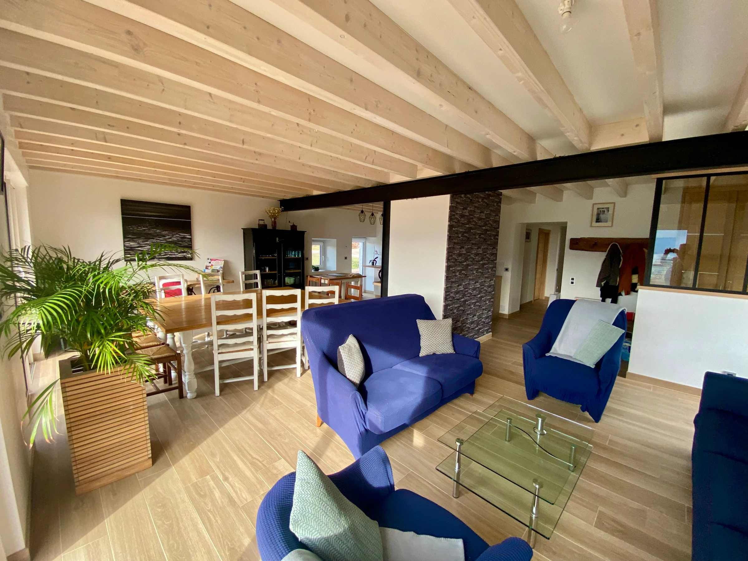 Grande pièce de vie lumineuse avec cuisine entièrement équipée, espace repas convivial et salon confortable.