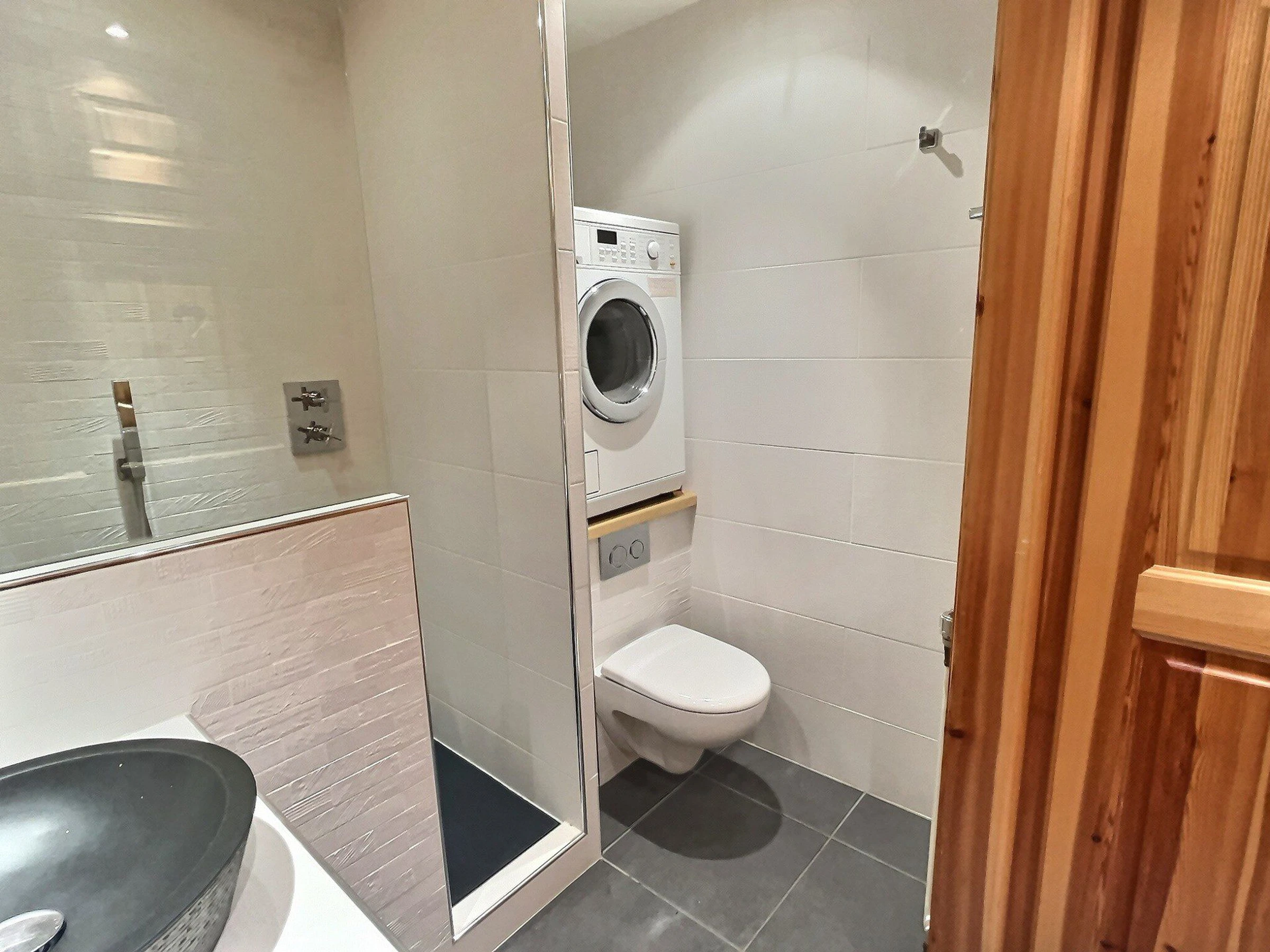 Il est équipé de plaques vitrocéramiques, d'un combiné four et micro-ondes, d'un lave vaisselle et d'un réfrigérateur.