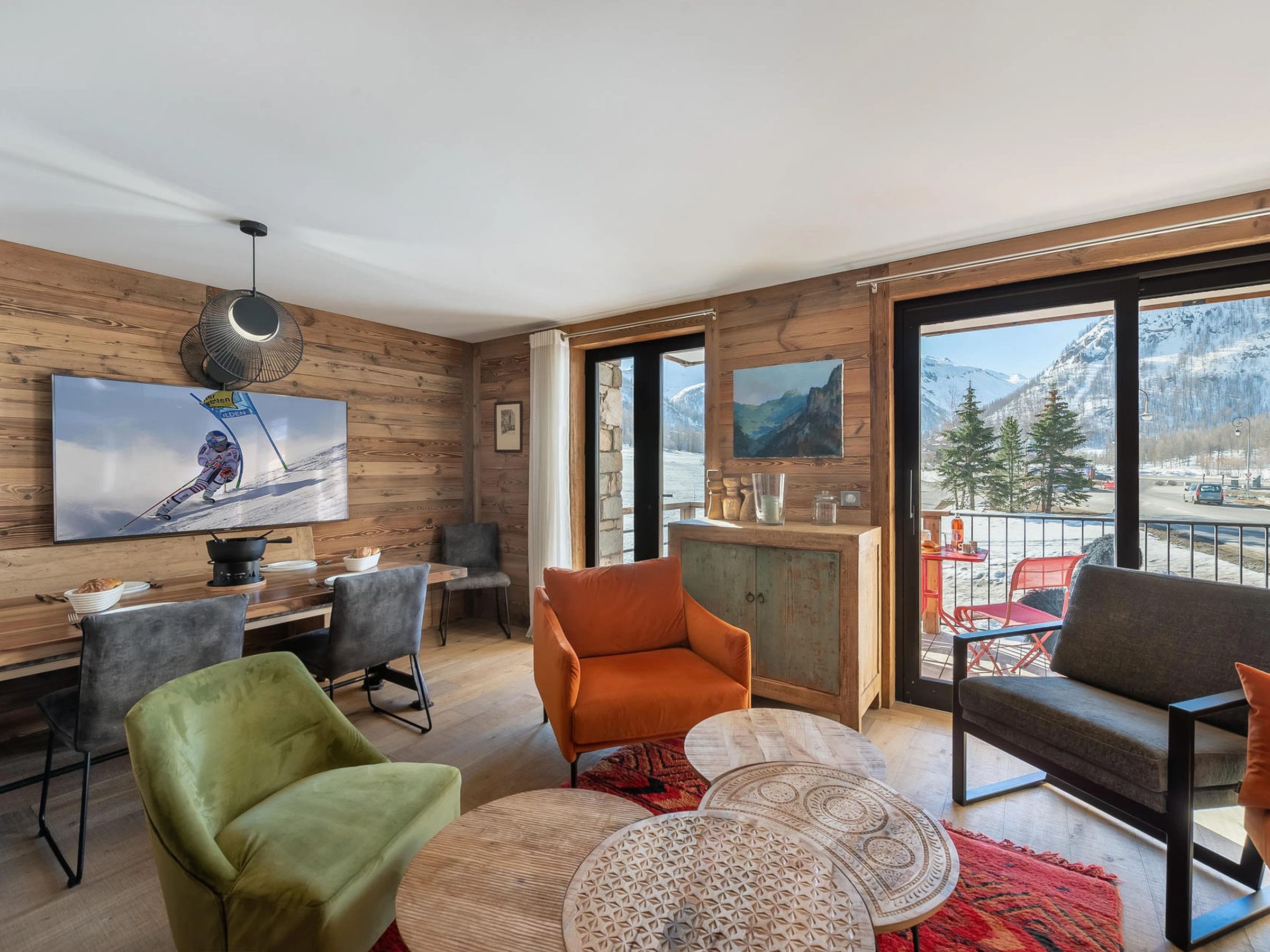 Cet appartement de 87m2 offre un espace de vie convivial et lumineux grâce à ses grandes ouvertures qui donnent sur les sommets de Val d’Isère.