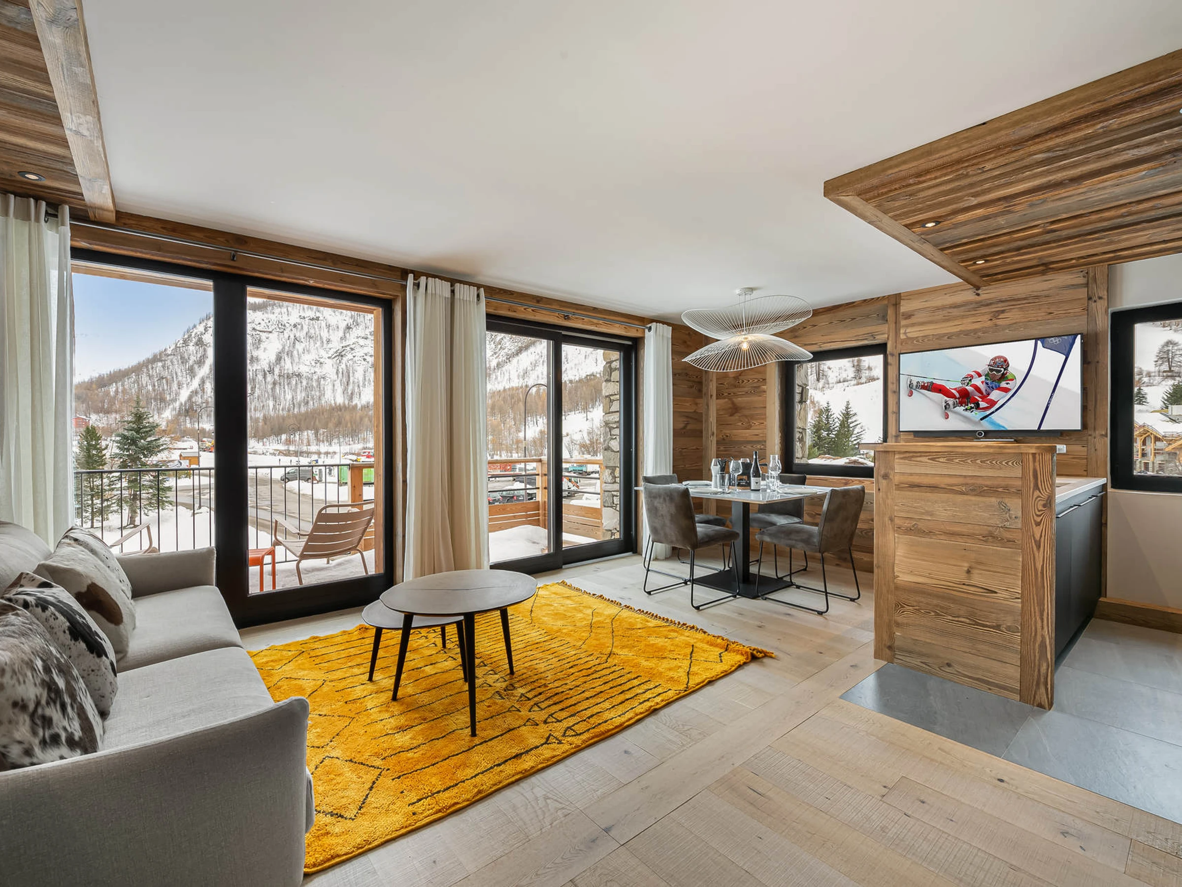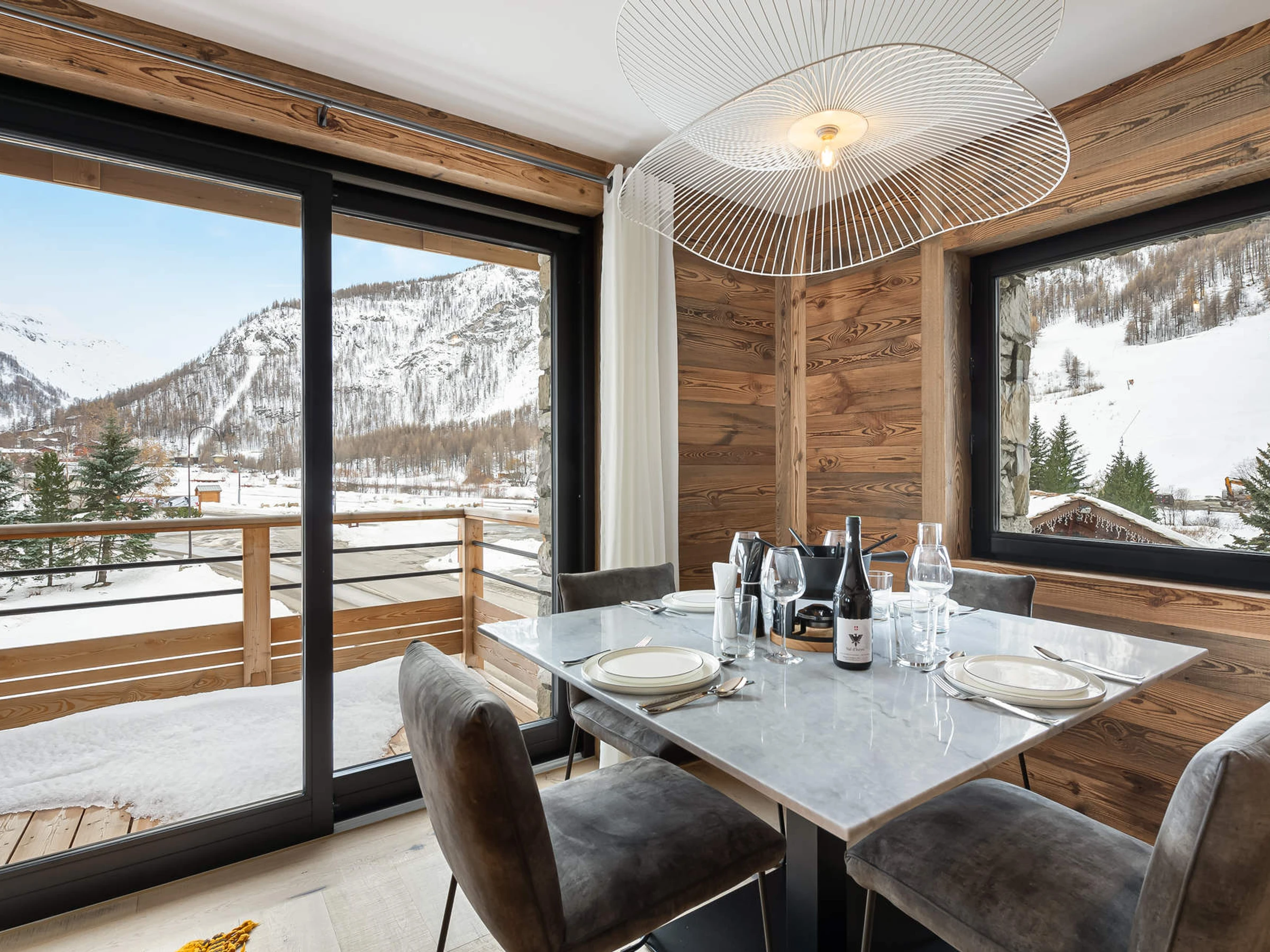 Dans l’espace de vie, des grandes ouvertures qui vous permettrons d’admirer les montagnes enneigées de Val d’Isère.