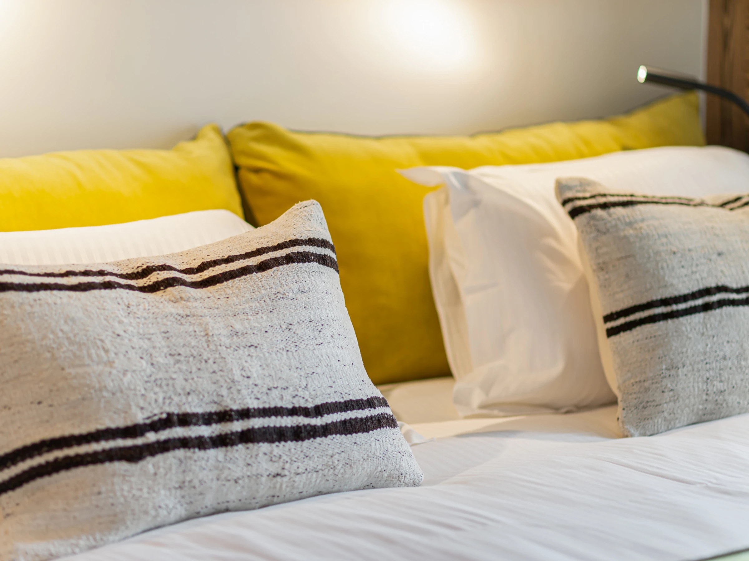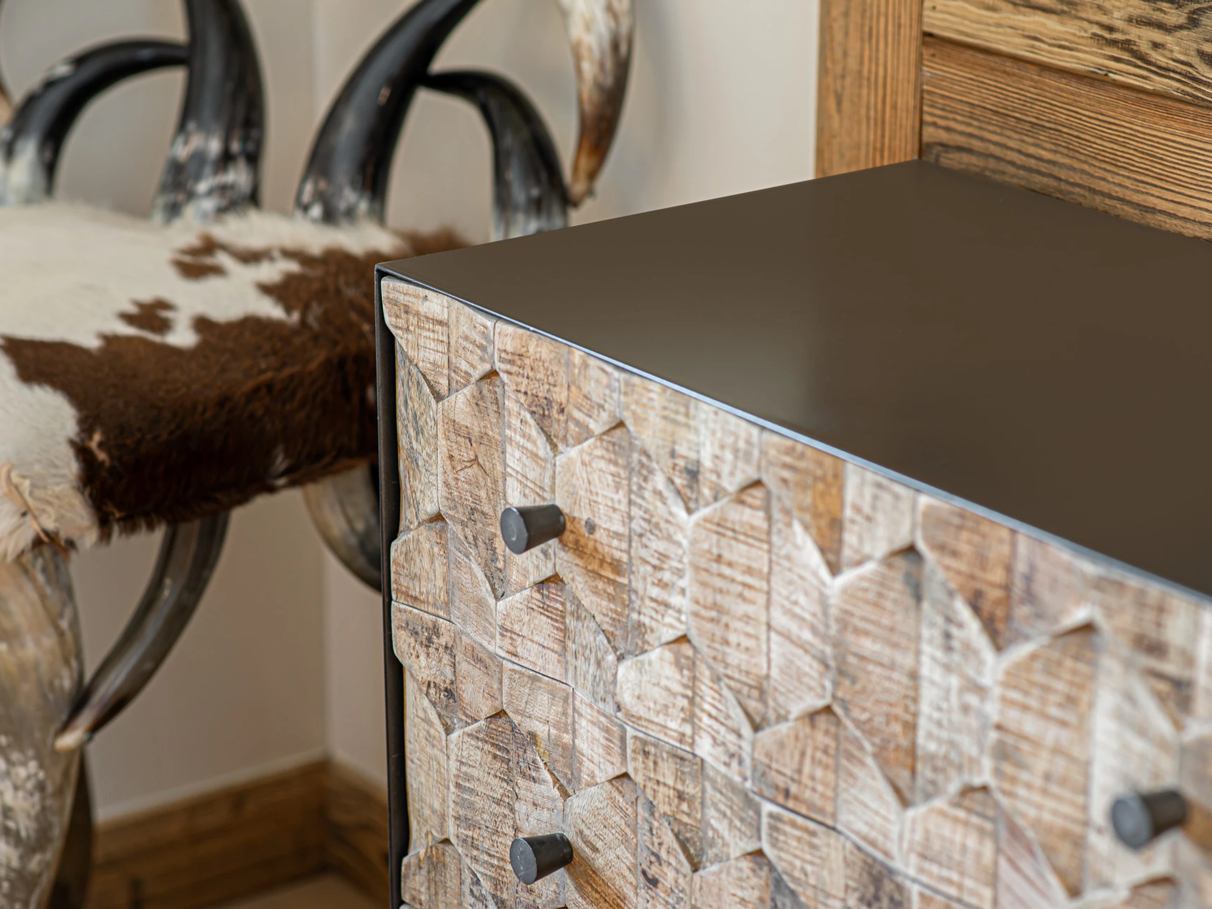 L’appartement dispose également d’une chambre suite et d’un coin montagne avec deux lits superposés. Un espace nuit à l’ambiance cosy grâce aux habillage en bois et aux textiles claires et chaleureux. Une touche cocooning qui ne manquera pas de ravir vos convives et vos enfants.