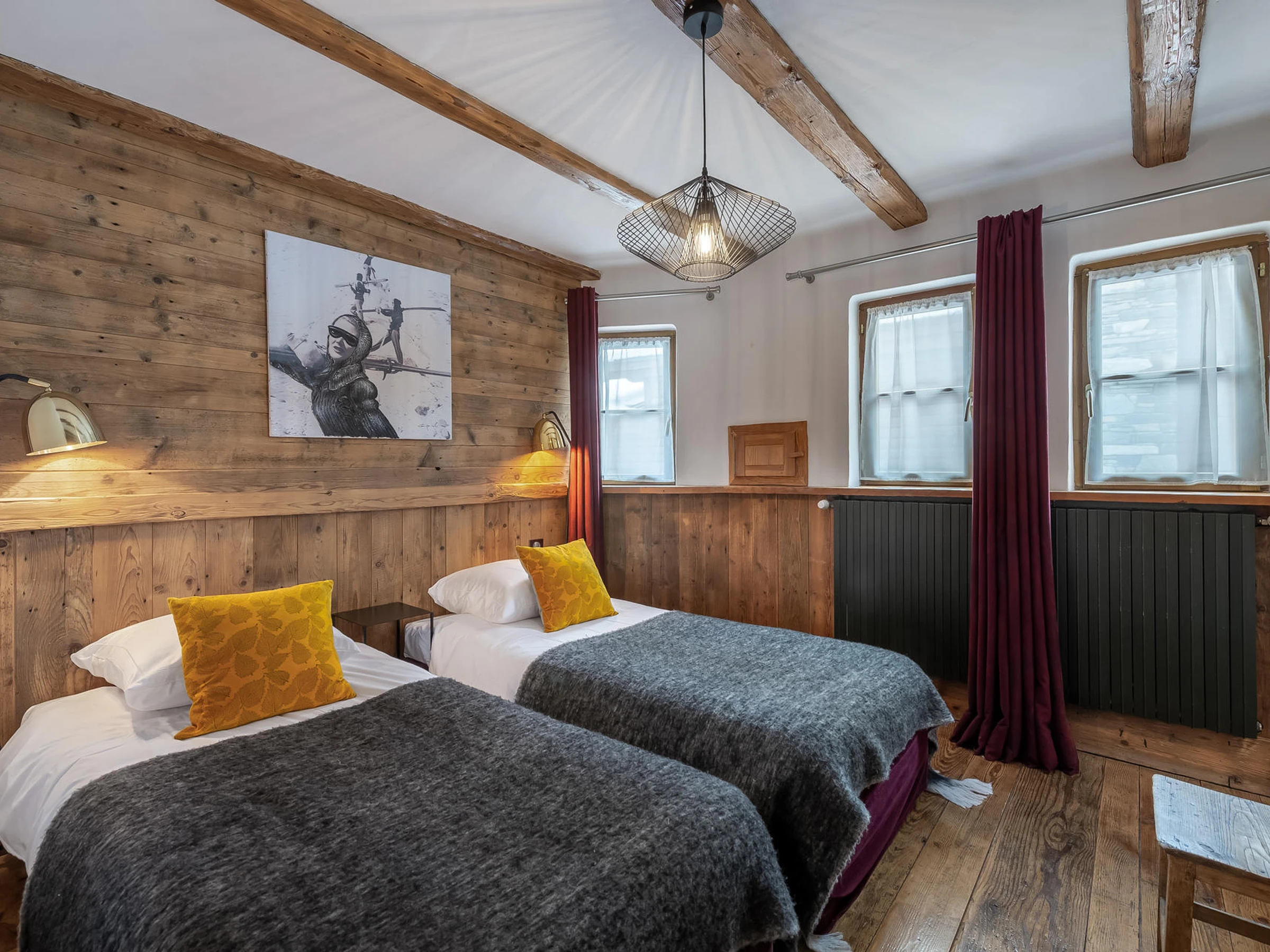 Ce chalet de prestige construit à partir de pierres et de bois naturel, jouit d’un emplacement idéal à deux pas du centre-ville, et entre 350 et 500 mètres des pistes de ski.