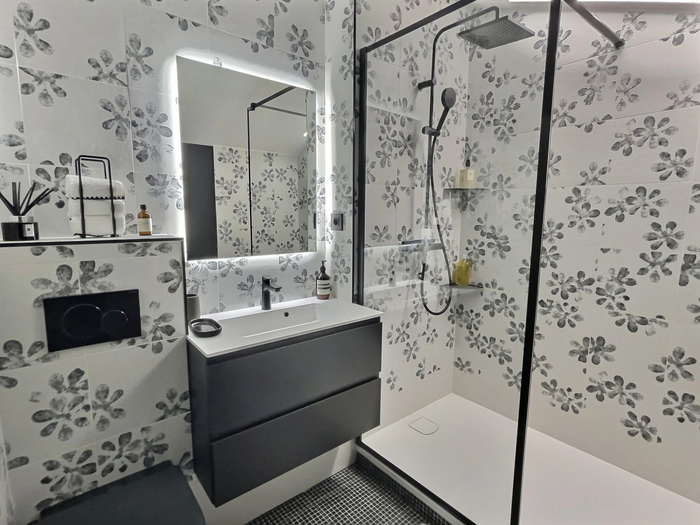 La salle de bains, équipée d'une douche à l'italienne, offre un espace de détente harmonieux, complété par des toilettes pour votre confort.